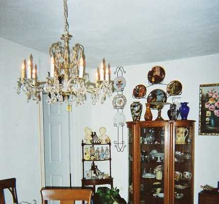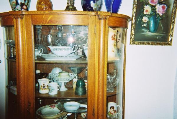 Curved glass front (half moon? Bow front?); Barrel Columns, Hand carved, Paw feet, only 1 of 3 panels replaced with plexi-glass. On antique castor wheels; see matching dining table set ad which also shows feet of china cabinet.