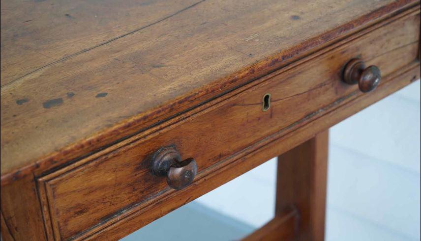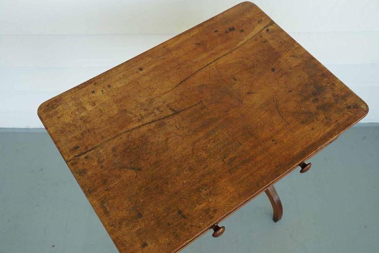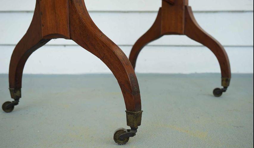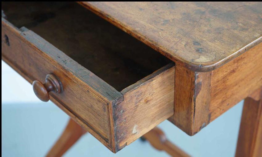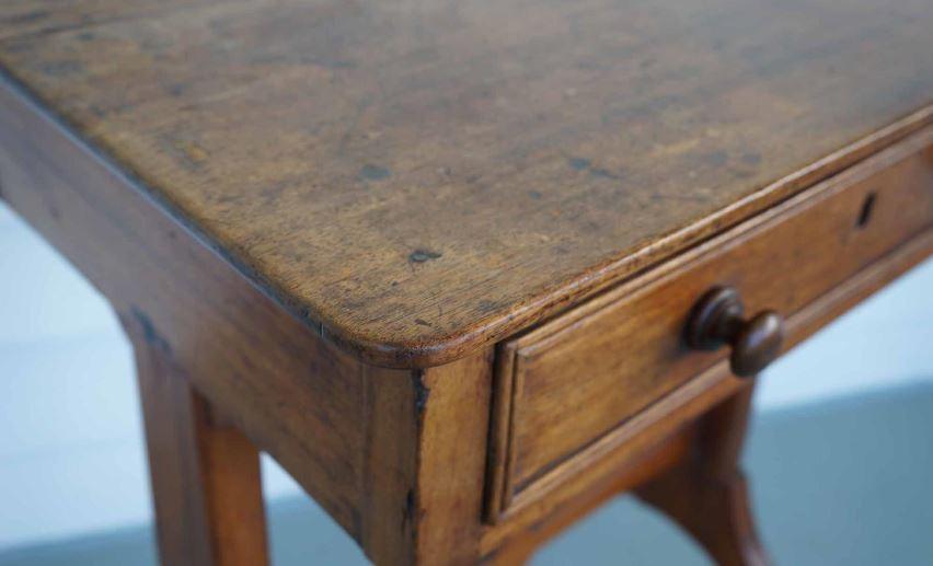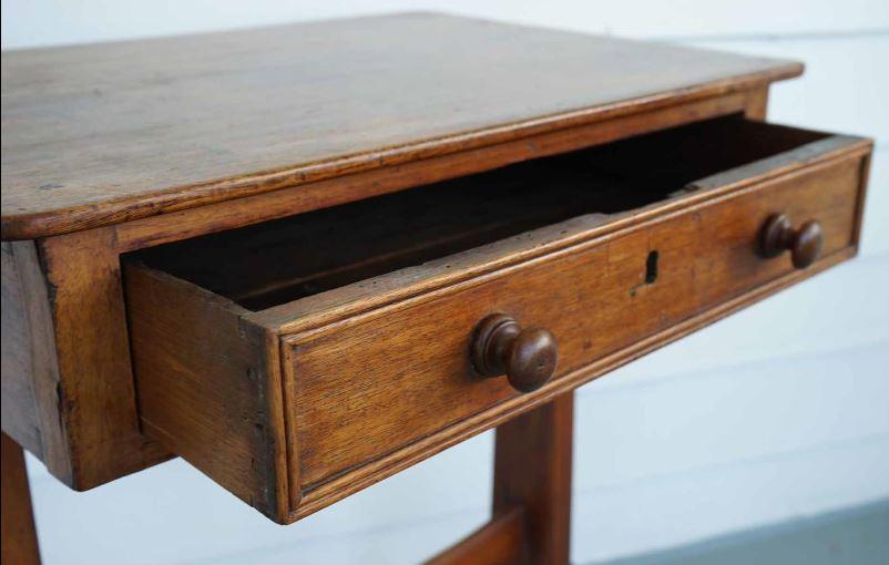 Auction description: Mid to late 1800's American hand made table with single drawer. The legs on this piece are quite unique and the style is typically found on candle tables, not larger pieces. Solid wood construction including hand cut dovetails. Measures 22" wide x 15.75" deep x 29" tall
