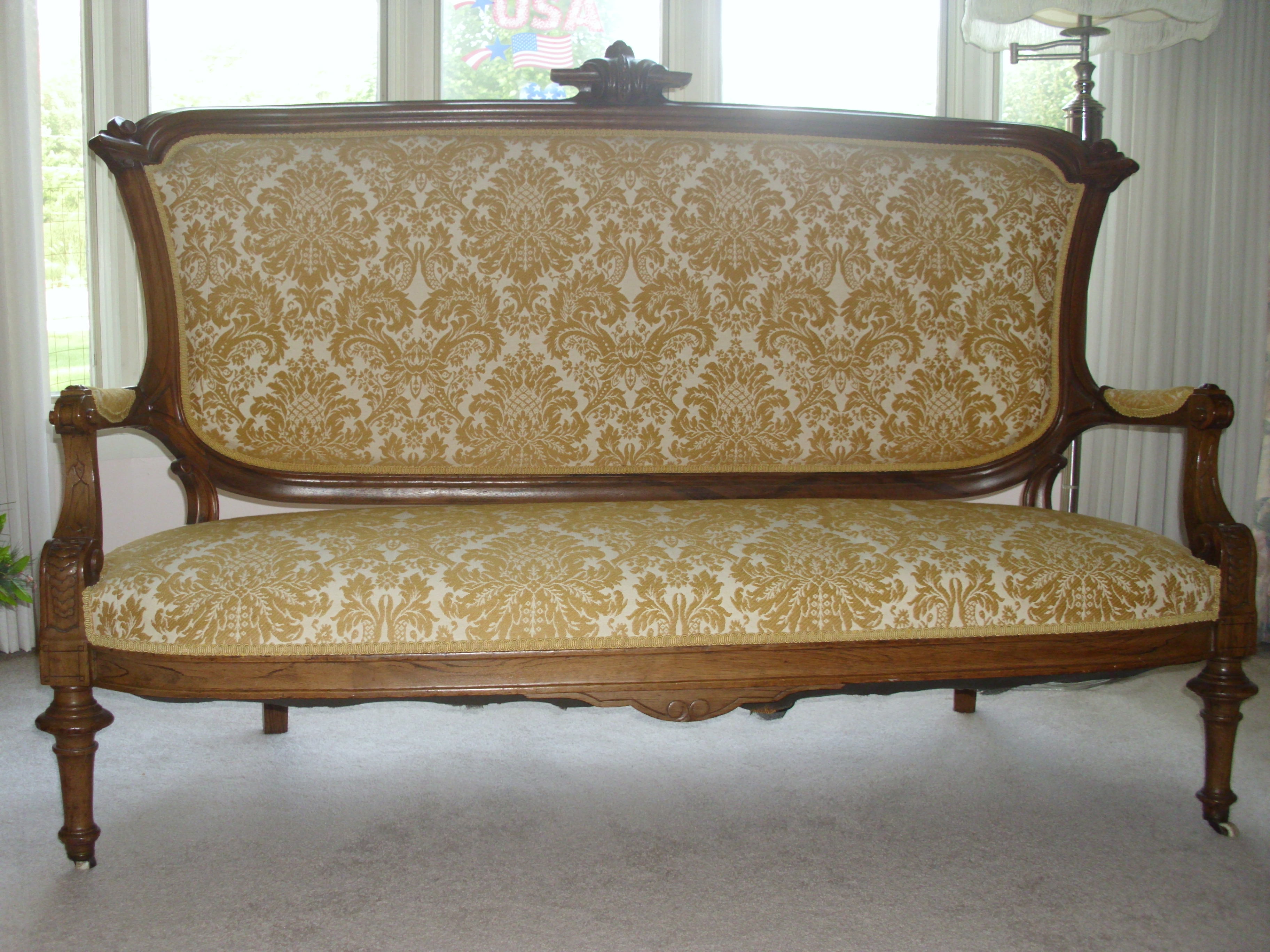 I purchased this Settee from a reputable antiques dealer in the early 1990's and I was told it was American from the 1880's or 90's. It appears to have a the original porecelain casters.  I think it is walnut. The fabric is not original.  How much is it worth and what could I expect to get for it?  I wan to sell it.