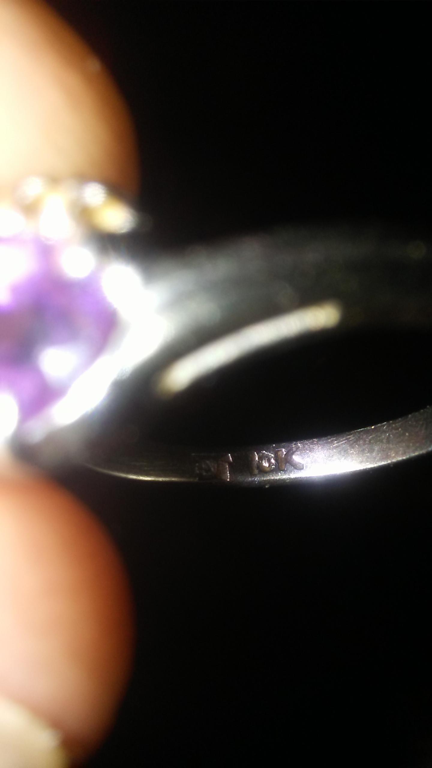 10k indicates that the piece is 41.66% white gold, not platinum. The colour and cut of the diamonds and amethysts are poor, as is the craftsmanship of the band.