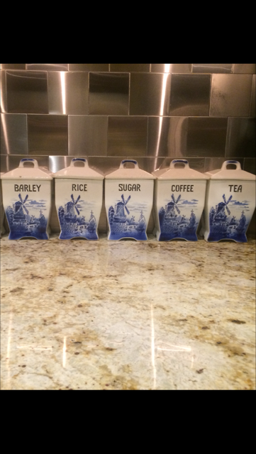 Five Canisters with lids. Amstel German works. Circa 1920's. Mfg. logo etched on bottom of each. All are in excellent condition A sixth canister labled "Oatmeal" is included but should be regarded as a "no cost" item...it has a small crack and chip in the front. And the lid was broken...has been repaired and is functional in that it will stay in place but is not complete because there is small trianguar piece 1/2"x1/2"x1/2" missing.