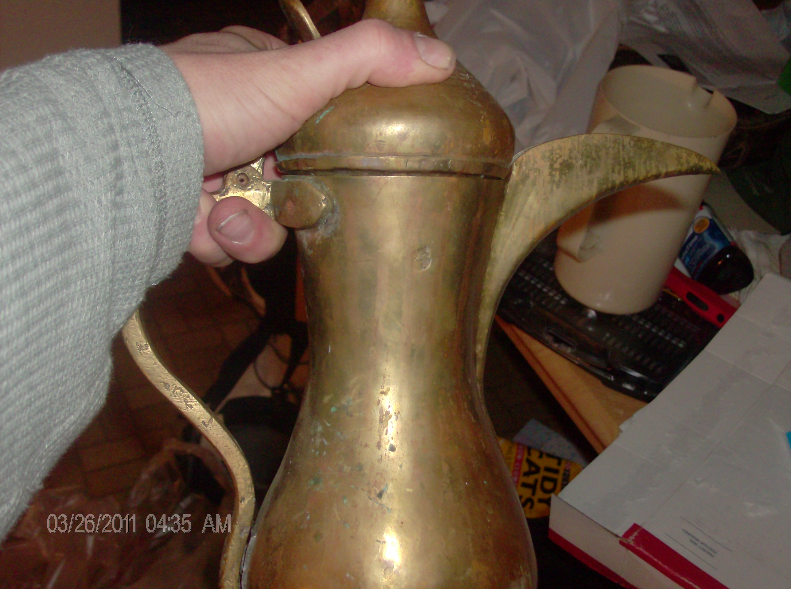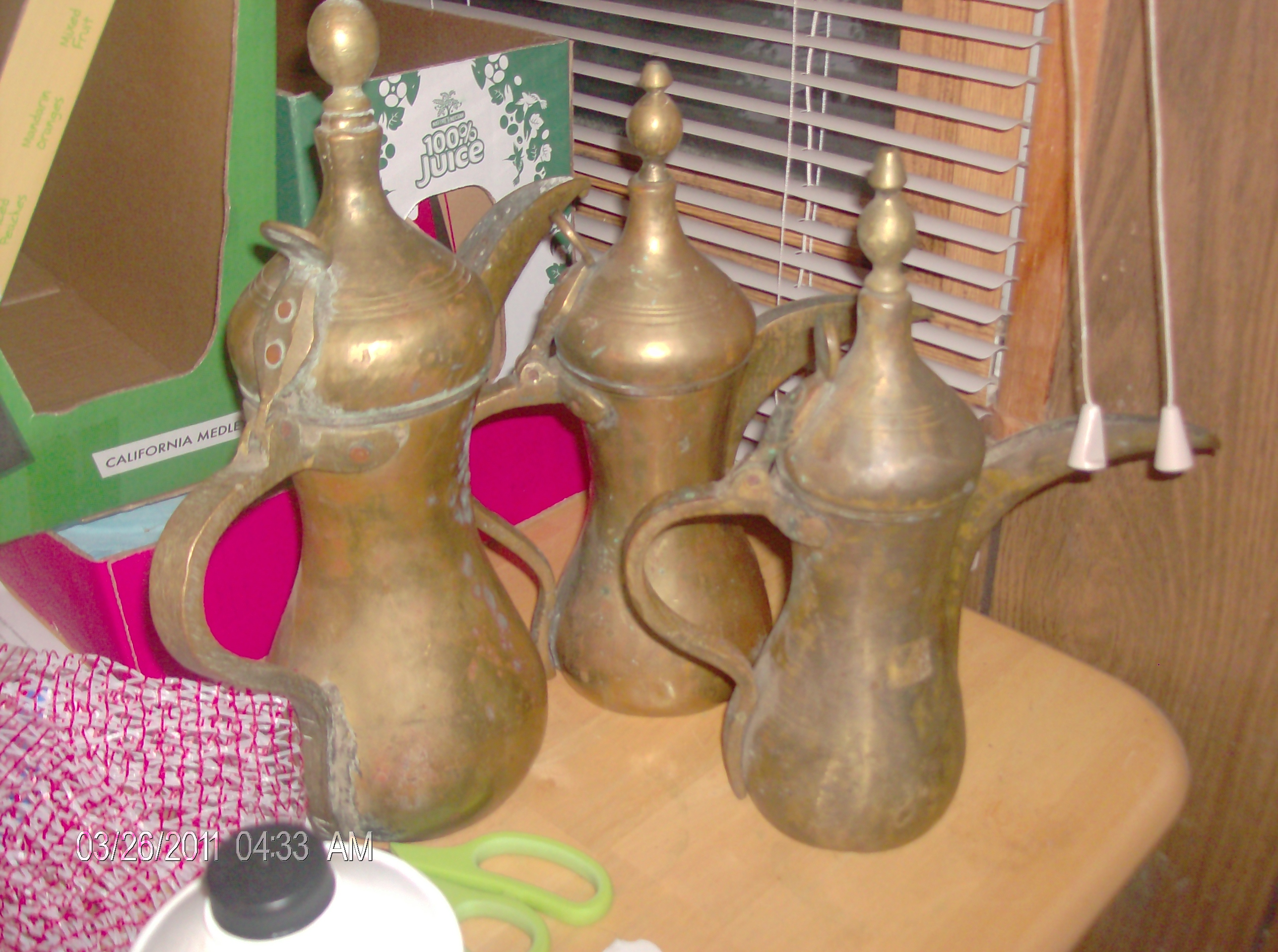 3 brass pitchers, age unknown but I was told their very old. Large, medium and small. All are hand wrought, with tooling marks evident. lids are fastned with rolled copper. Each have what I believe is an arabic, or some other middle east symbol.