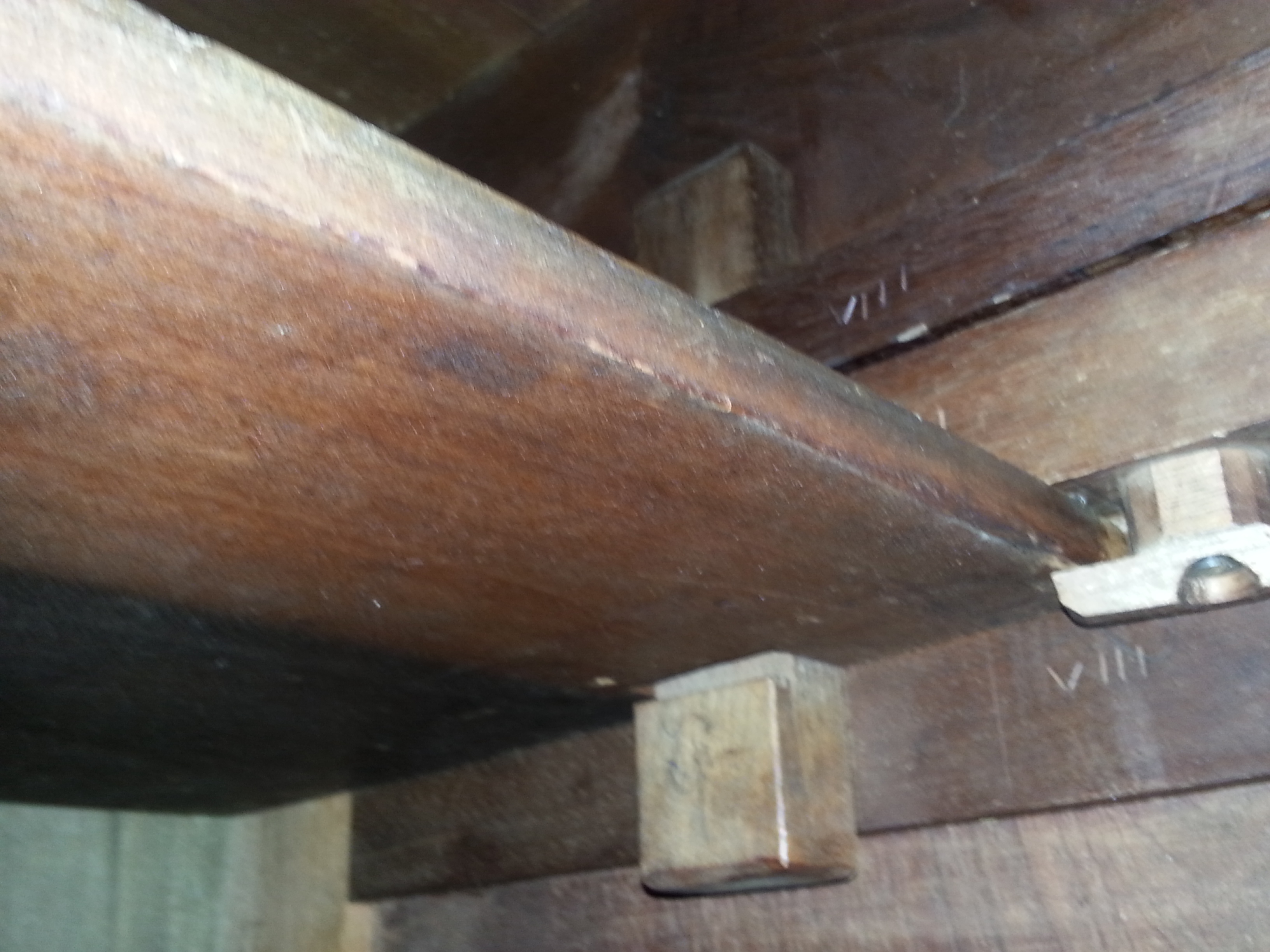 It has several sections that fit together like a puzzle, no nails. Inside, "VIII" is carved twice.