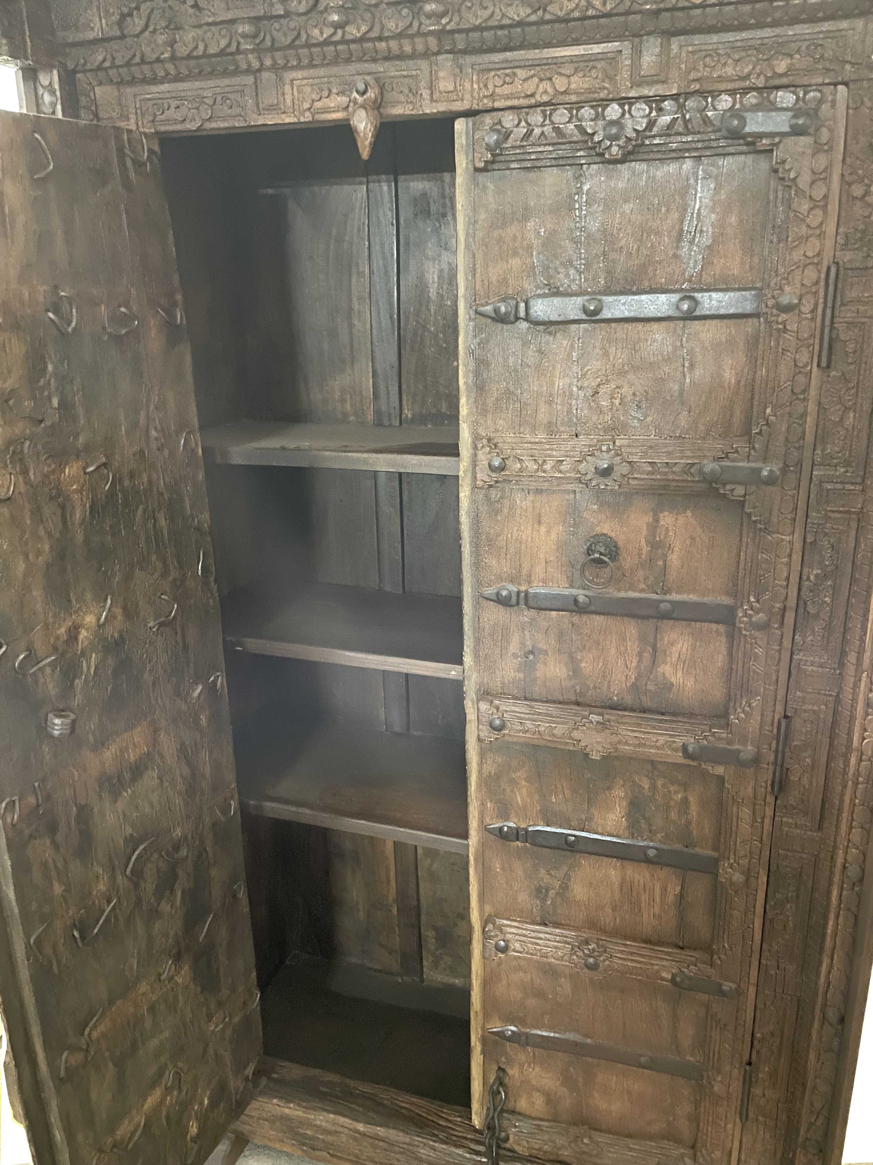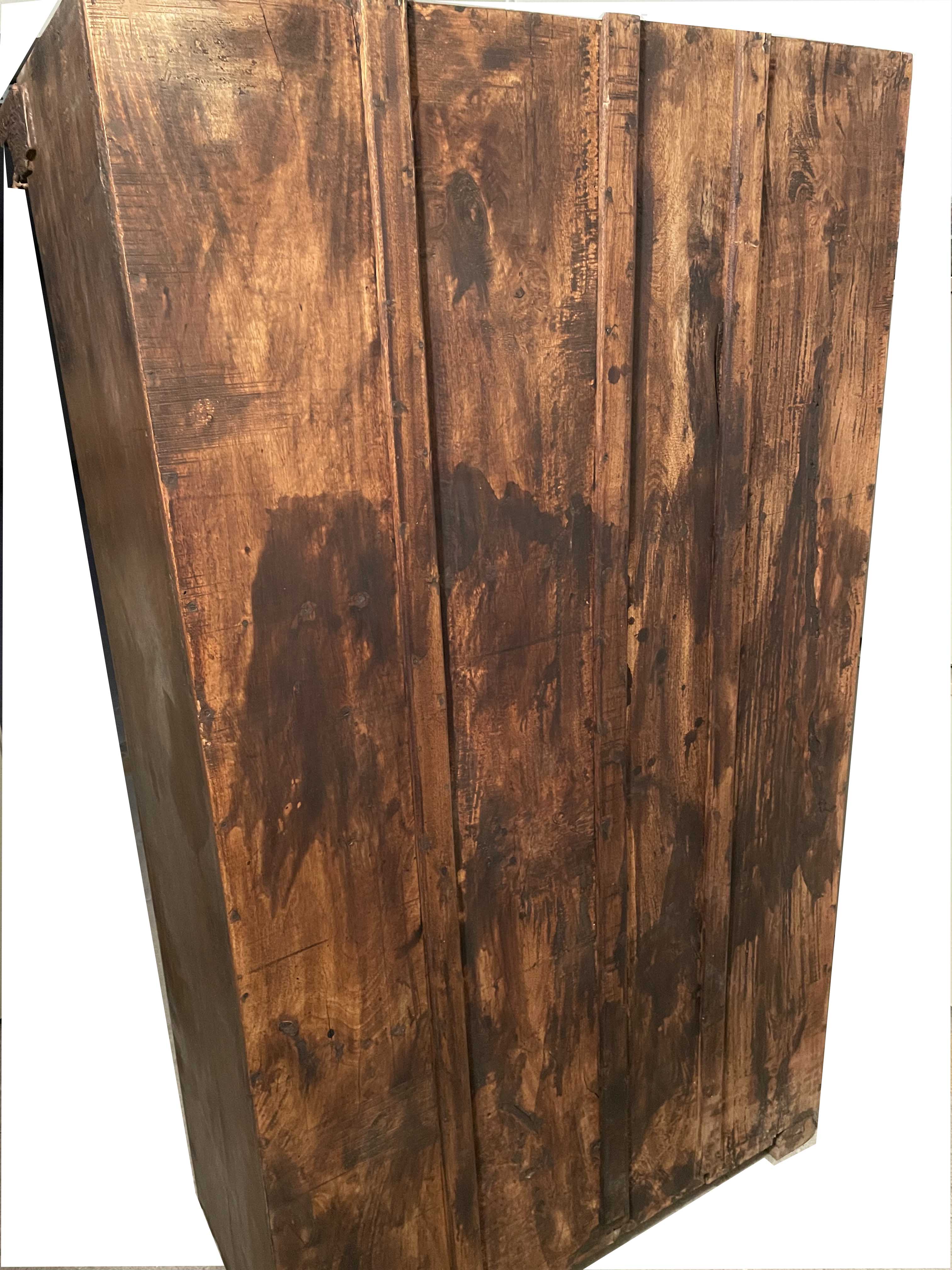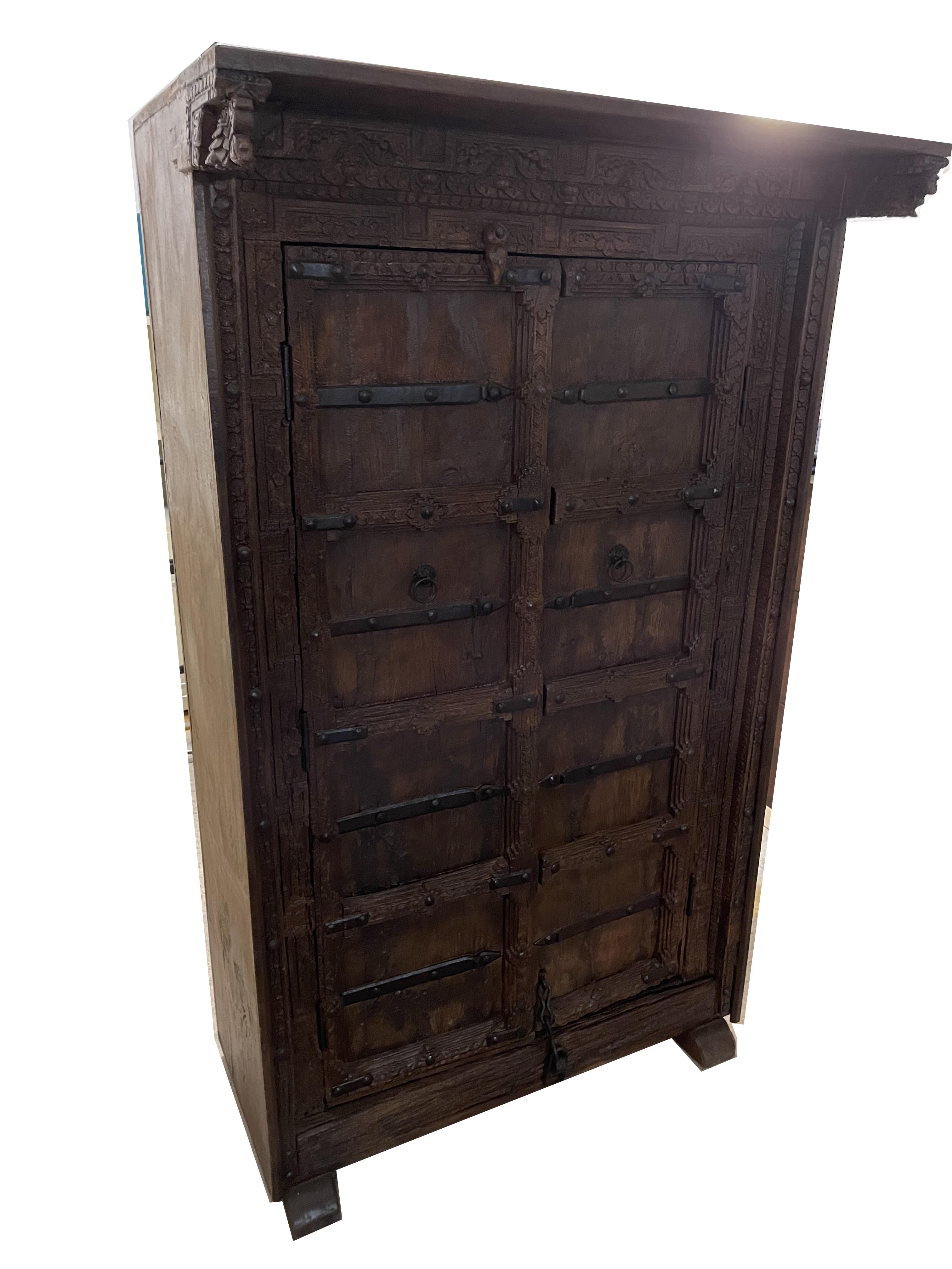 19th Century Wardrobe/Armoire. Hand-crafted from solid oak with wood curving and steel details. Doors are hung with outboard steel barrel hinges so they open wide for easy access to the interior. Very good overall with age appropriate wear including wood splits and overall surface wear.