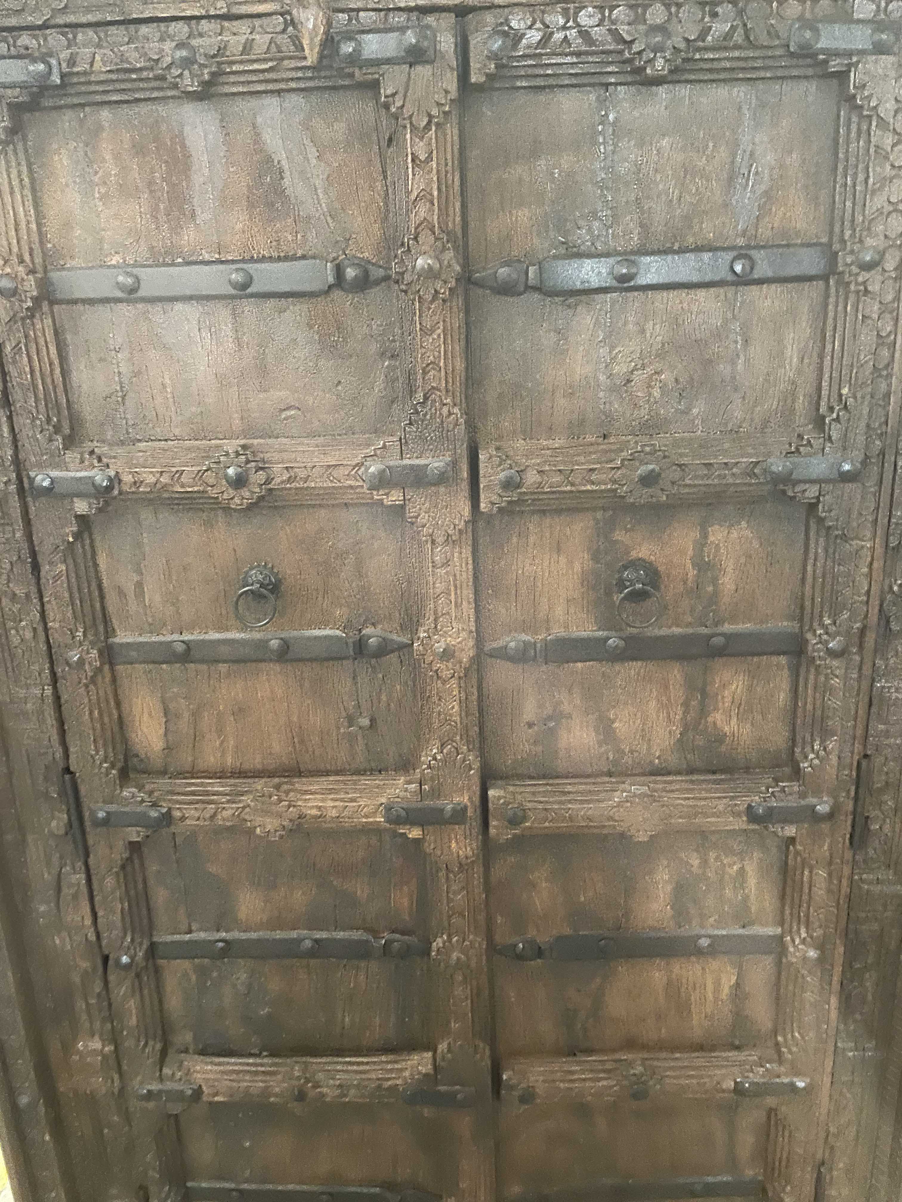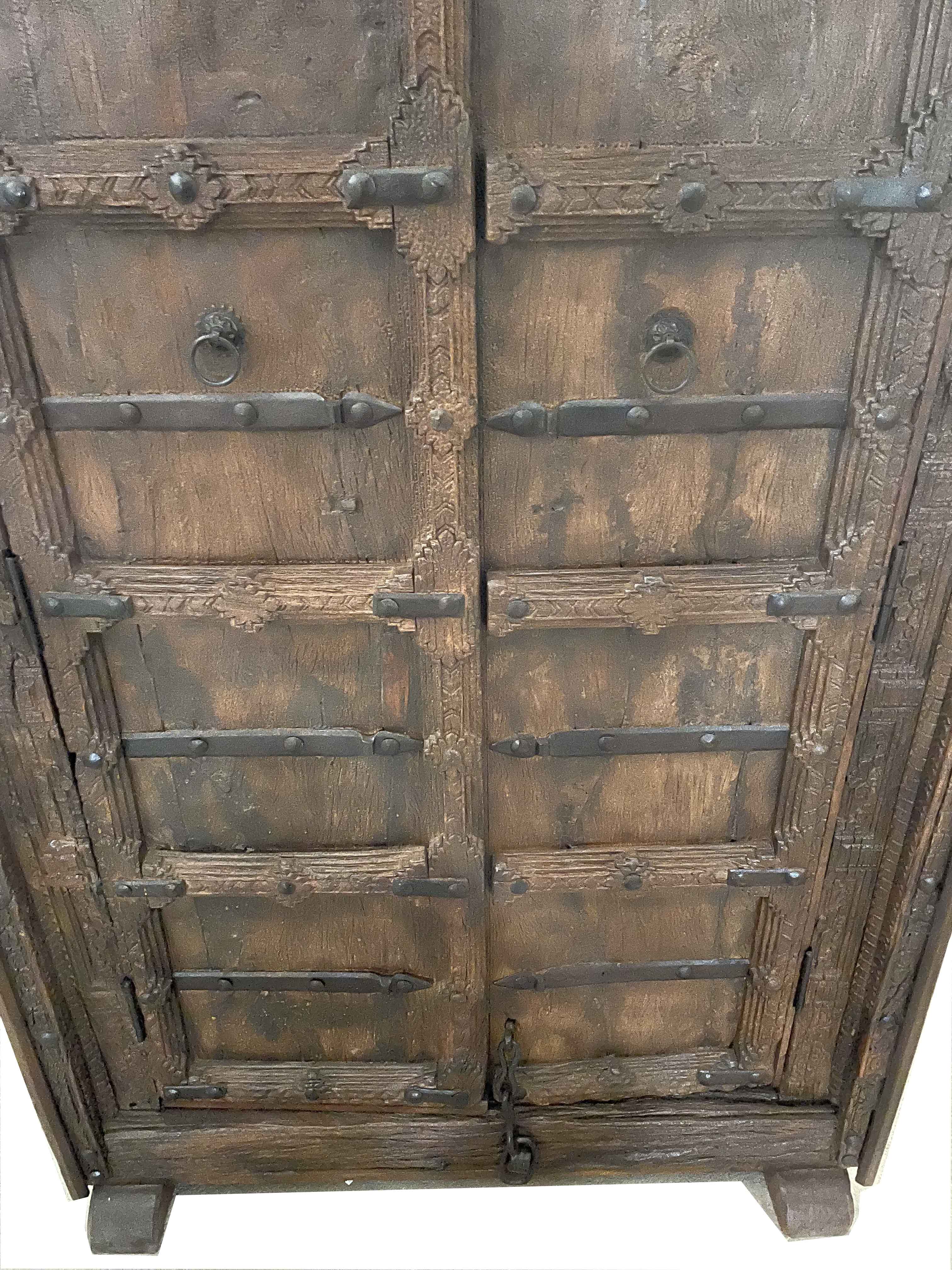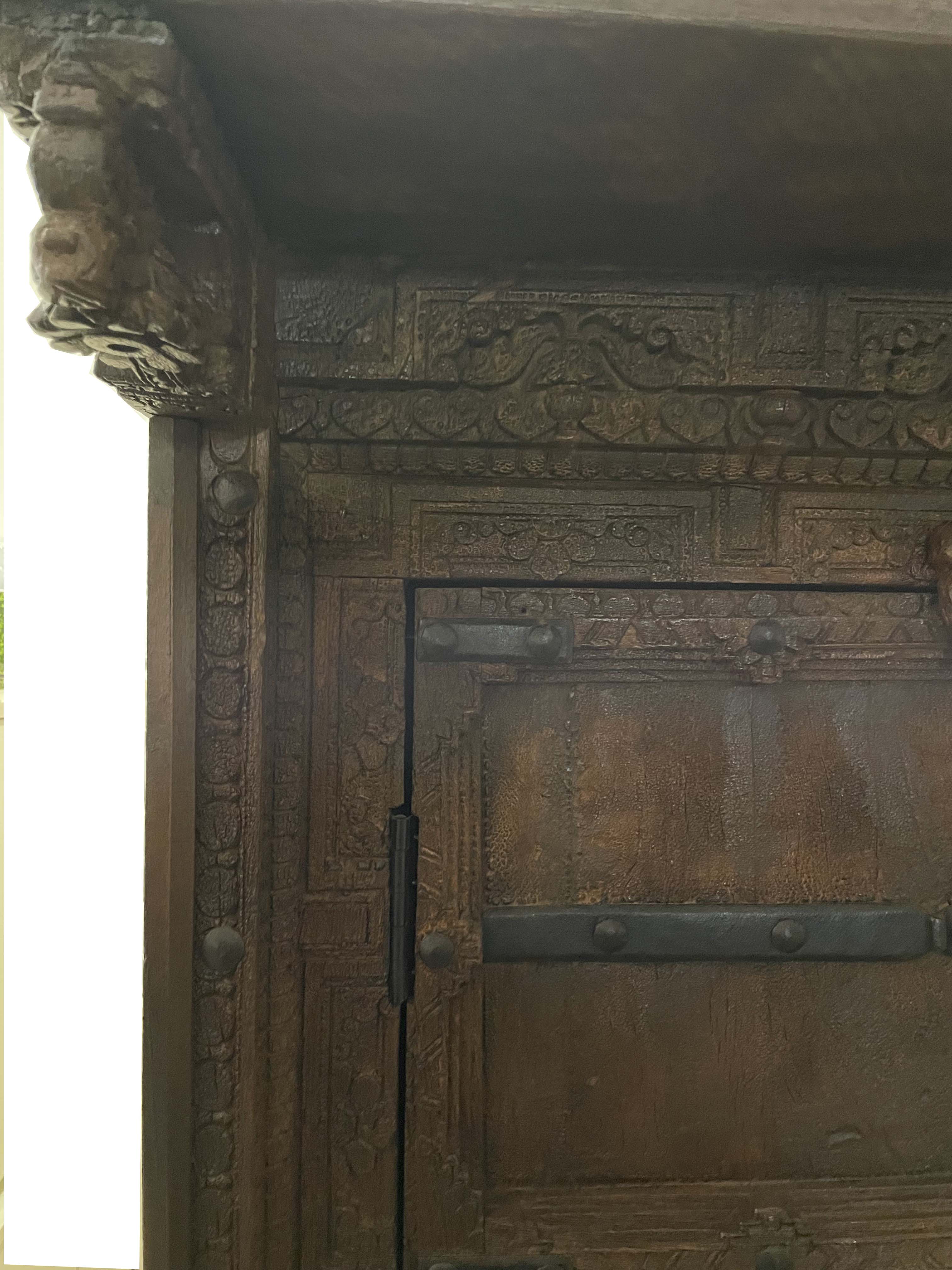 19th Century Wardrobe/Armoire. Hand-crafted from solid oak with wood curving and steel details. Doors are hung with outboard steel barrel hinges so they open wide for easy access to the interior. Very good overall with age appropriate wear including wood splits and overall surface wear.