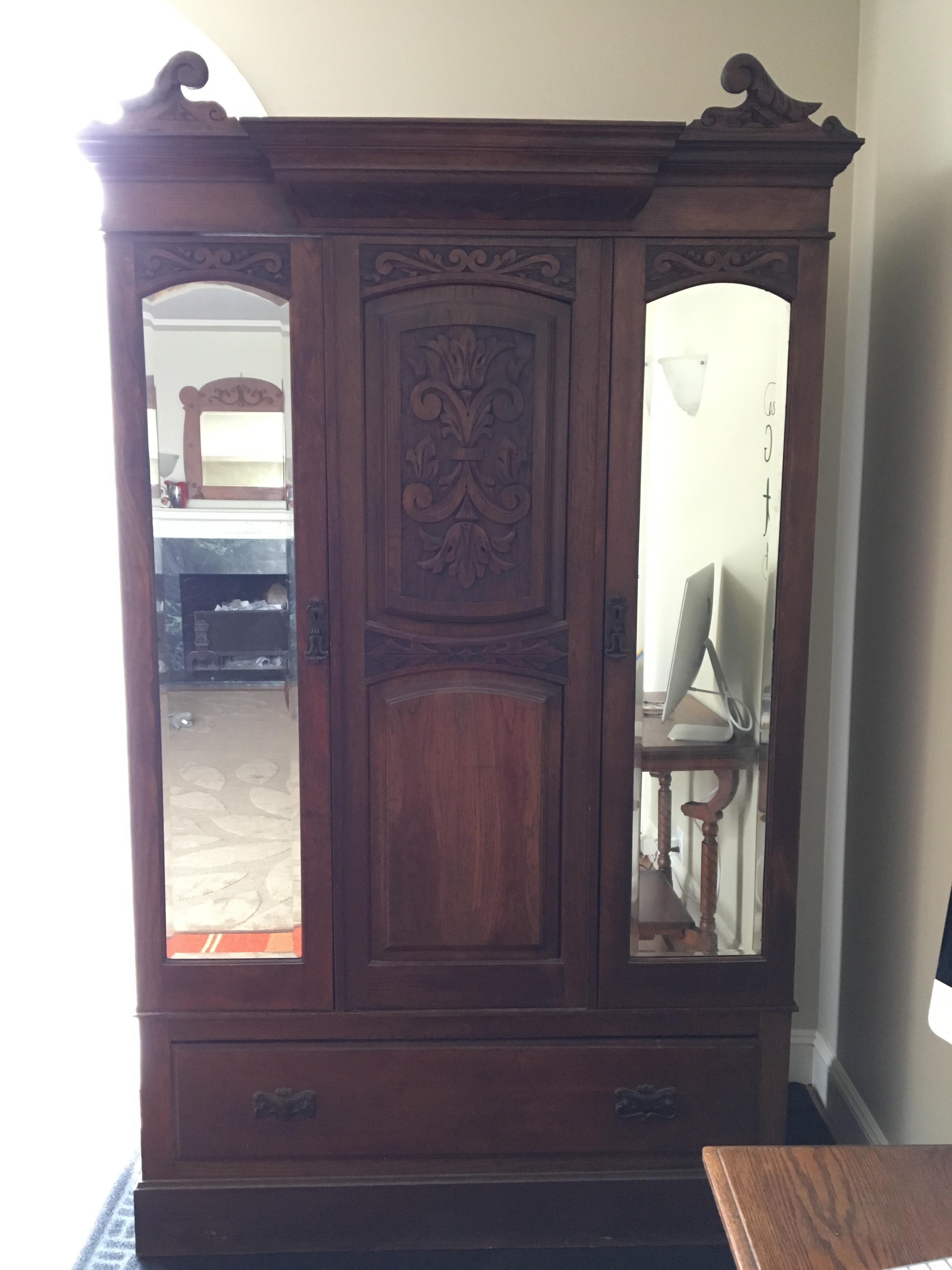 Believed to be an antique European armoire or wardrobe with 2 mirrored doors and a single drawer below. Ornate detail and carving.