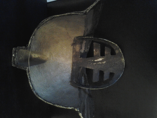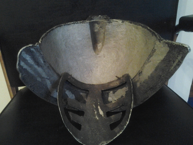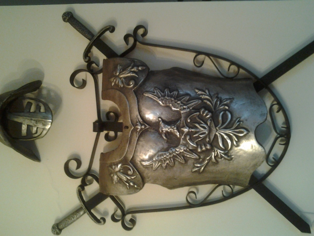 Antique Amor breast shield wall mount, with 2 swords and mask . Mid eval roman type of sheild.