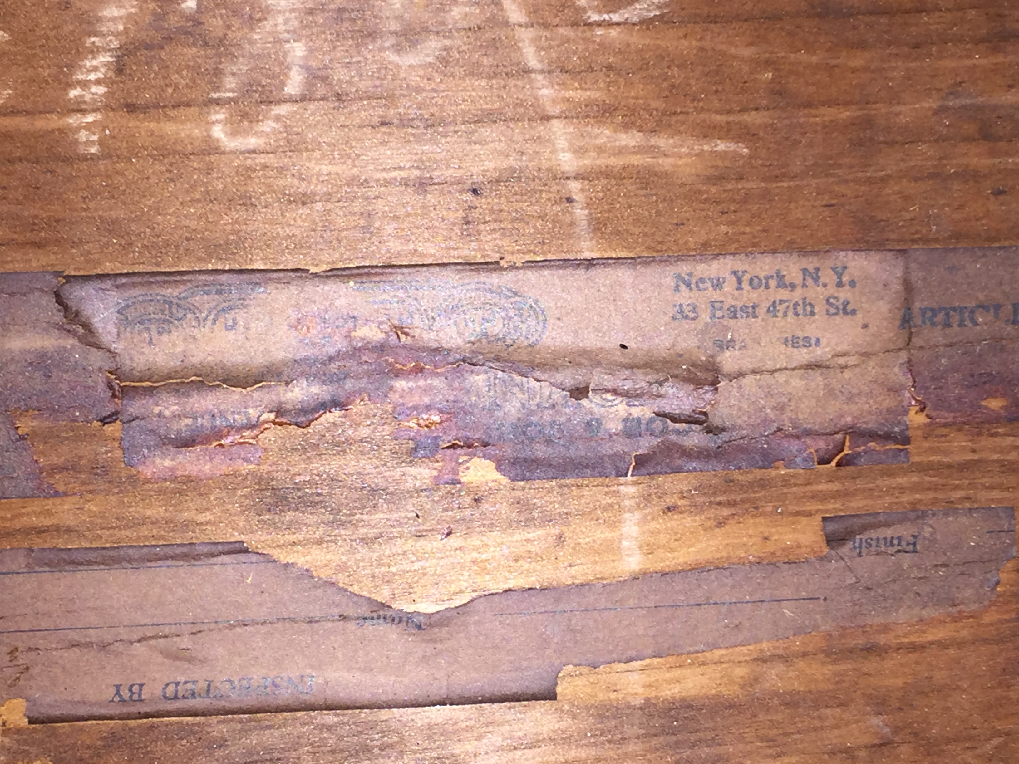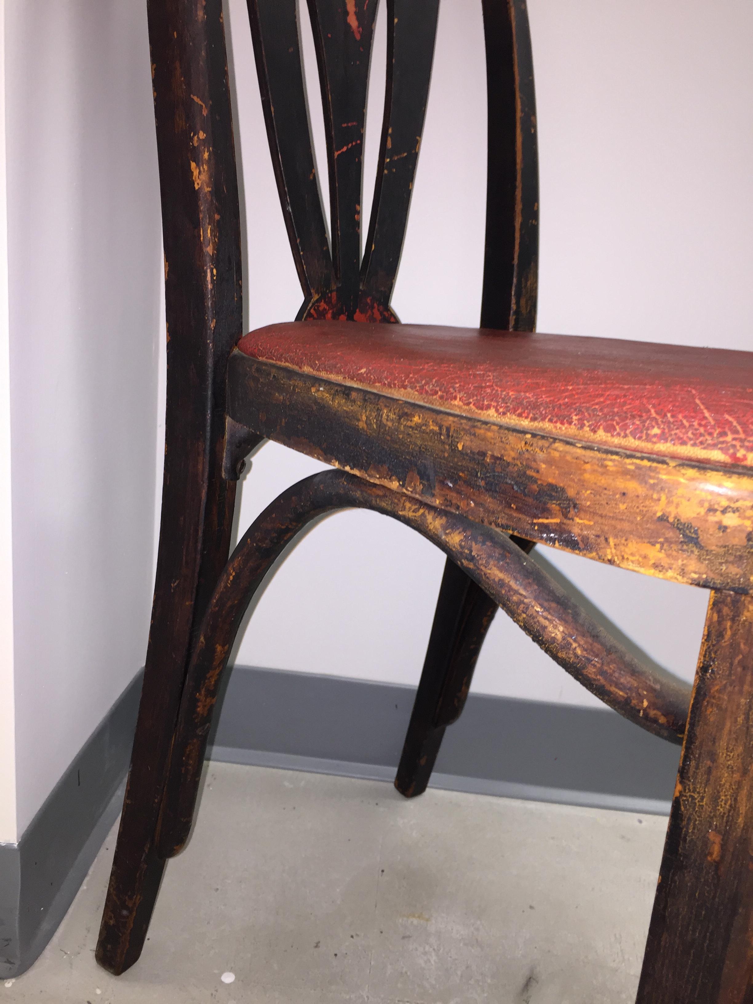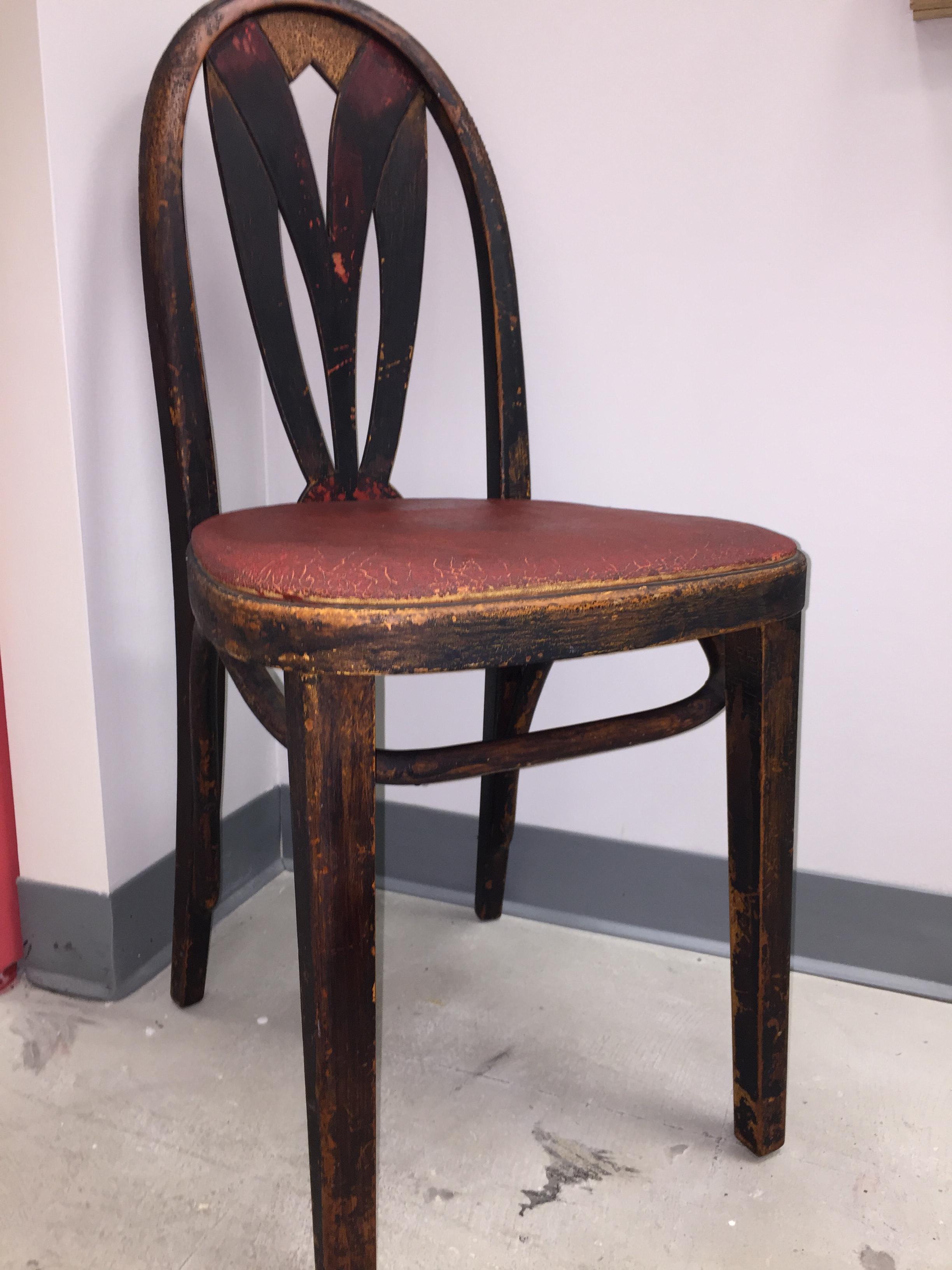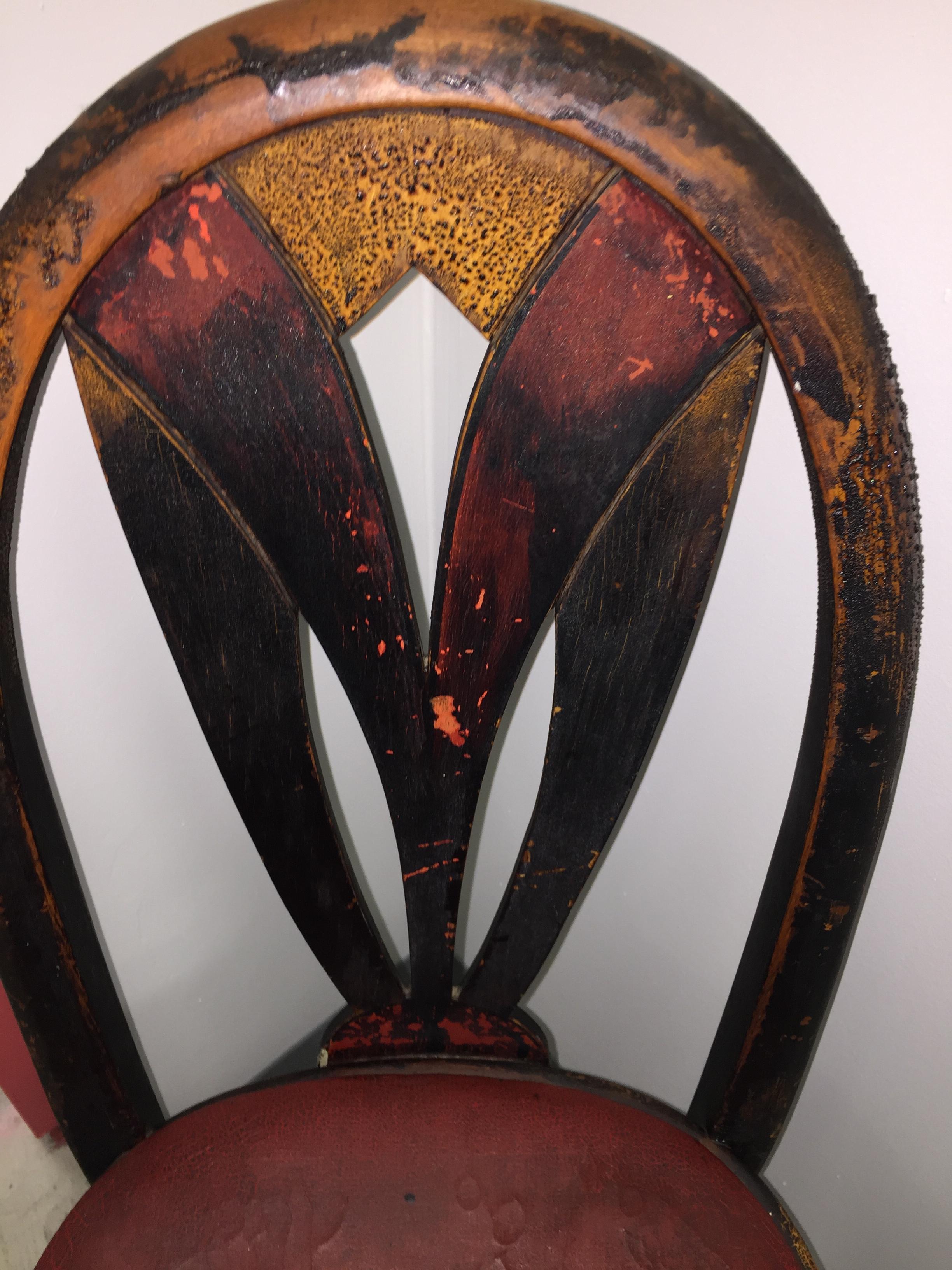 I found this chair that I believe is from early 1900's.  It has beautiful yellow and red colors. It has a leather seat that looks to be red.  The chair is in good condition.  The bottom has a torn tag on it.  I can read