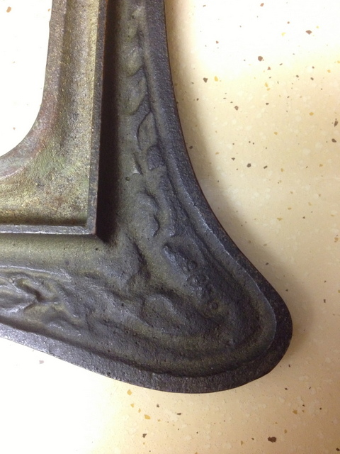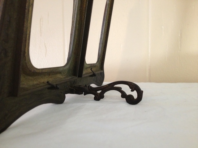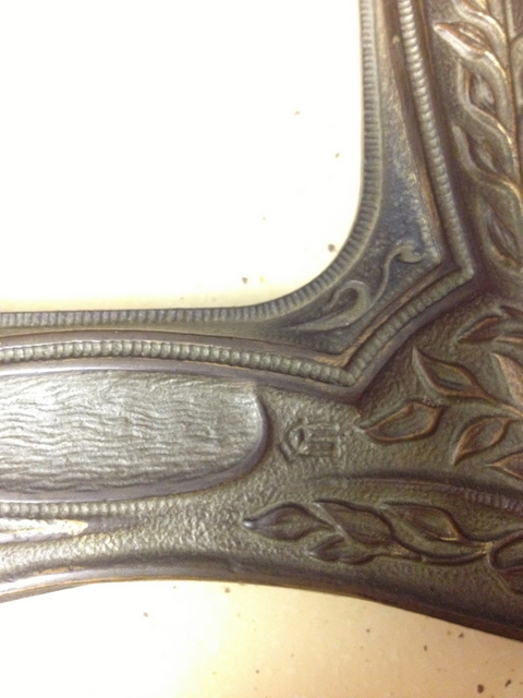 The back of the frame features a folding easel stand. In the metal itself you can see the words "Louisiana Purchase" in reverse. There are other markings as well, including the number "603" (also in reverse) but I can't make them out. There is some type of signature or stamp on the front right corner of the frame near the bottom.