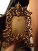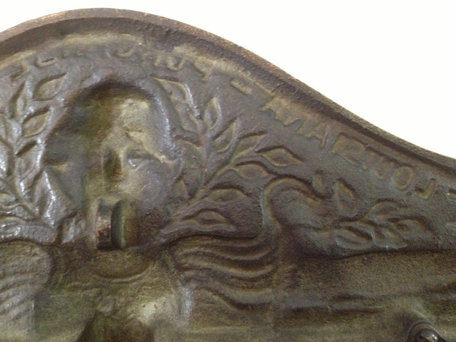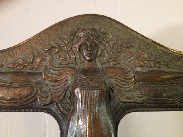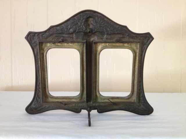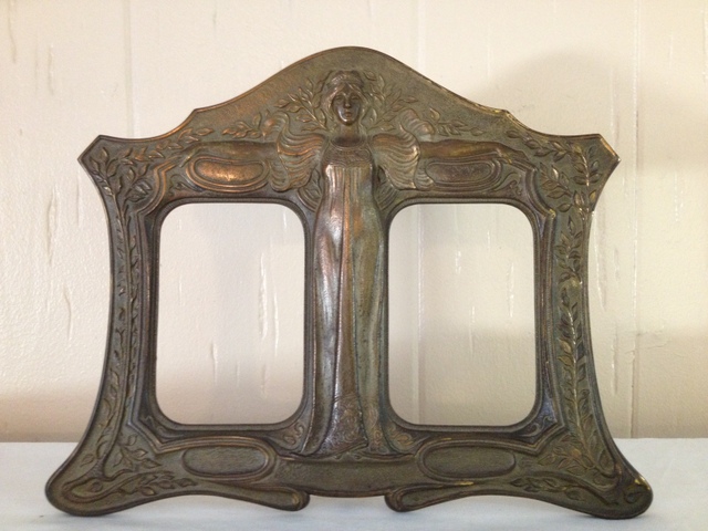 The frame is extremely heavy and made from cast metal (iron) with a beautiful brass/bronze colored finish. The focal point of the frame is the lady in the center, arms outstretched wearing a beautiful billowy sleeve, flowing dress. She has long hair with a star studded diadem. The sides of the frame are incredibly detailed as well, featuring trees, vines, and flowers.