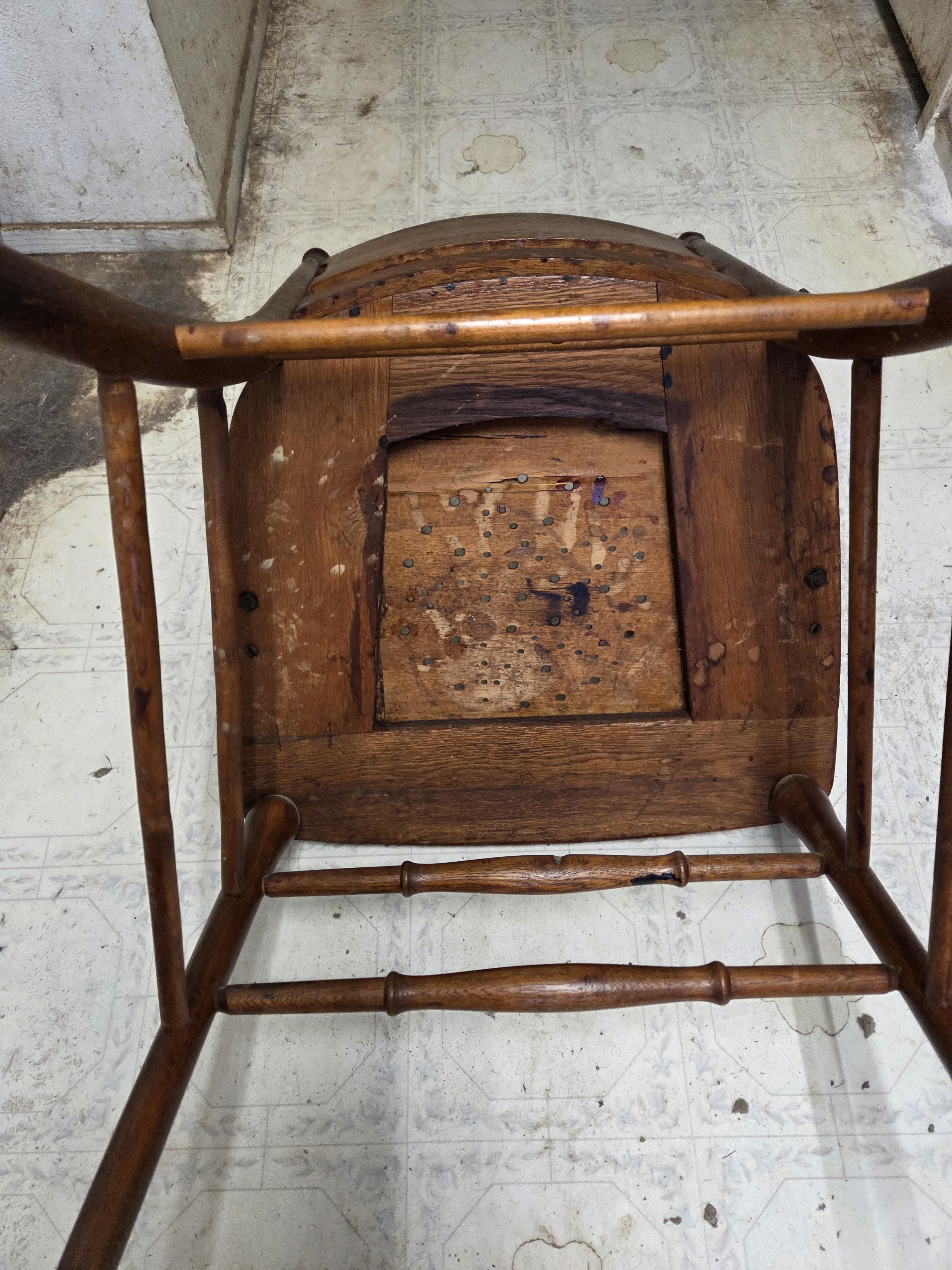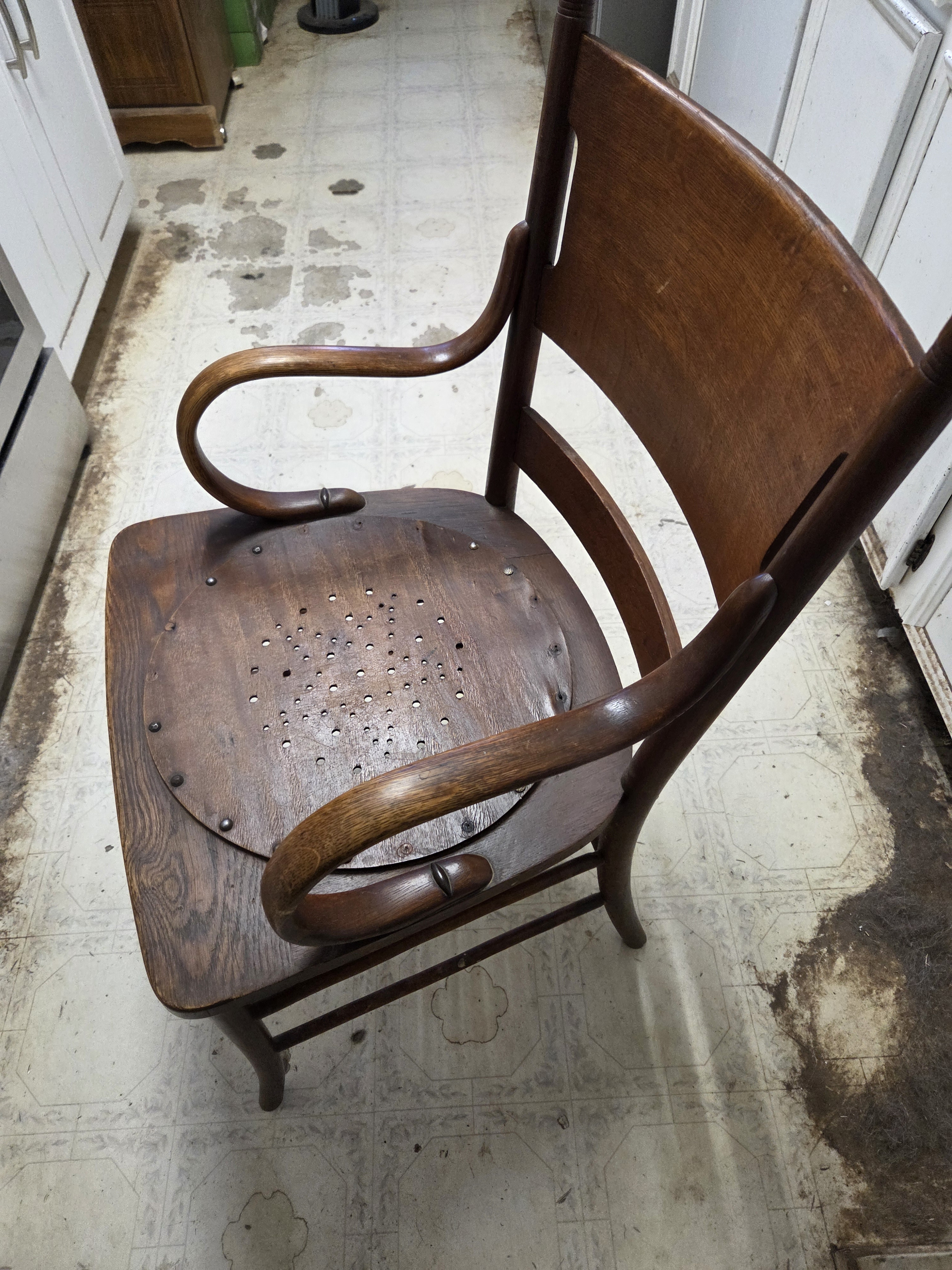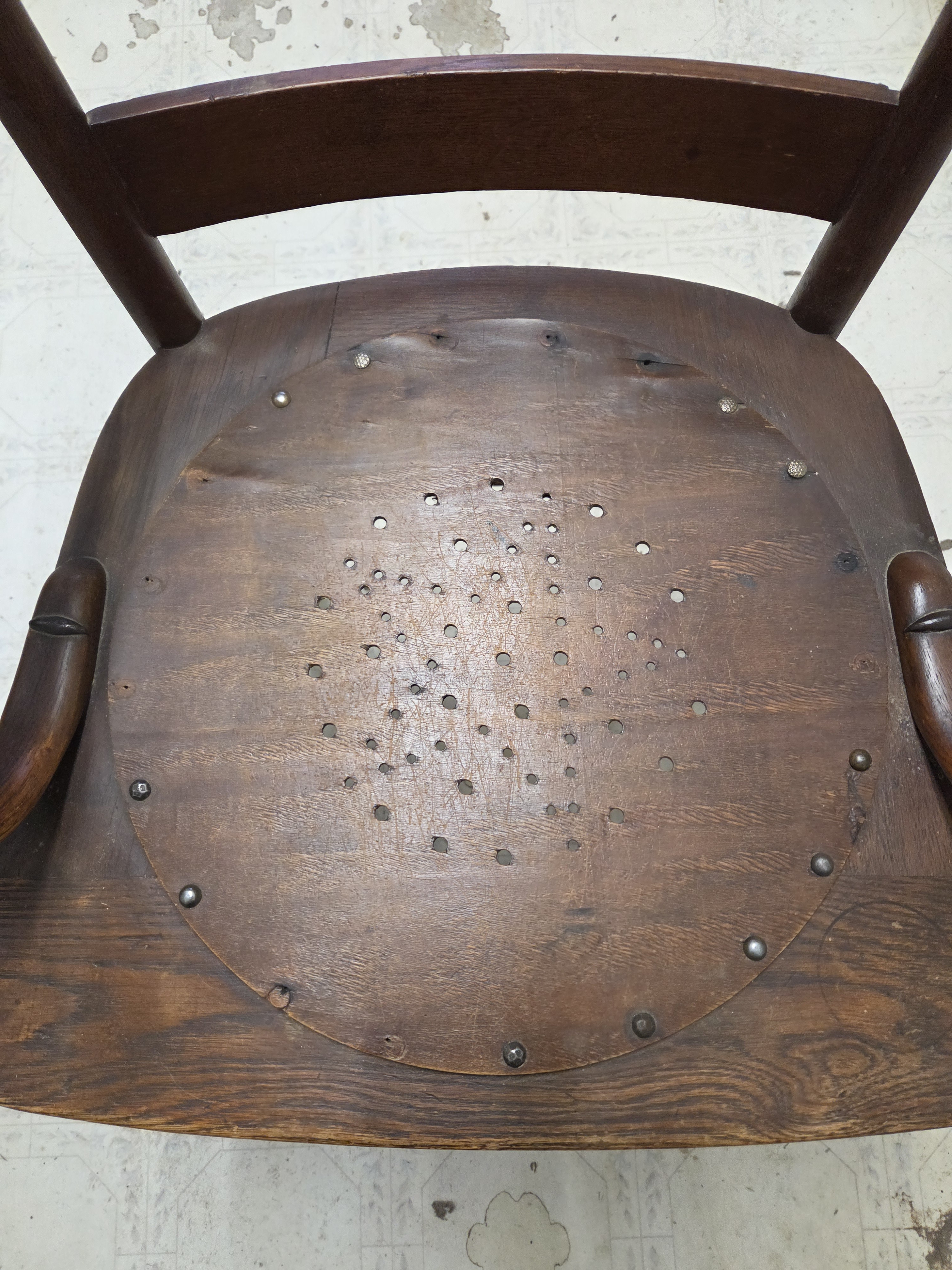 Armchair appears to be similar to William Birch for Liberty Arts & Crafts or Heywood Wakefield. Possibly purchased in Berkeley, California in the late 1890's or early 1900's. Has been in storage for at least 60 years. The chair itself appears to be in fair condition. The pierced wood circle on the seat is warped and missing tacks around the edge. This piece may be a replacement and not original.