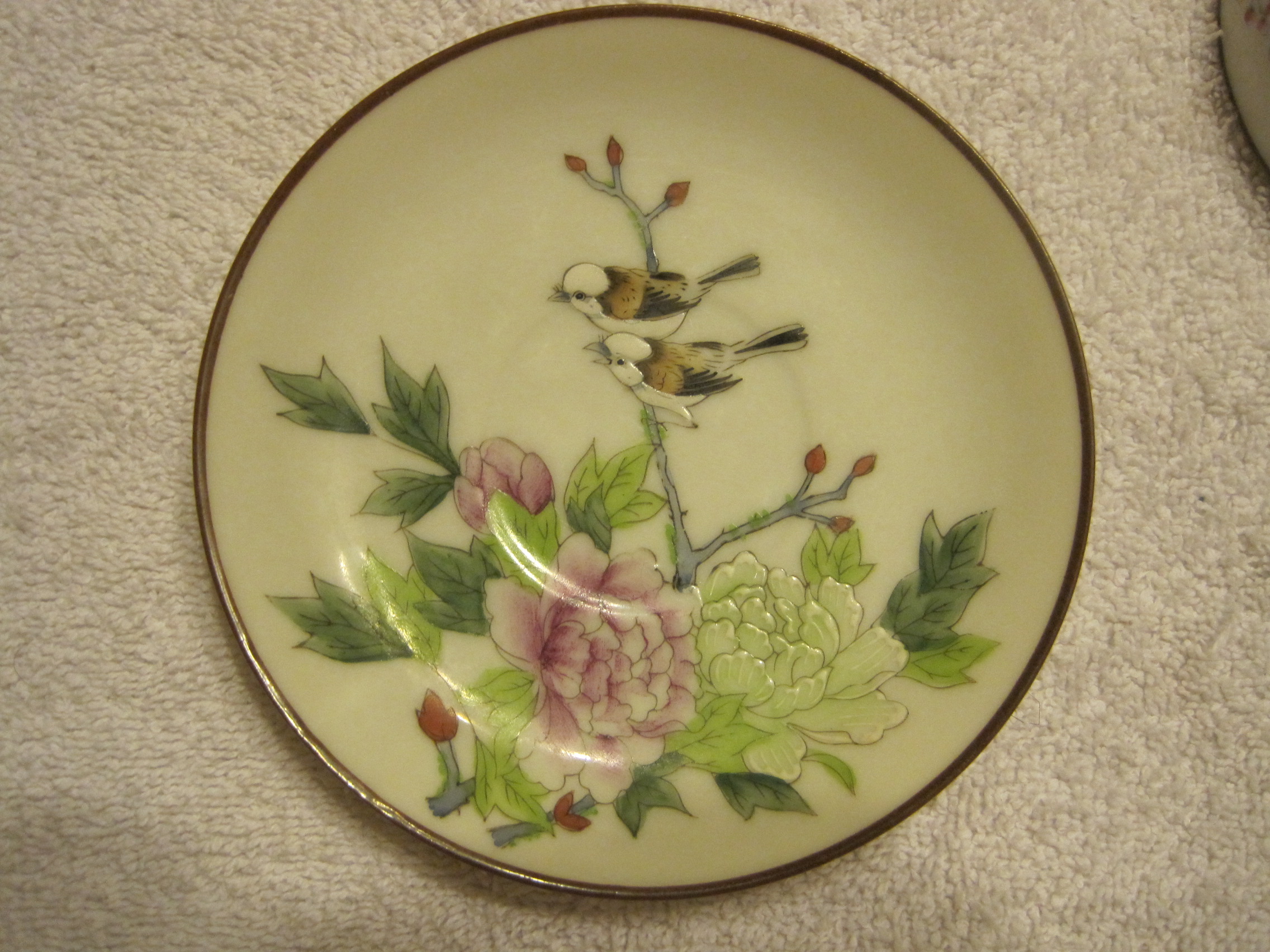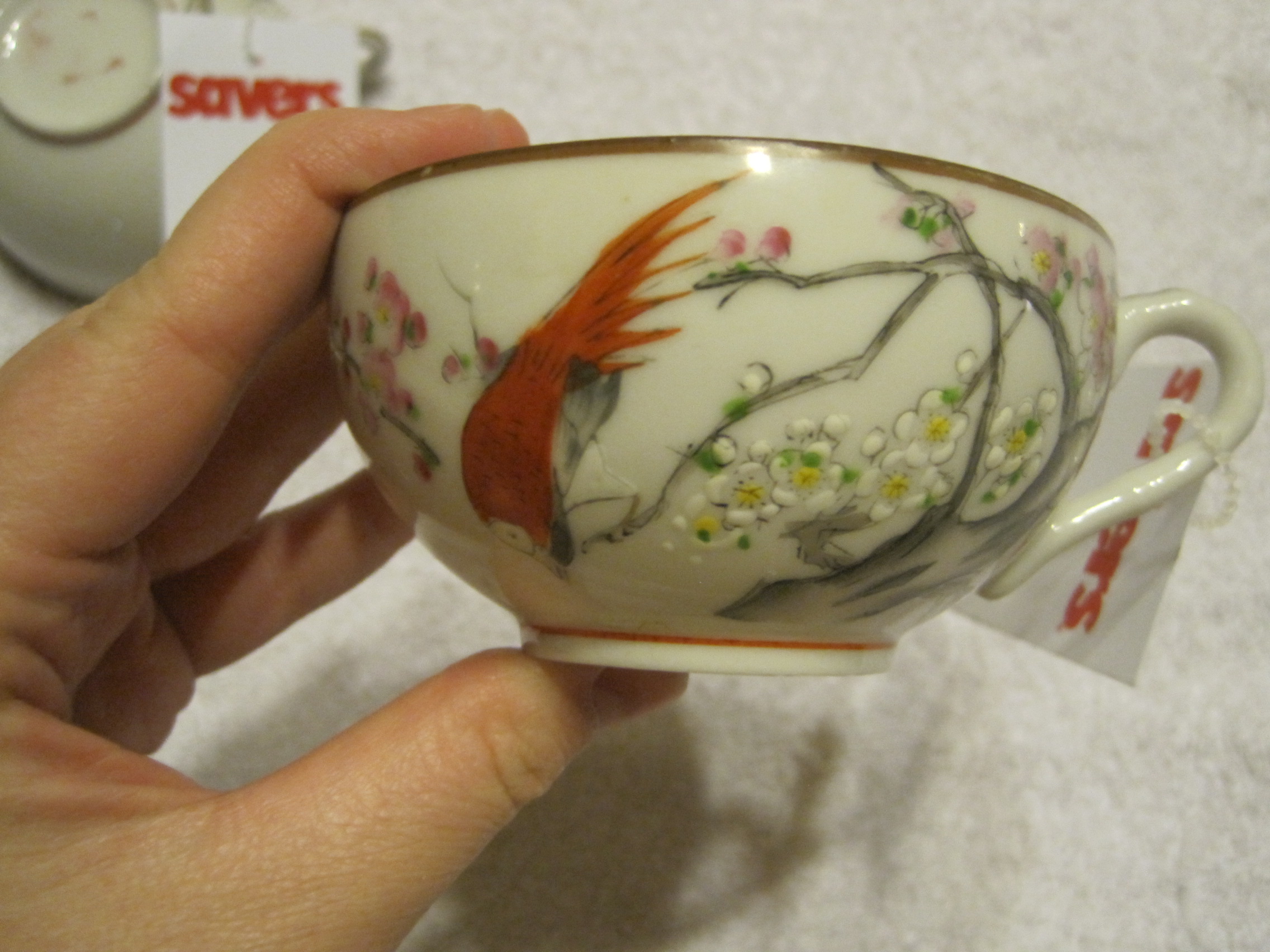 I recently acquired two teacups and one saucer. They appear to be Asian bone china. All are handpainted and are marked Reg.No.91 on the back. They also have maker's markings that I cannot identify. I would love to know when they were produced as well as their value.