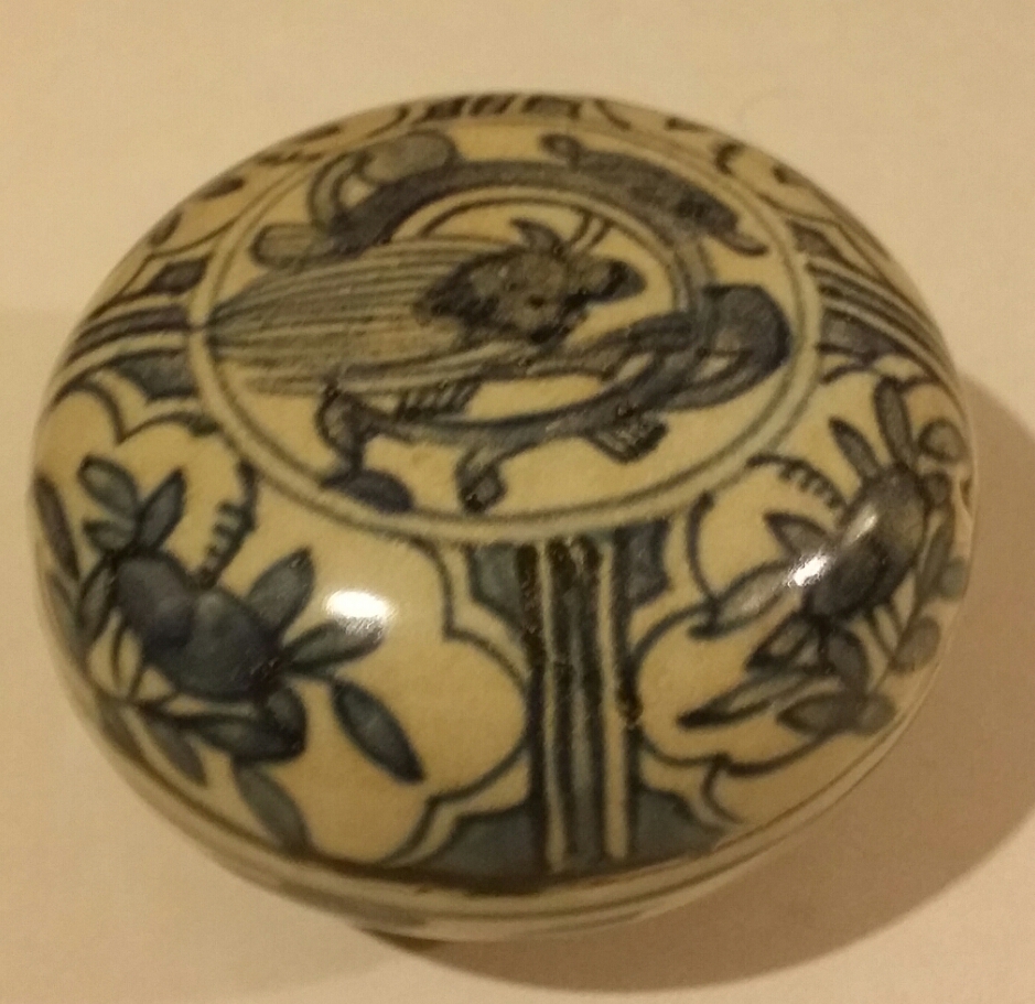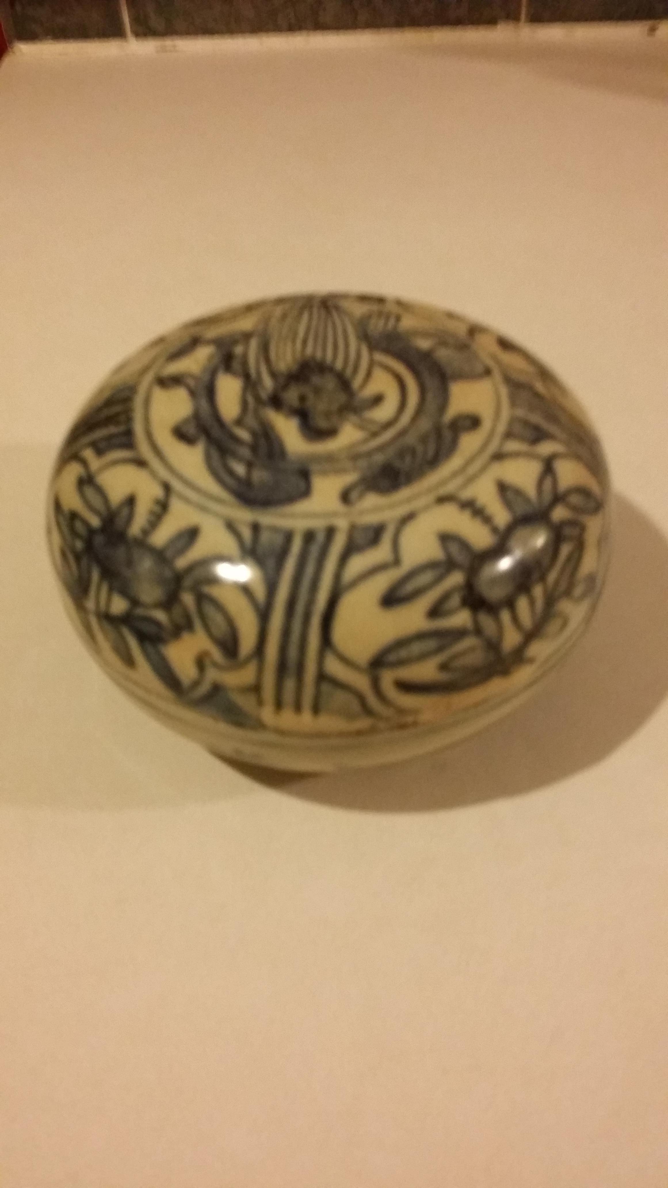 Bottom of lid and mouth of bowl is approx 3 3/4".Bottom of bowl is 2 3/8" . Colors are blue and white.
