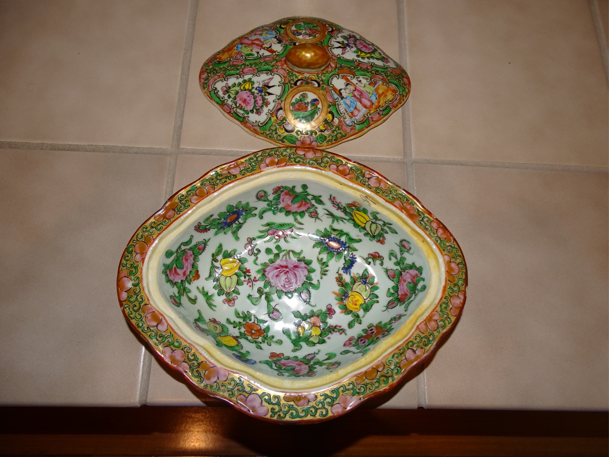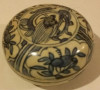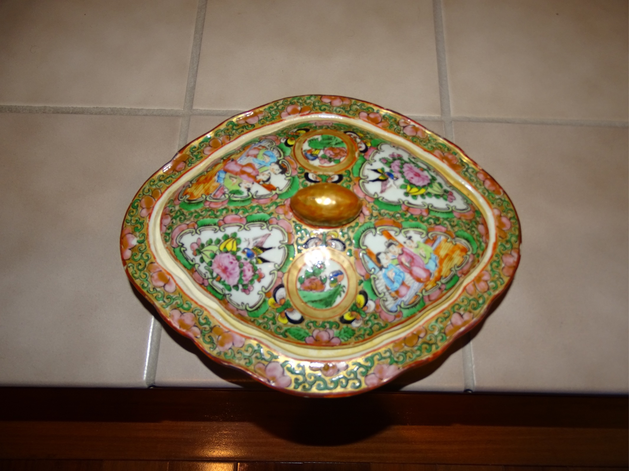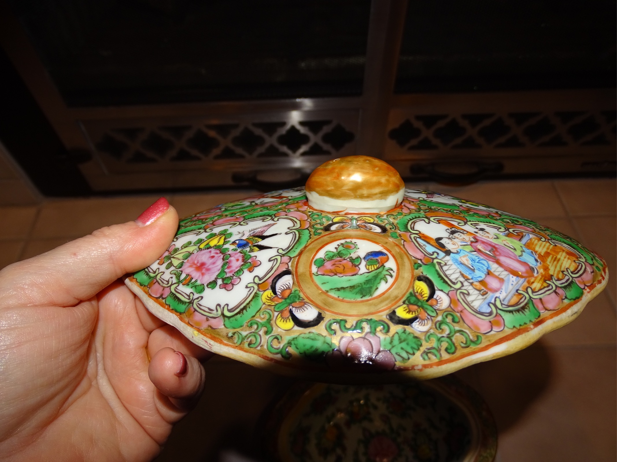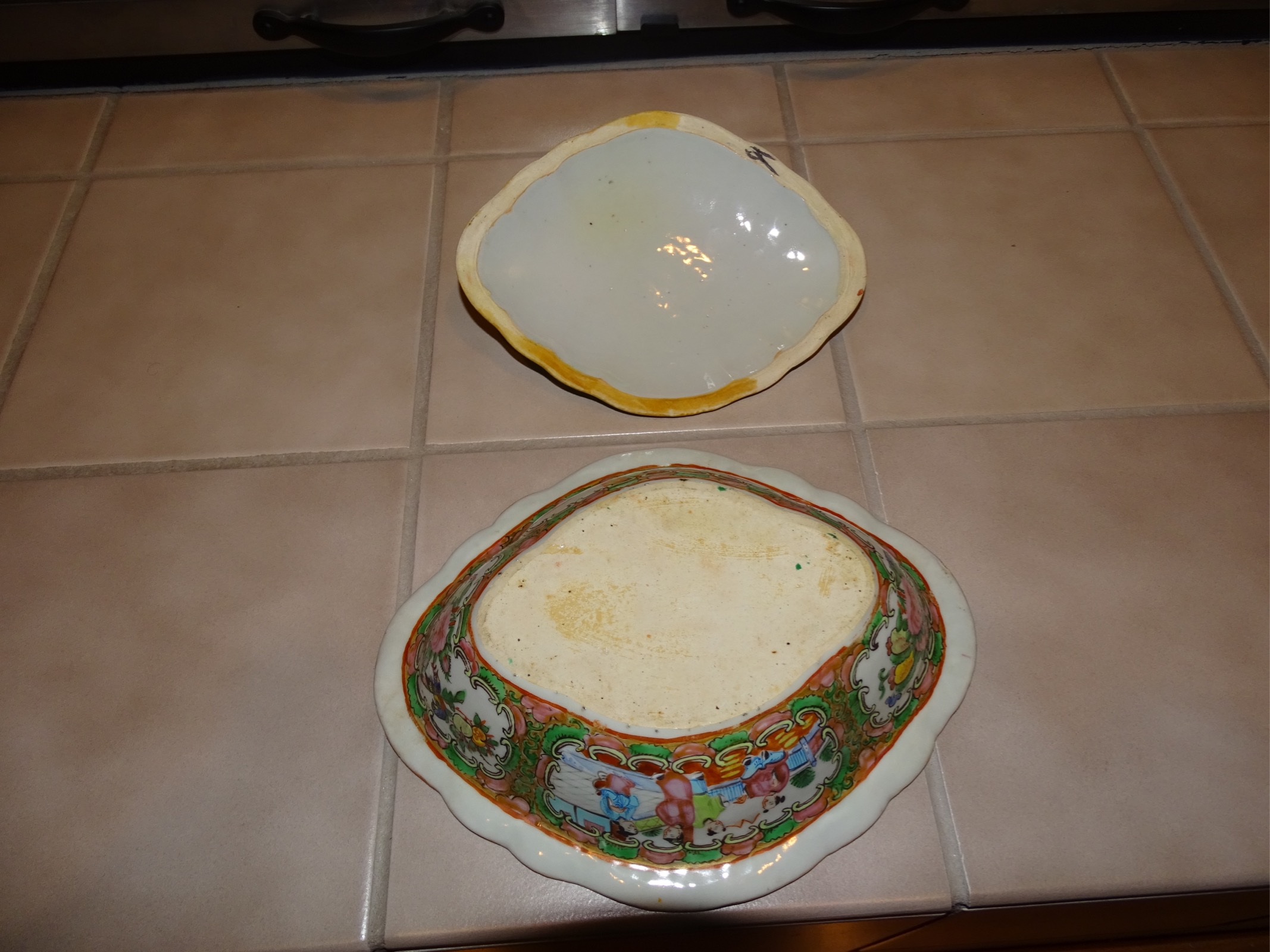 10 X 8 X 2.5" bowl/container. Appears to be ceramic or porcelain. Lid has a small round handle shaped as a oblong shape orange gold colored. Many pictures of asian people, birds and what appears to be front of a ship/boat. Glazed but no glaze on bottom or very outside of inner lid.