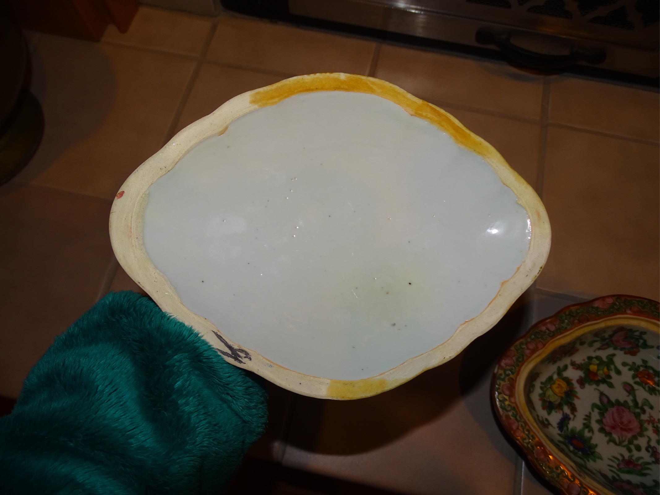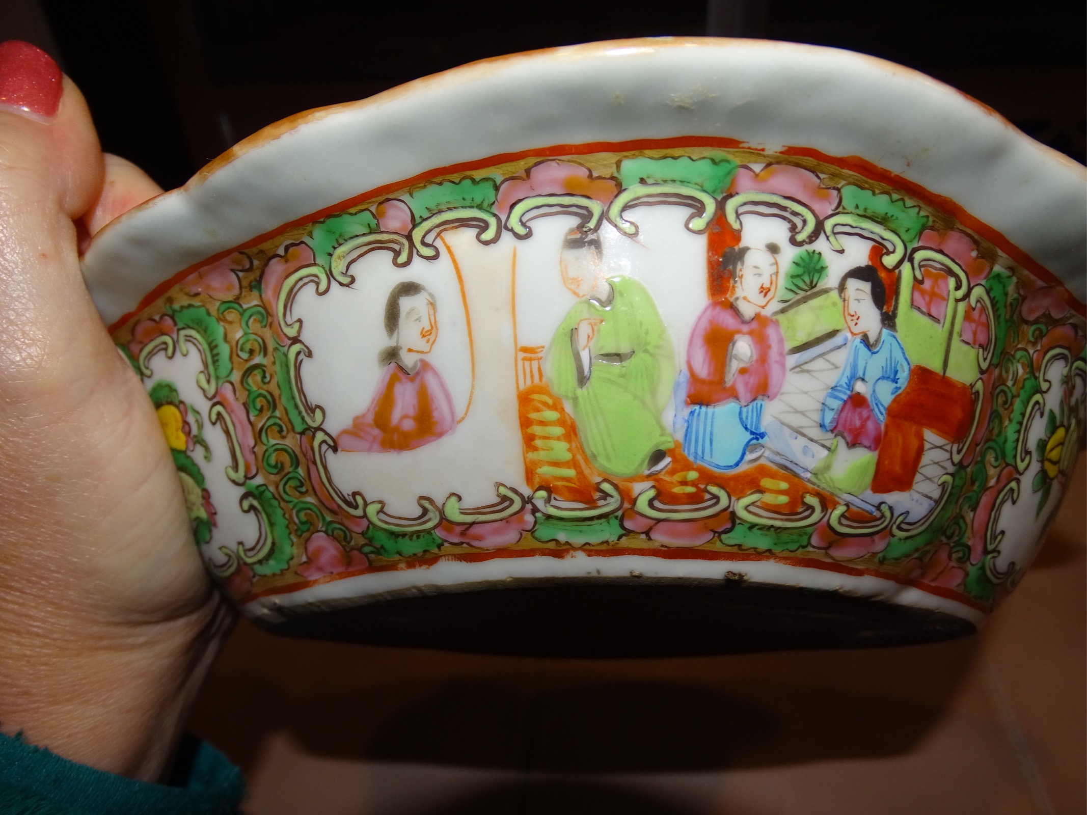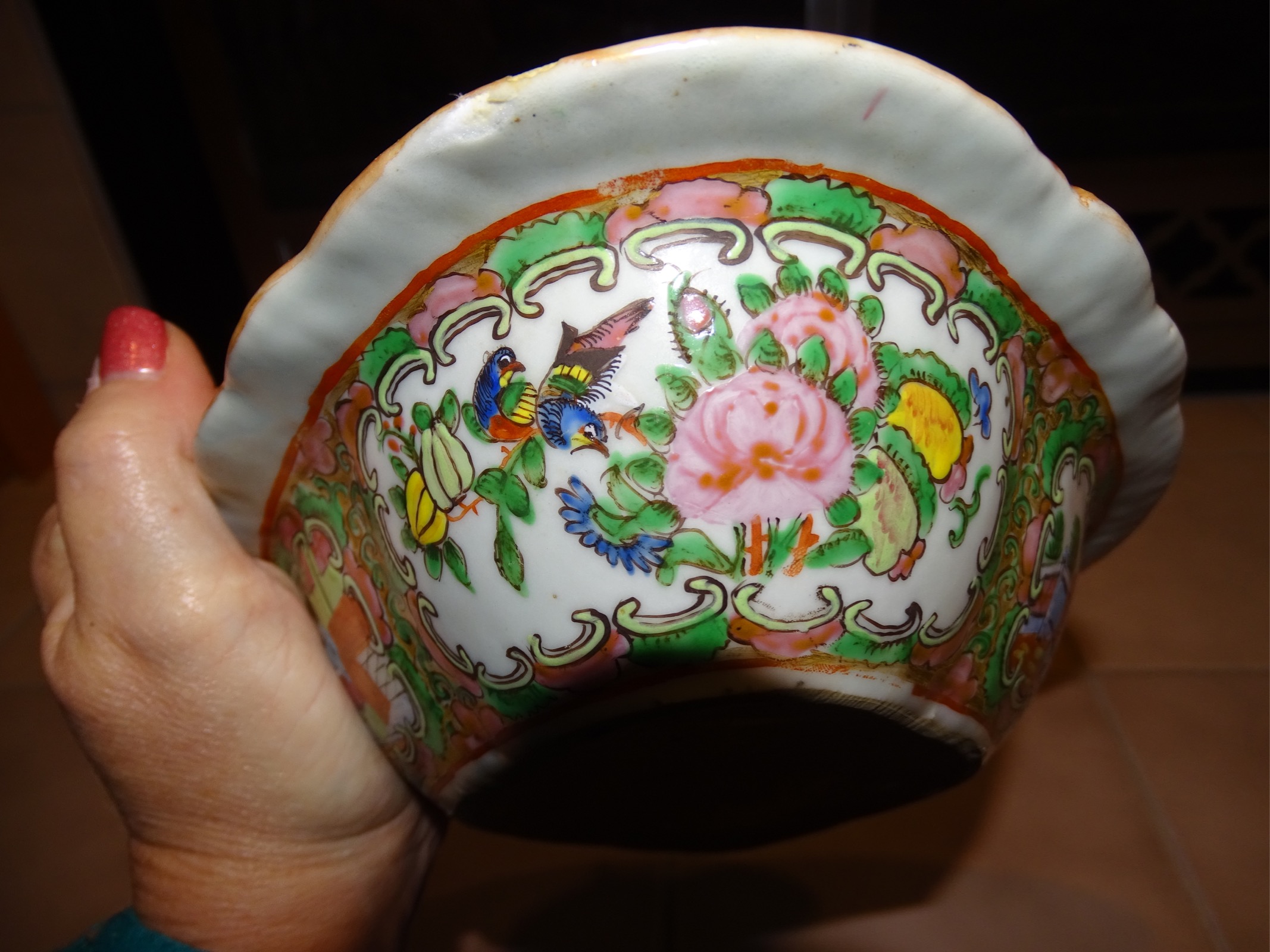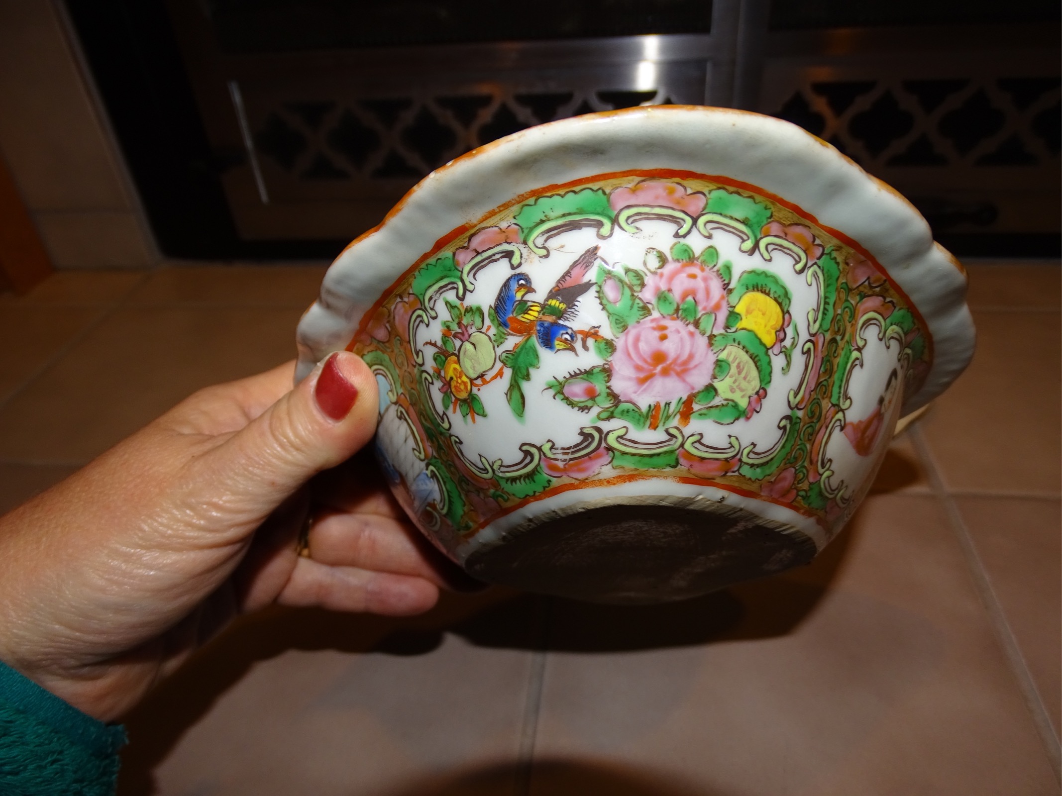 10 X 8 X 2.5" bowl/container. Appears to be ceramic or porcelain. Lid has a small round handle shaped as a oblong shape orange gold colored. Many pictures of asian people, birds and what appears to be front of a ship/boat. Glazed but no glaze on bottom or very outside of inner lid.