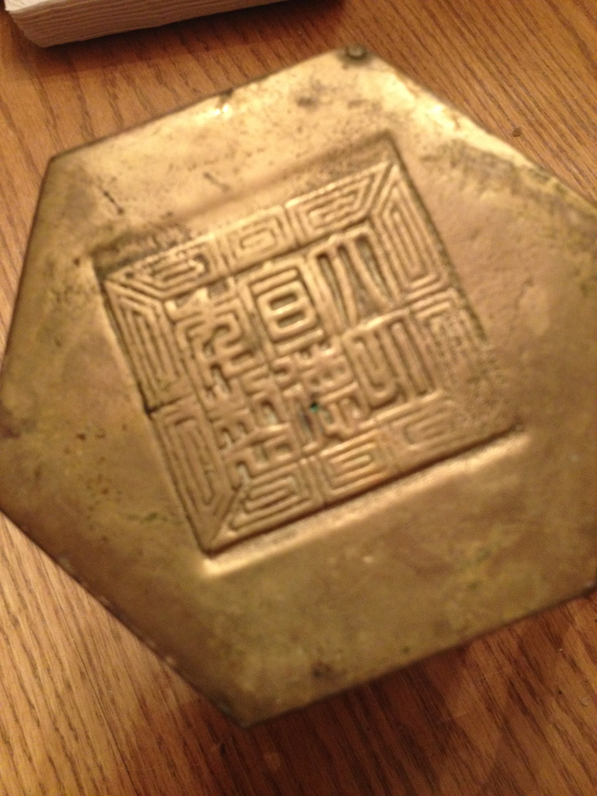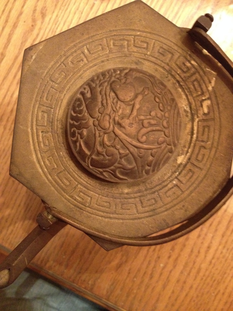 Not much is known about this tea pot. It was given to my mother from my great grandmother. I would love to know what the marking says on the base. I am also curious of the characters on the pot, origin, the metal if identifiable, and of course if this has any value. Thank you for any help.