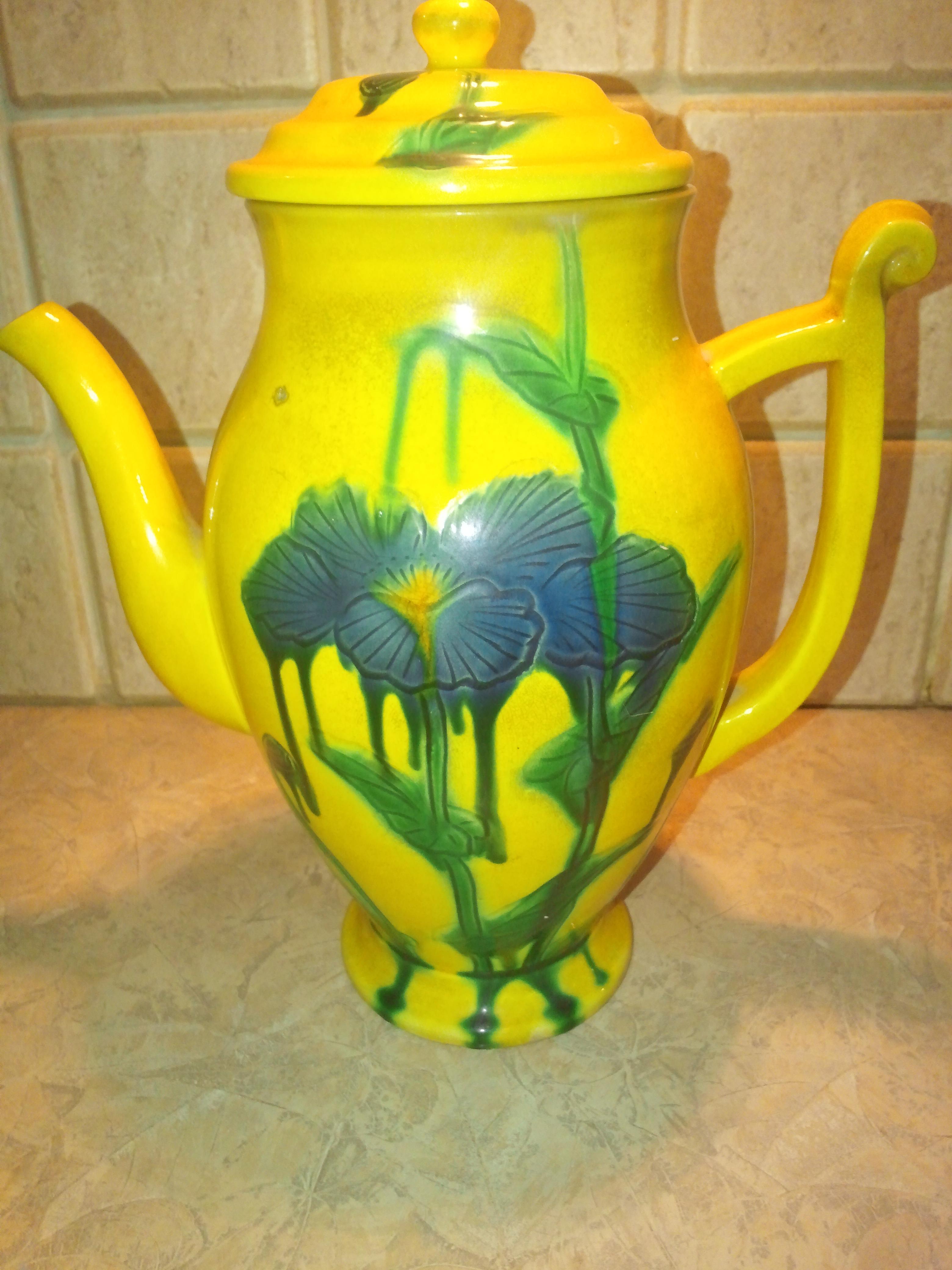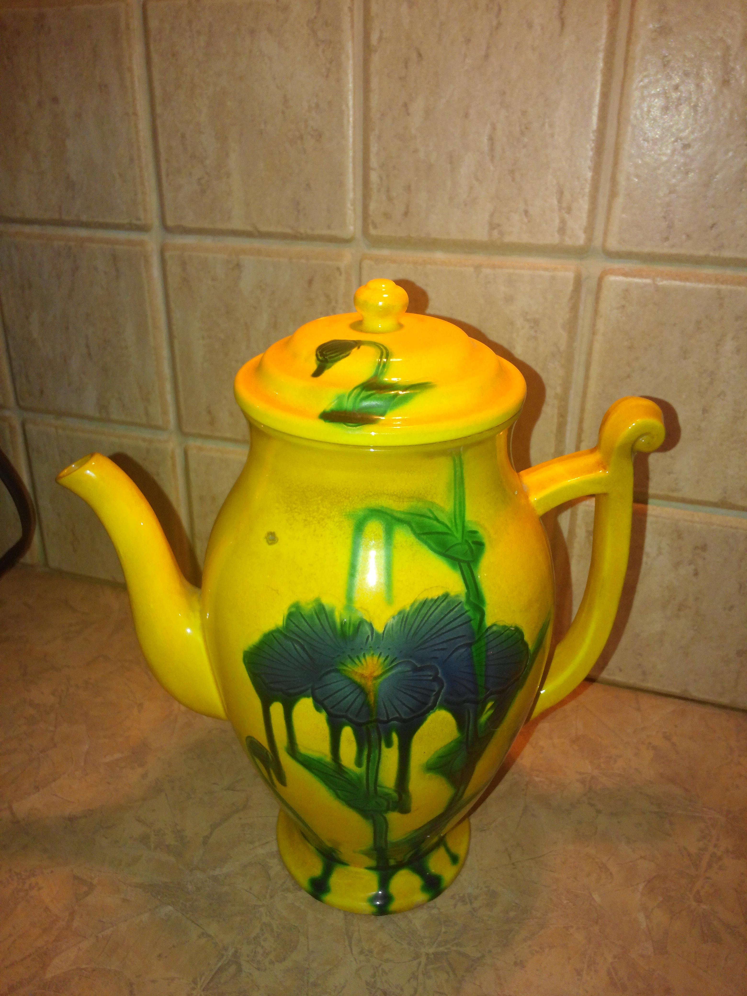 Antique awaji pottery teapot incised iris bright yellow. Single incised character minpei danto klin. Circa 1880 1920. No chips or cracks