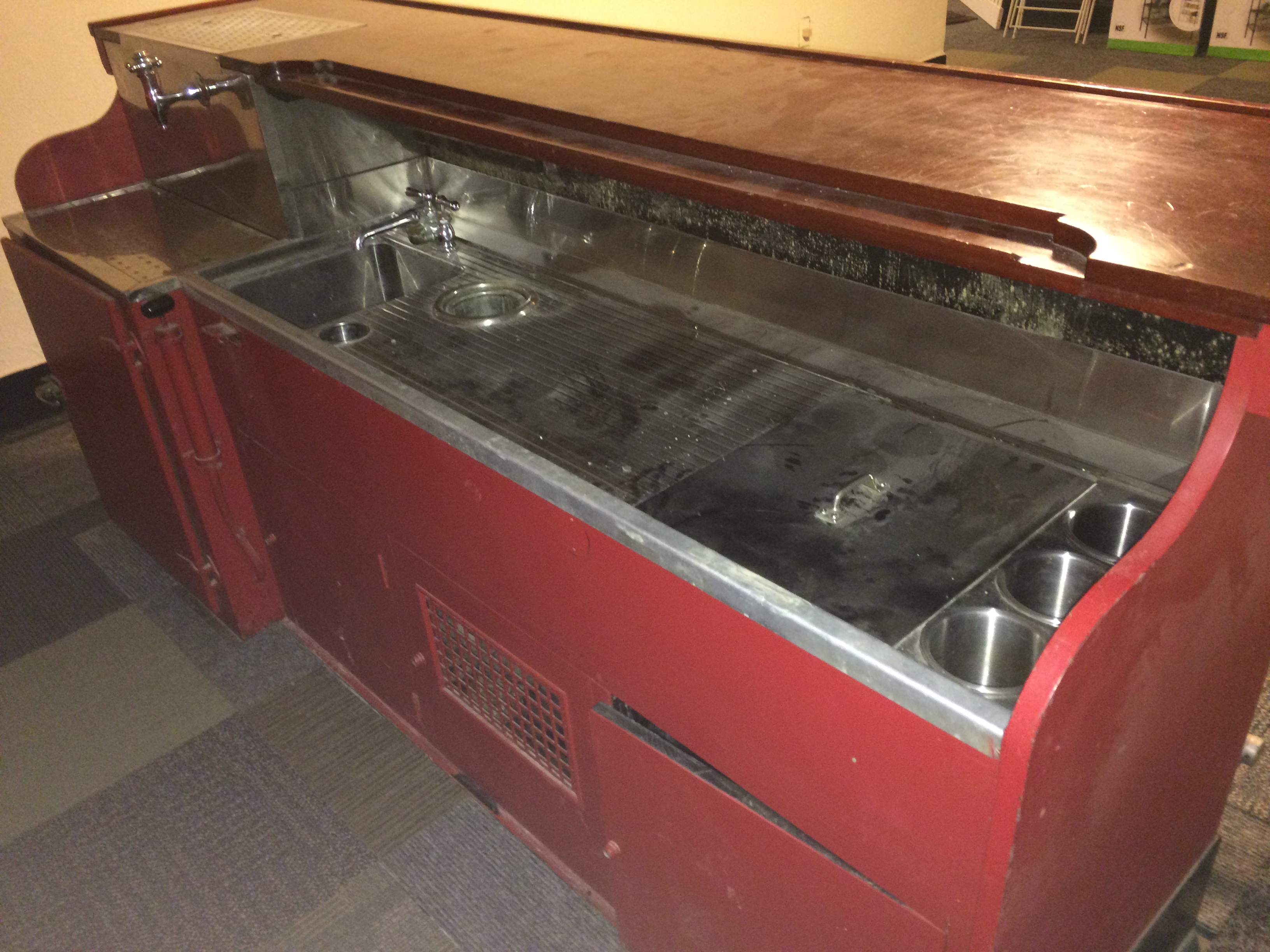 There is the freestanding bar with two sinks, area for keg with and hook-ups. Behind it is a built-in counter/cabinetry with additional refrigeration.