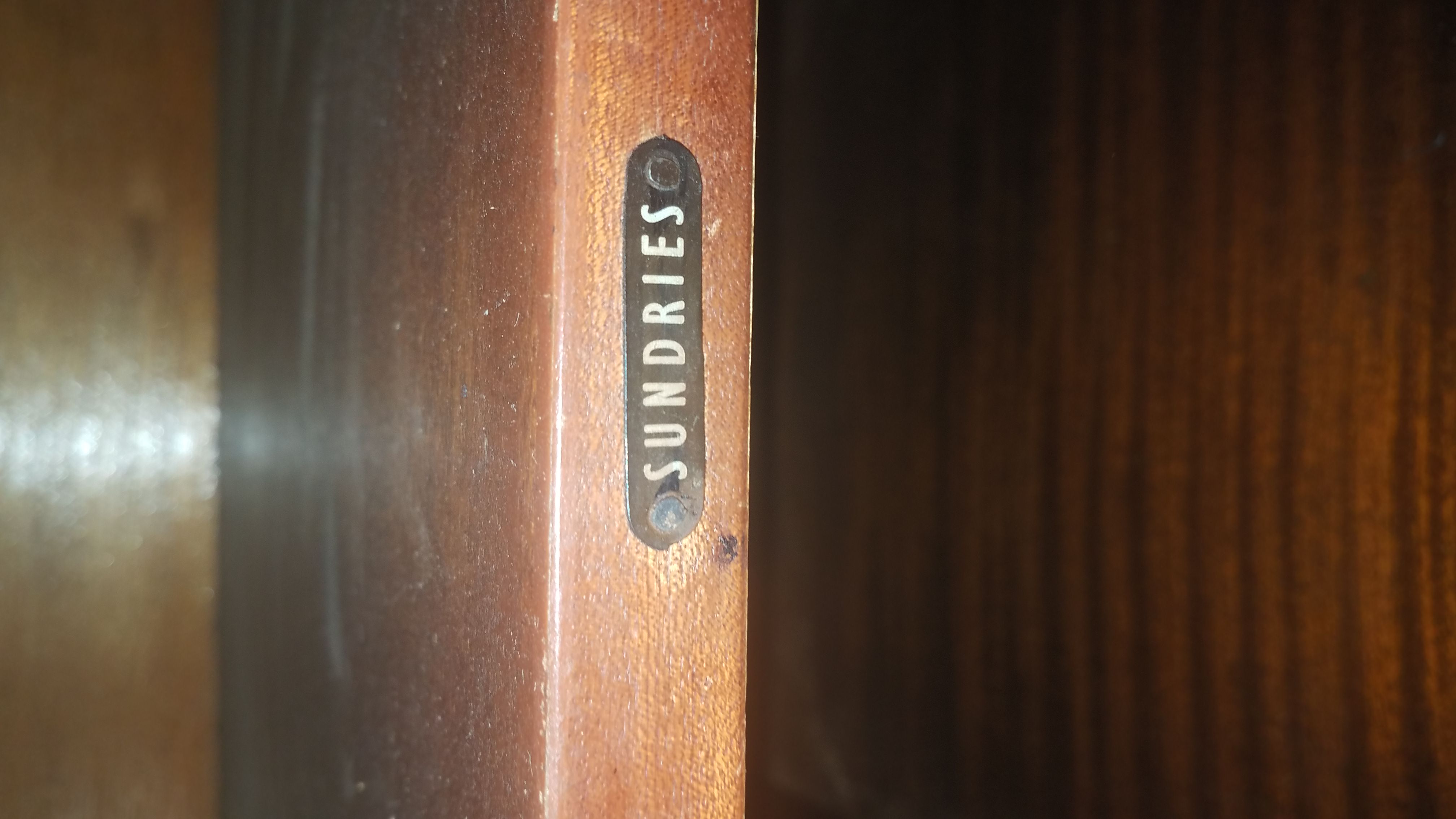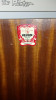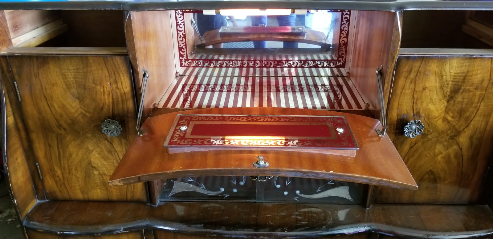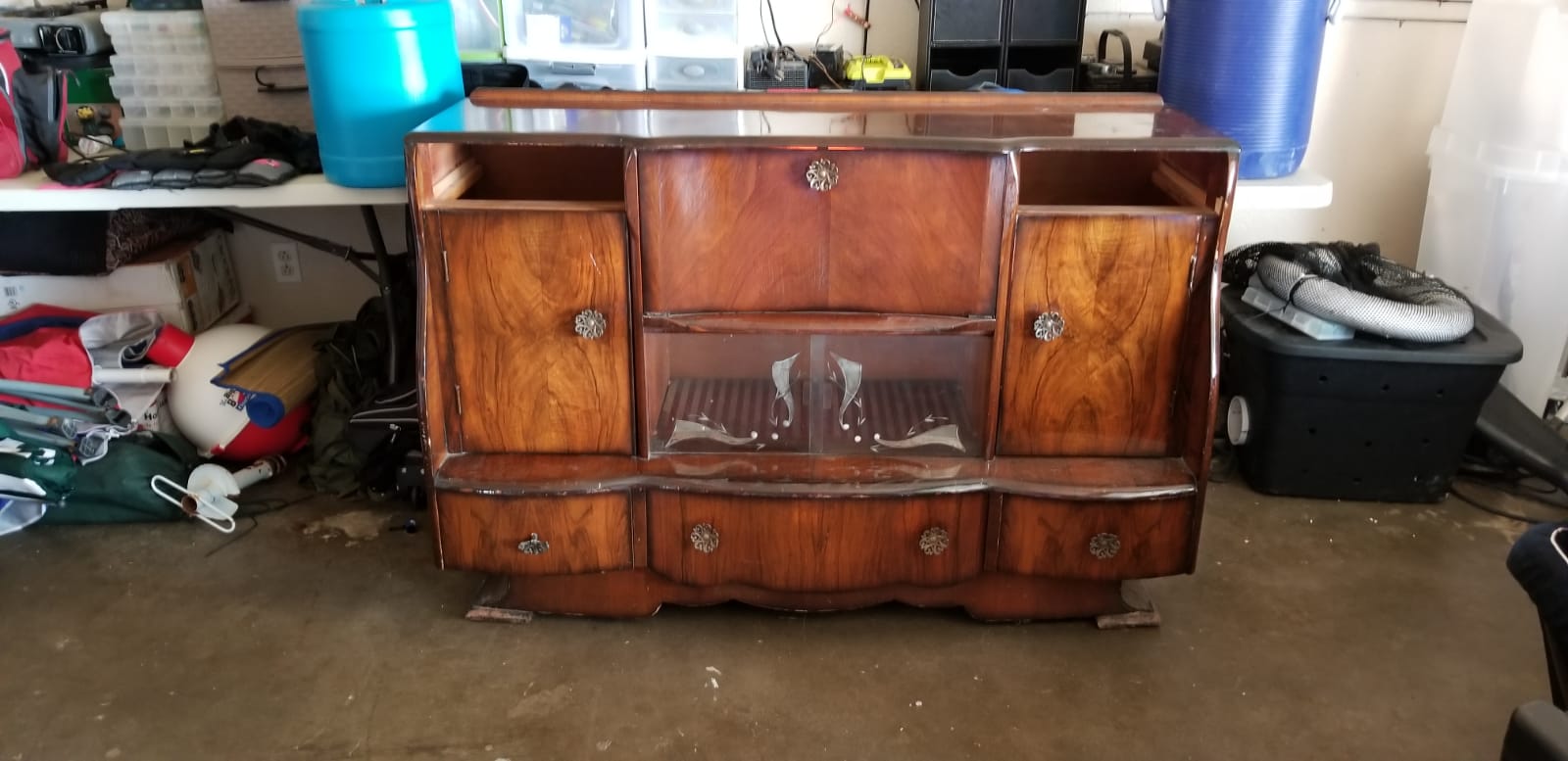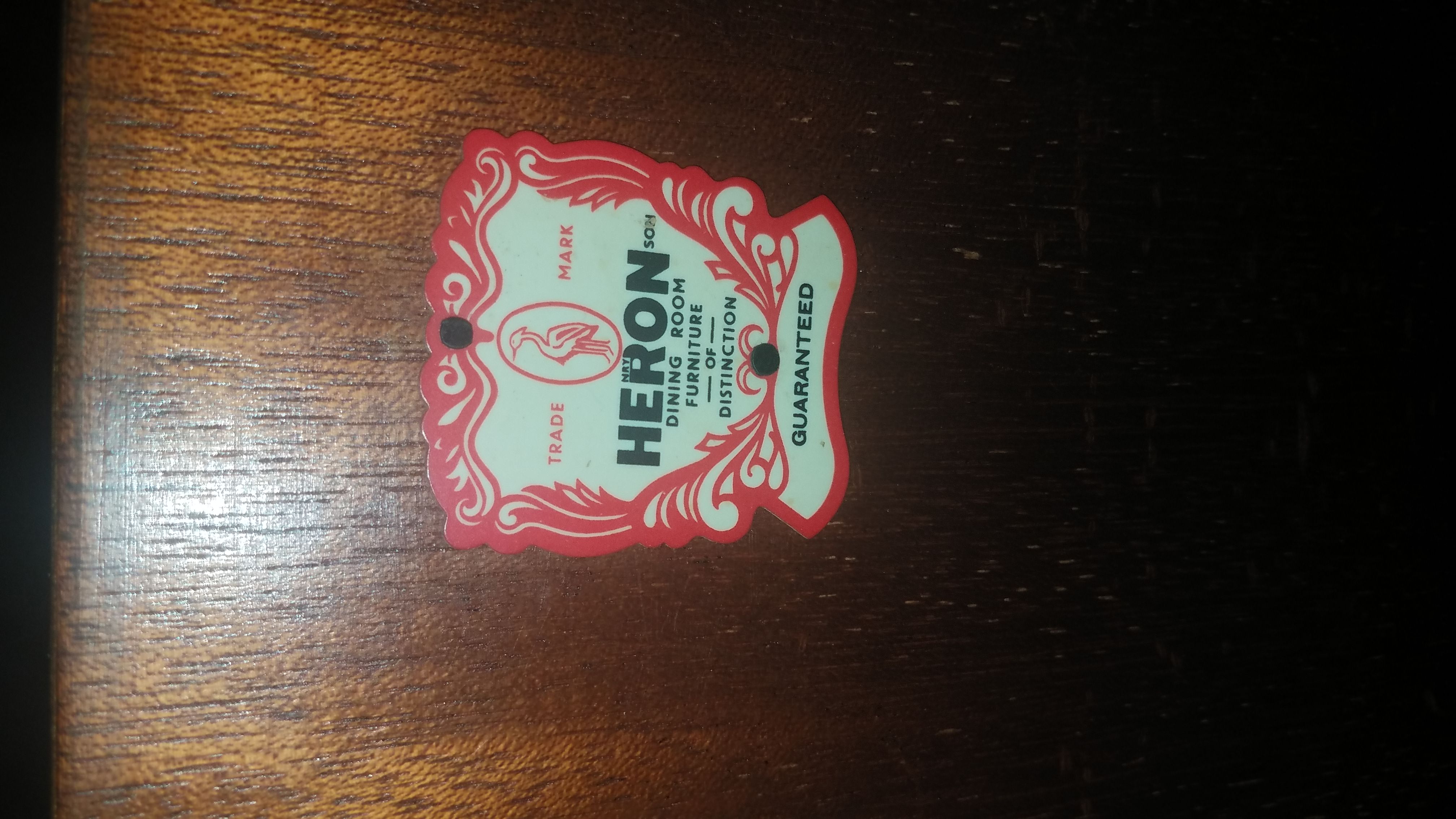 Antique bar it says heron dinning room furniture of distinction in one of the doors, it has light, and glass inside with design, two glass doors with design, heavy very nice piece, etc...