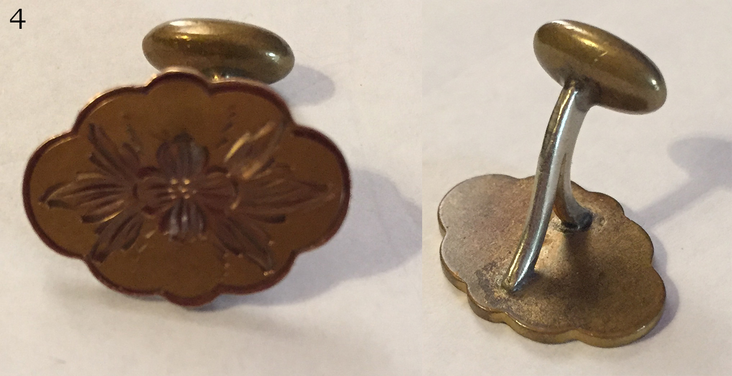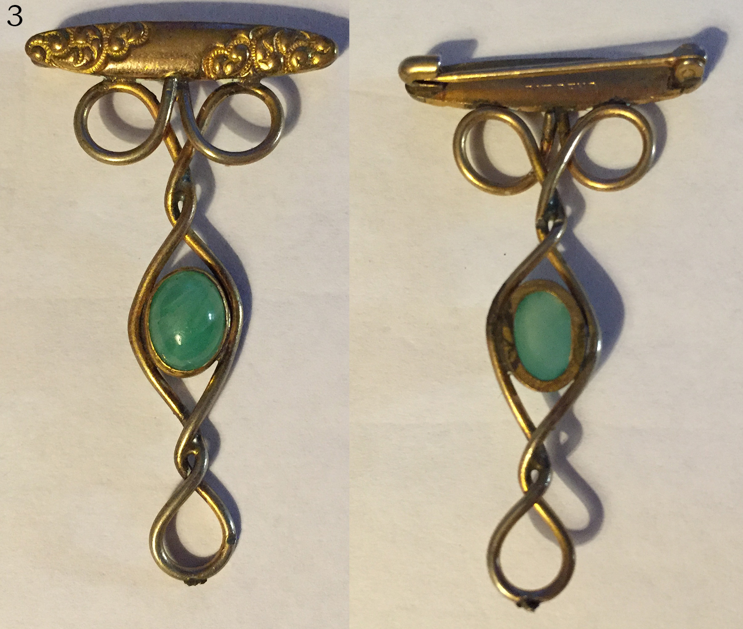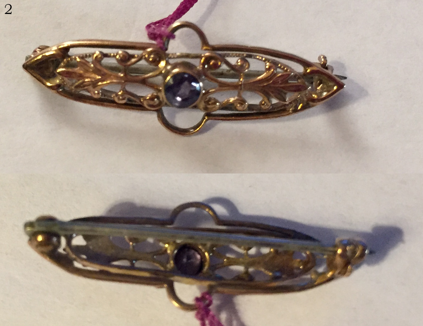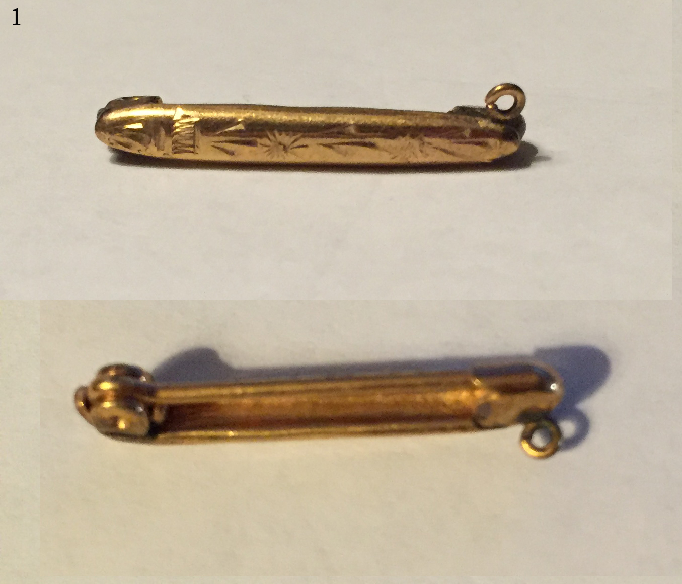 I have these five items and have listed a number on each. My great aunt was an antique dealer and these are items that I received when she passed away. I wanted to find out more about them and see what their values might be. There is very little info on each, but I will include what I know. The first three are the bar pins. #1 has a tag saying it is 14k gold. #2 says something along the lines of CalB or CaB. #5 says it is a 14k cufflink.