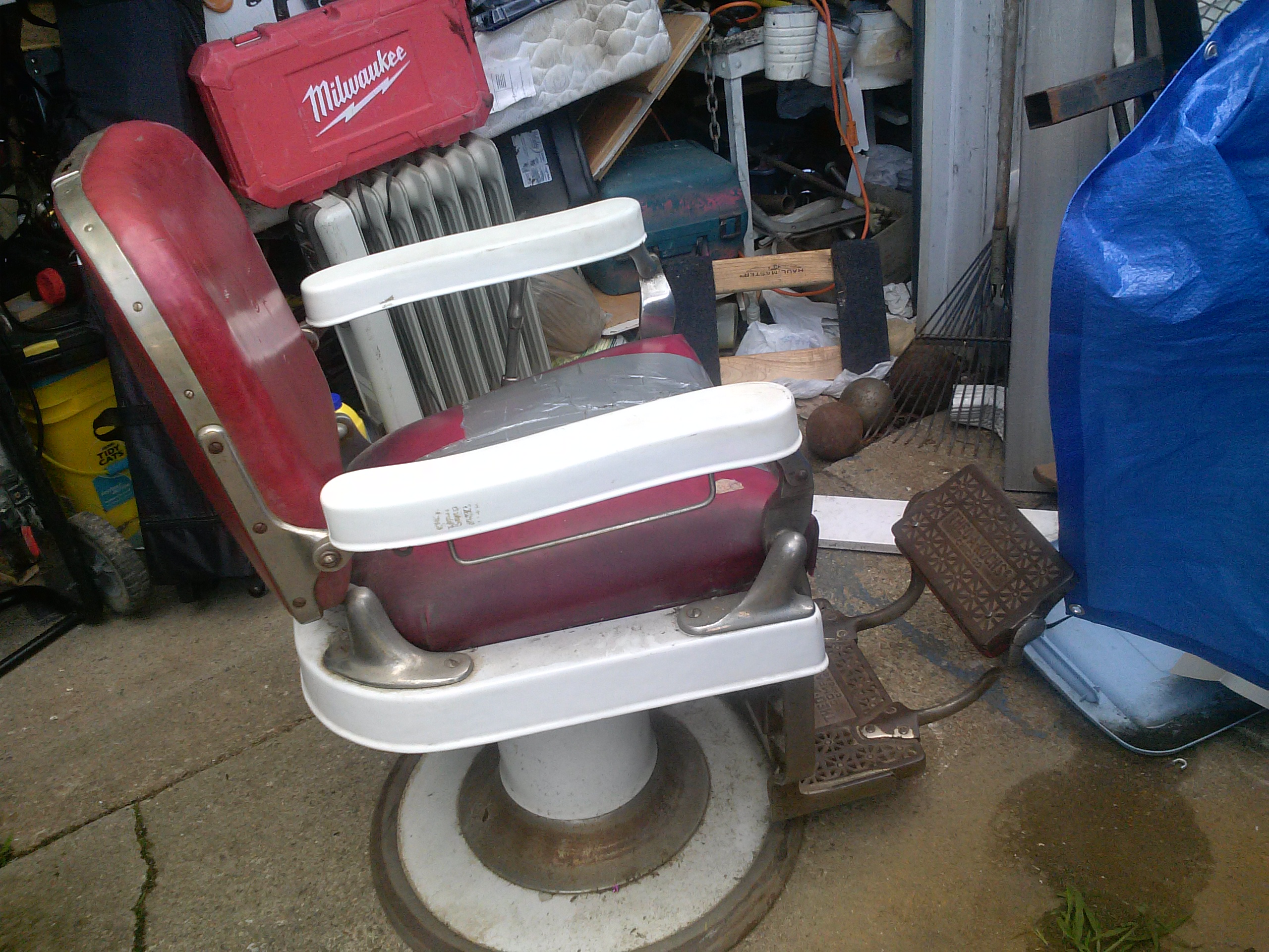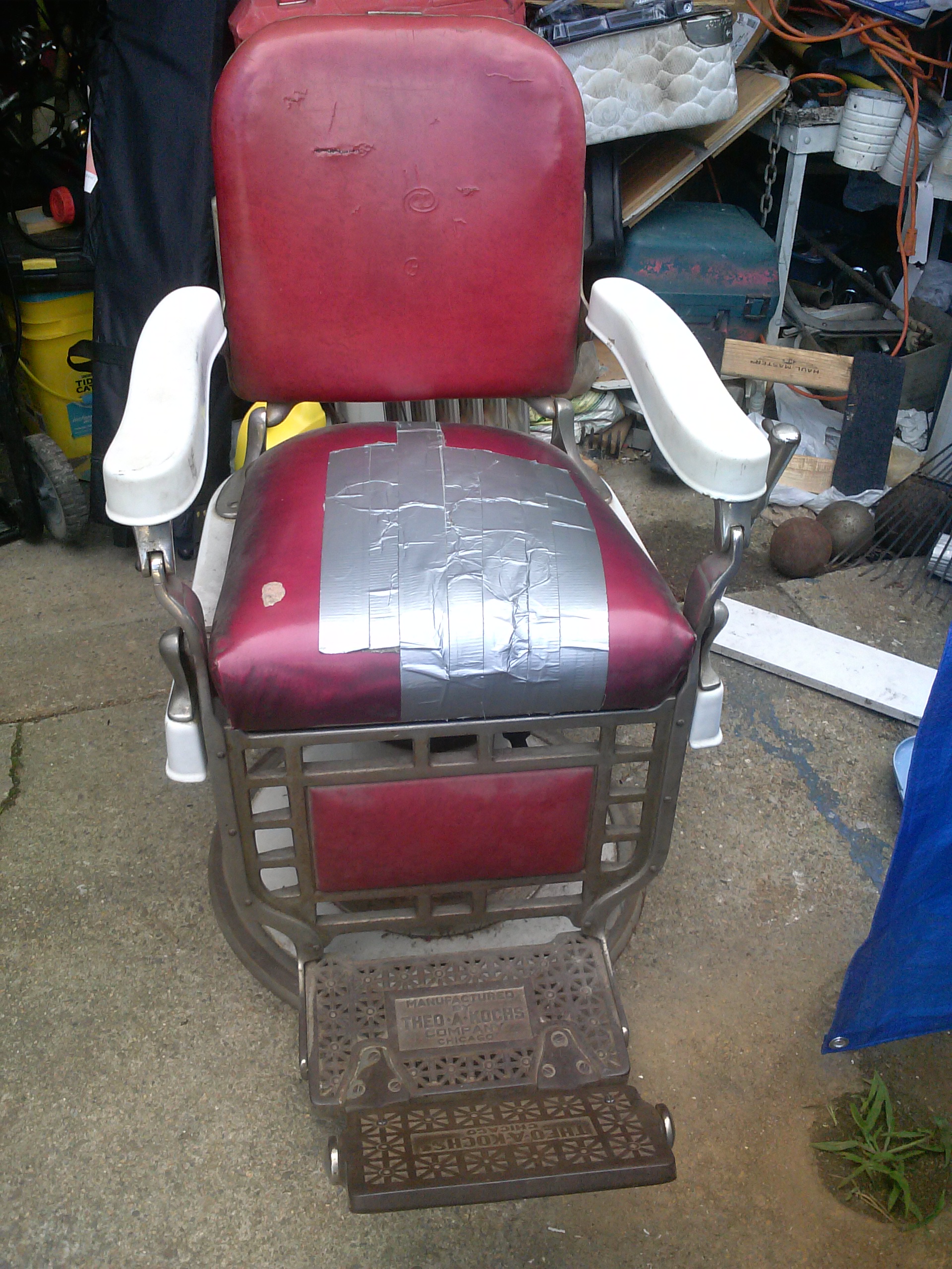 a red and white barbershop chair made by Theo-A-Kochs company chicago. leather is damaged but fixable.