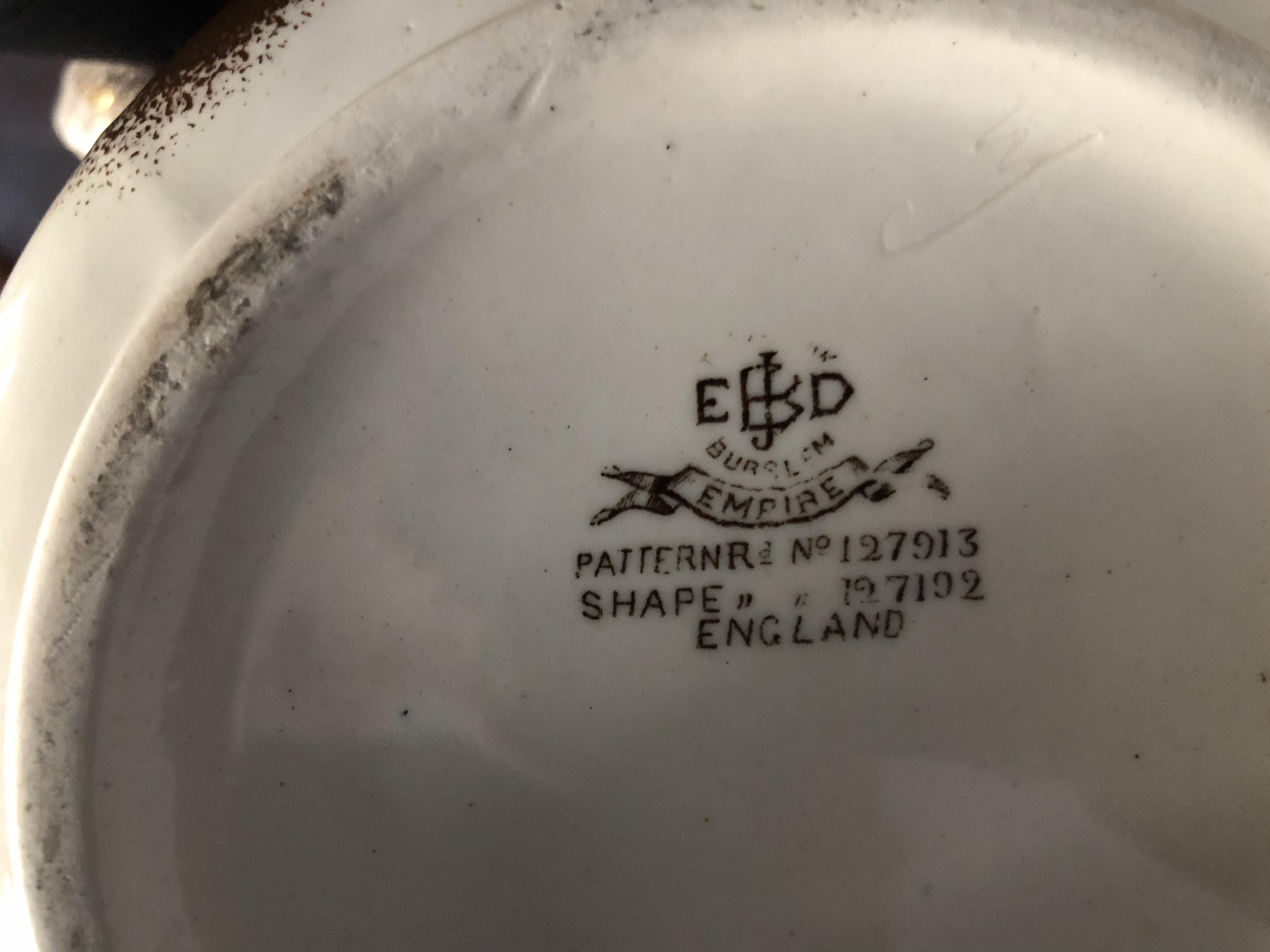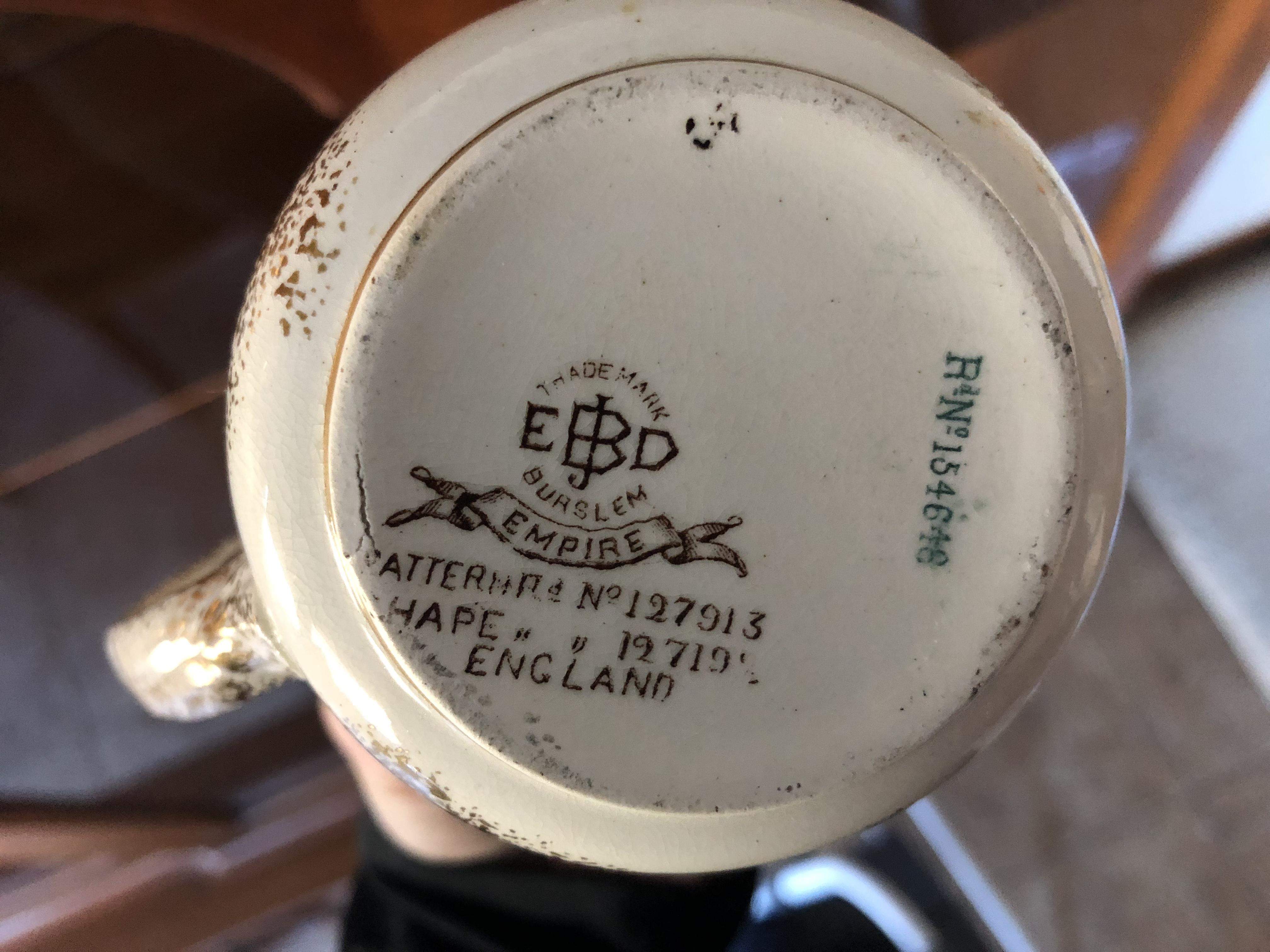 Based on the markings your wash basin and pitcher dates from around 1892. These were originally part of larger sets that would have included a soap holder, commode and toothbrush holder. These were hot items during the 1980's to 90's, but values have declined a great deakl since then, now they often sell at auction for under $150.00.