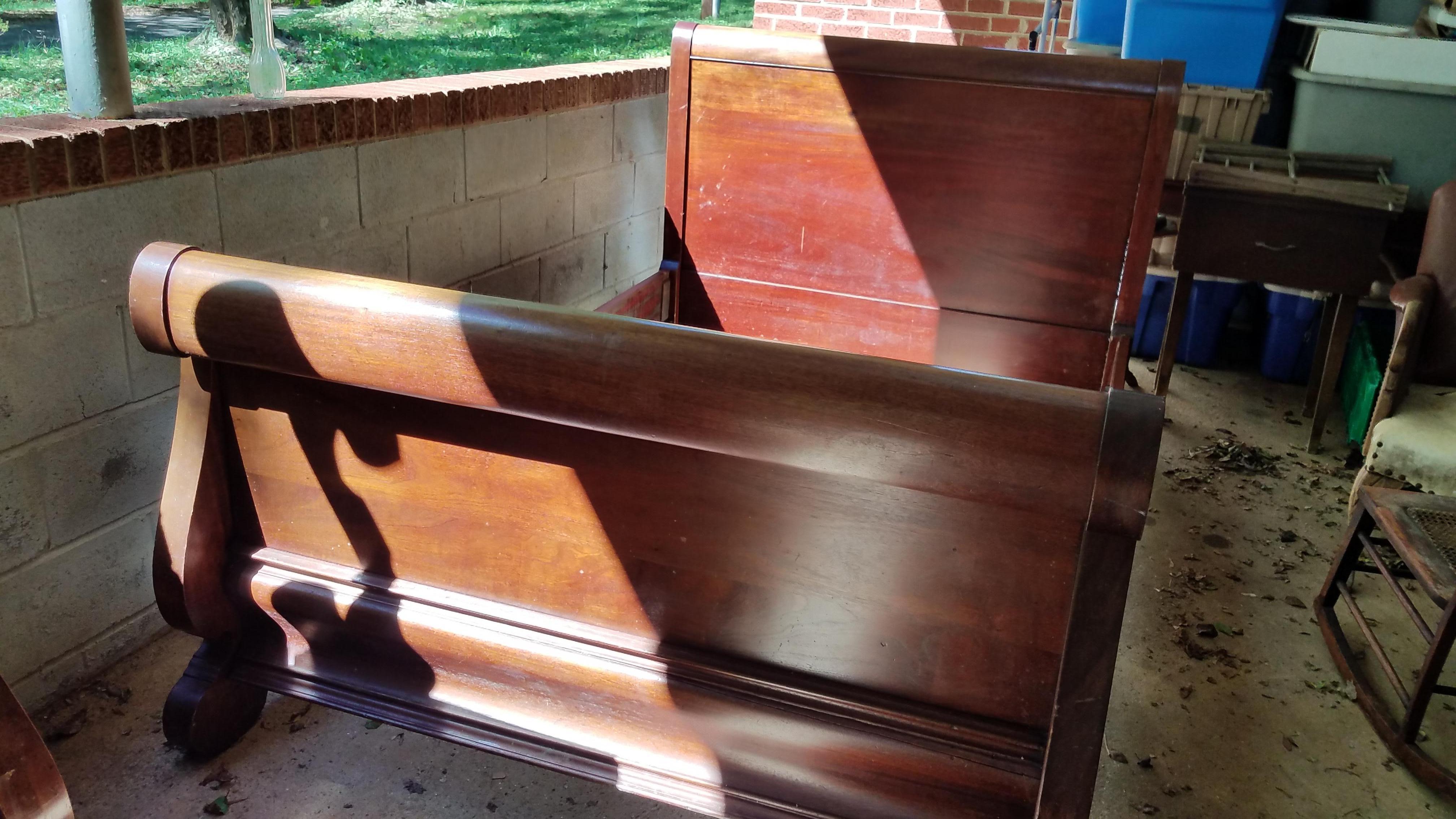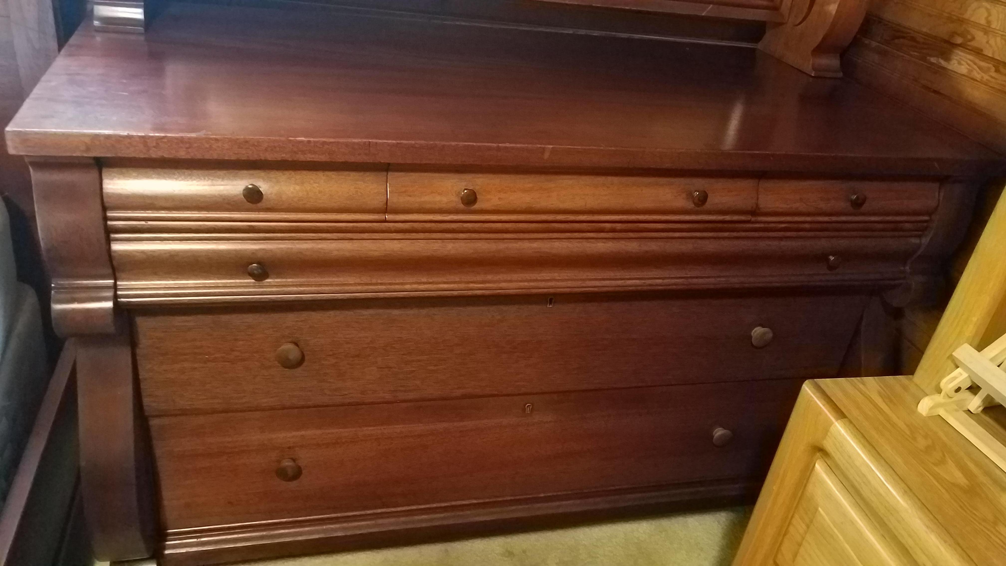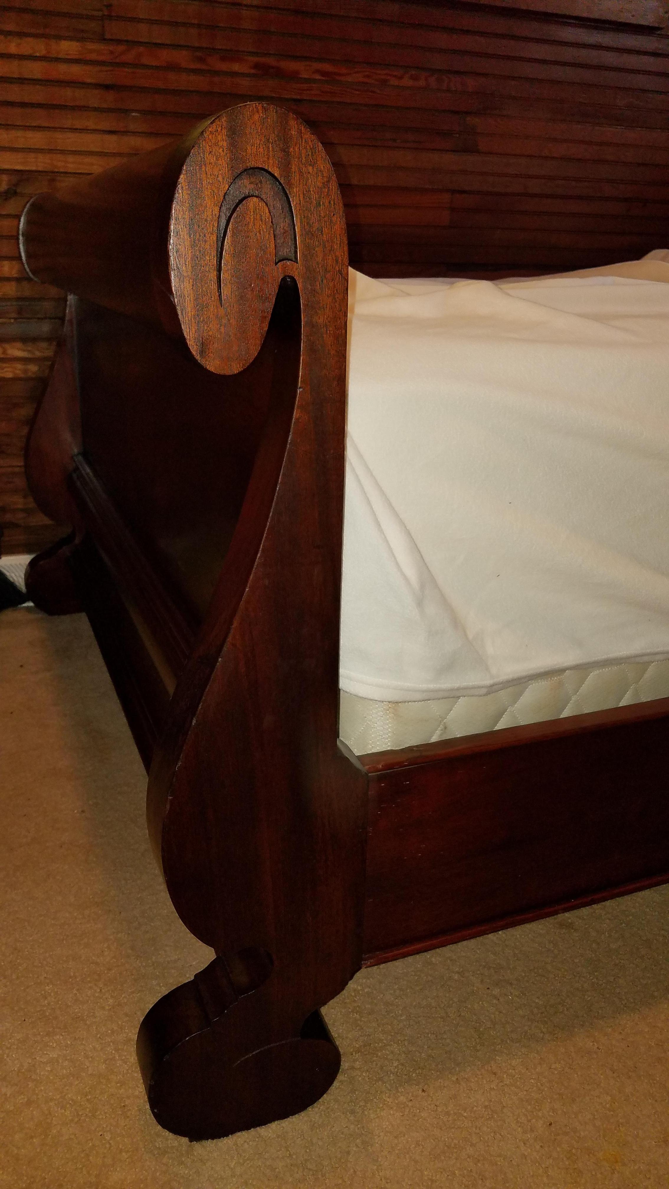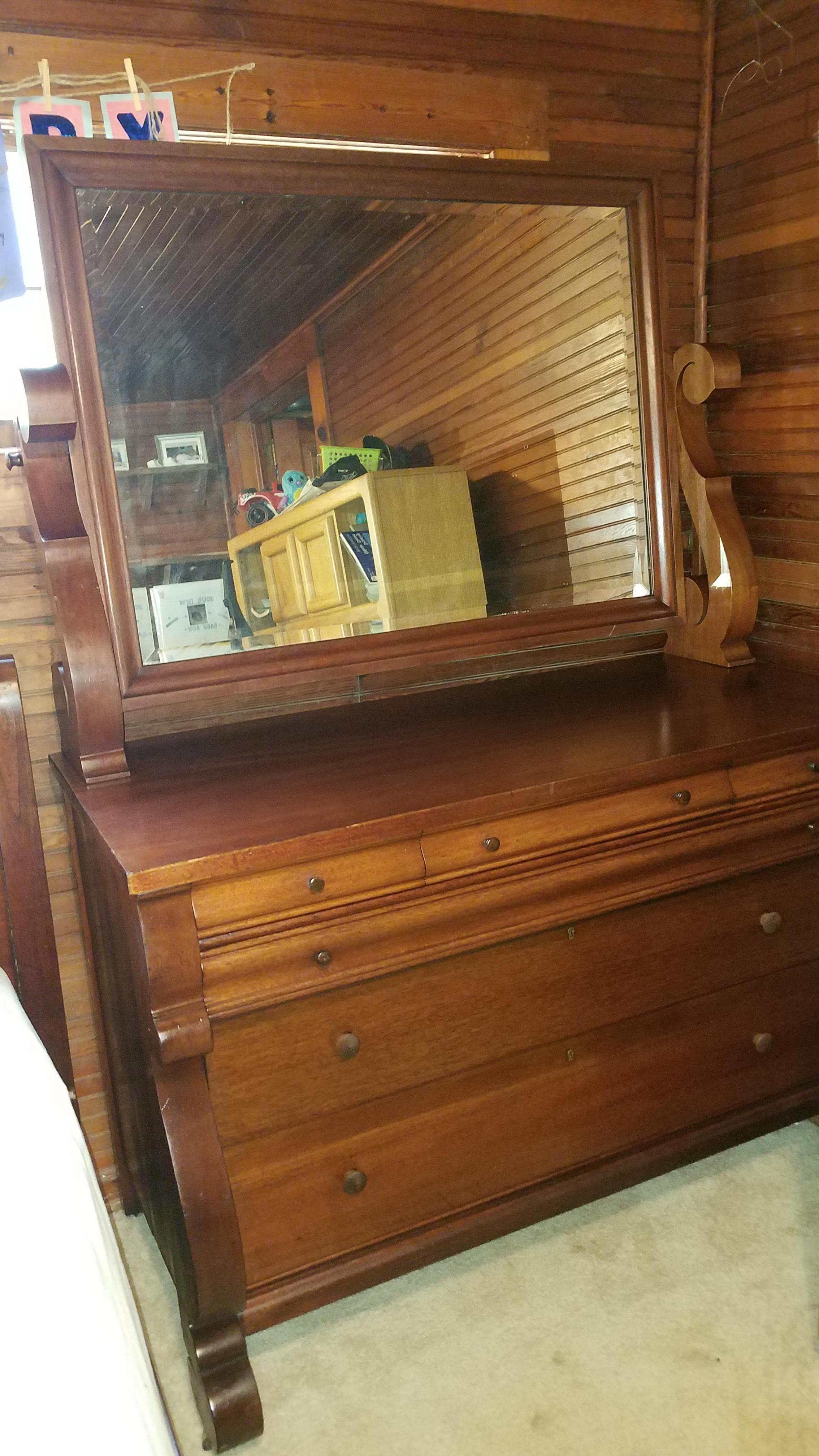 Believe it is tiger oak. Possibly 1880-1900's by Estey?? Dresser has a D200W stamp on the back. Mirror attached has a stamp AUG. 1914 W.M.P. Co. The dresser has wooden casters. The girth on the feet of the dresser as well as the bed are 2 1/2 in wide.