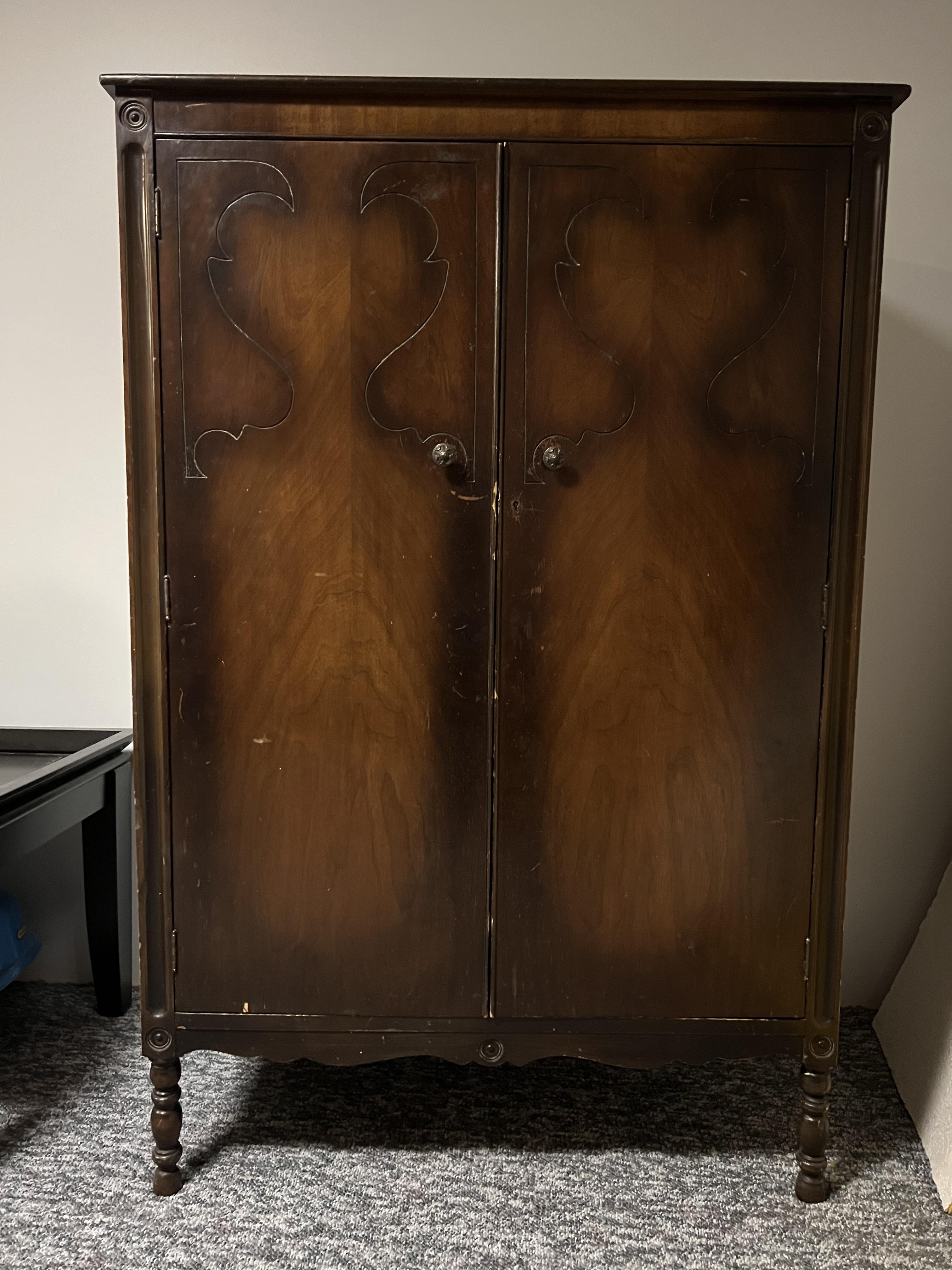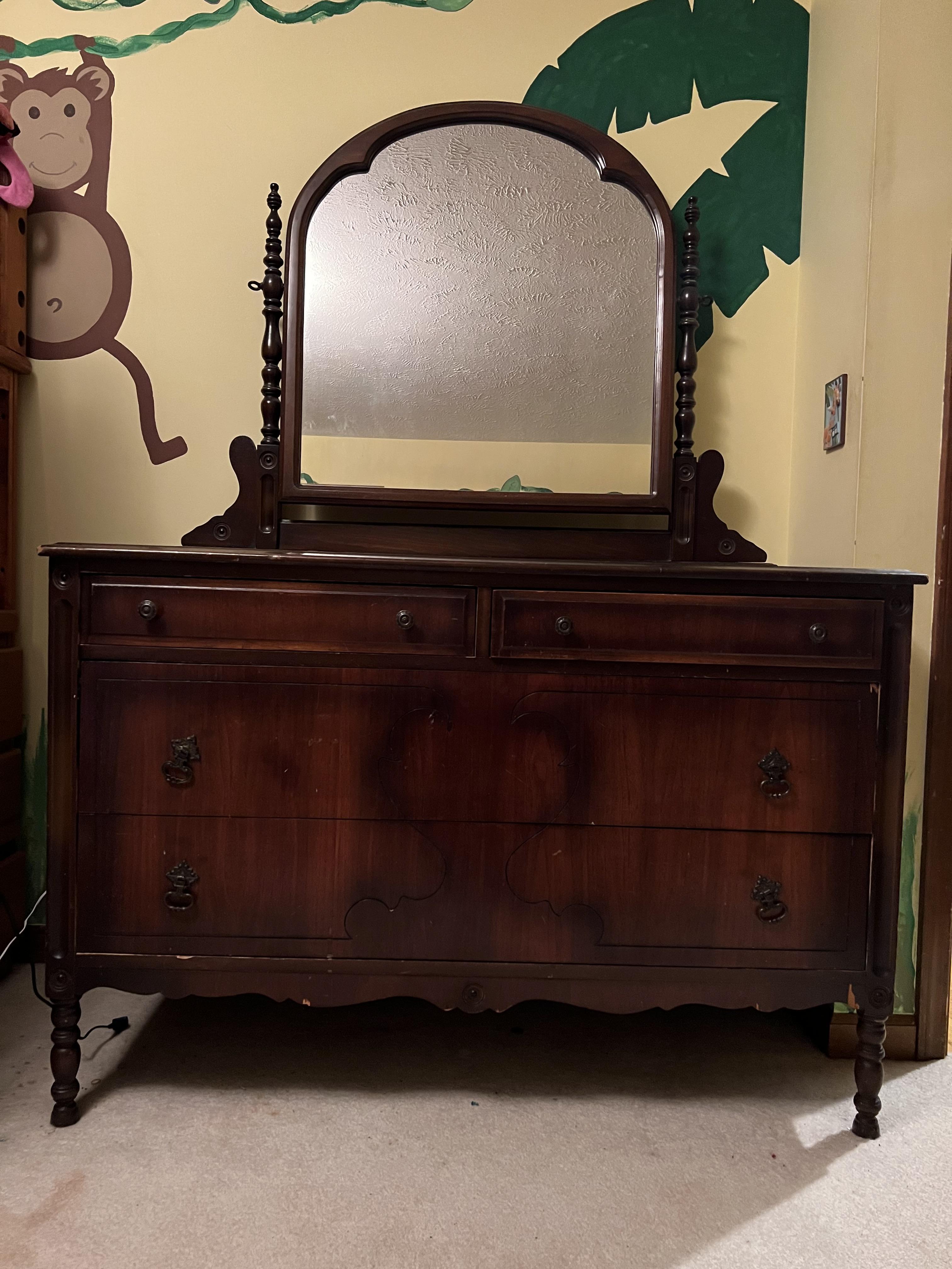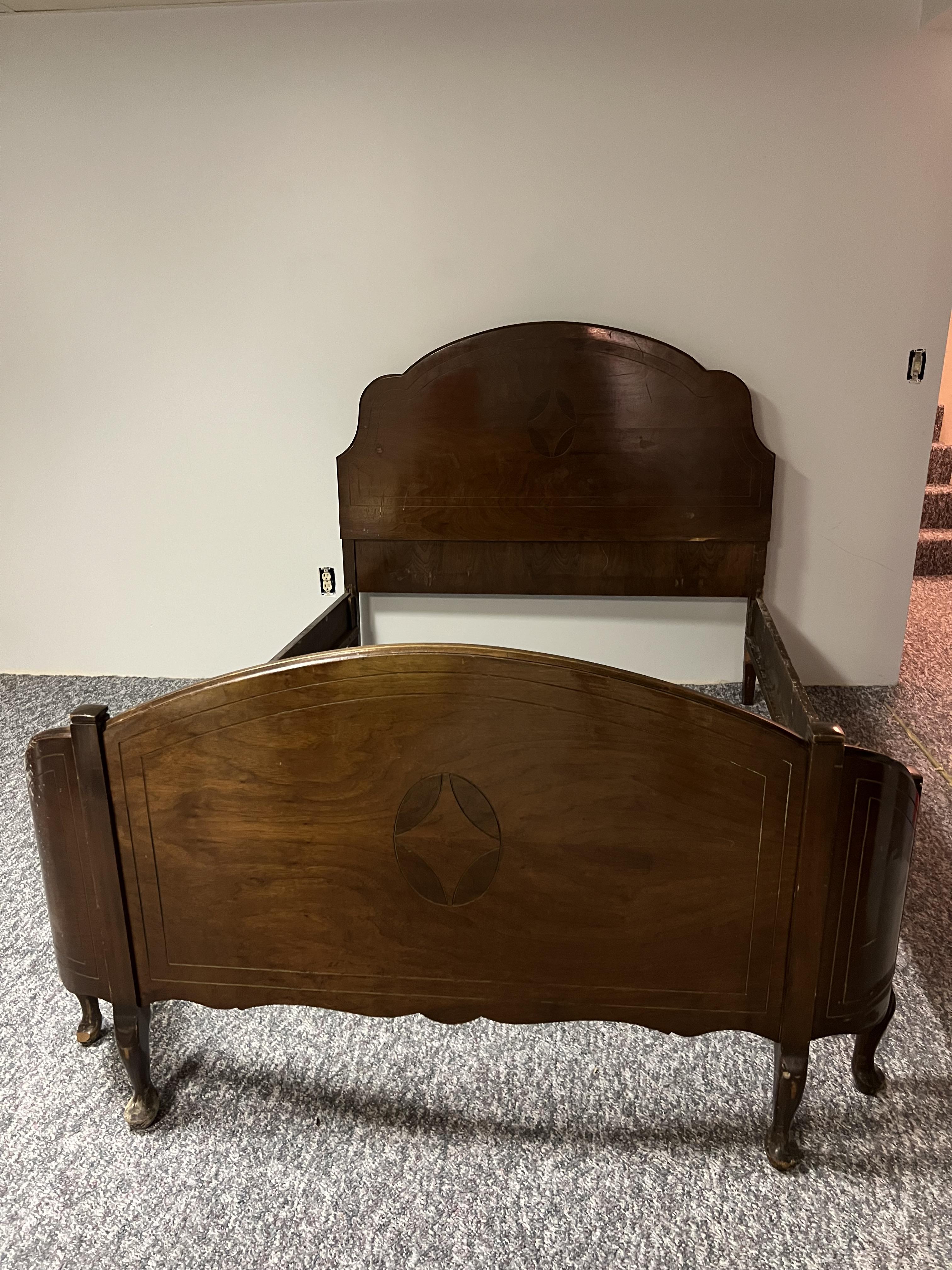 Antique walnut furniture. Bed, dresser, and armoire.