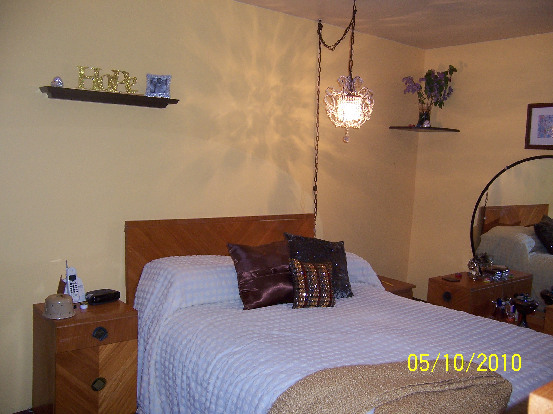 1 night stand, headboard, footboard, 2 sideboards, 1 highboy dresser, a 2 sided vanity with large round mirror, round upholstered stool.