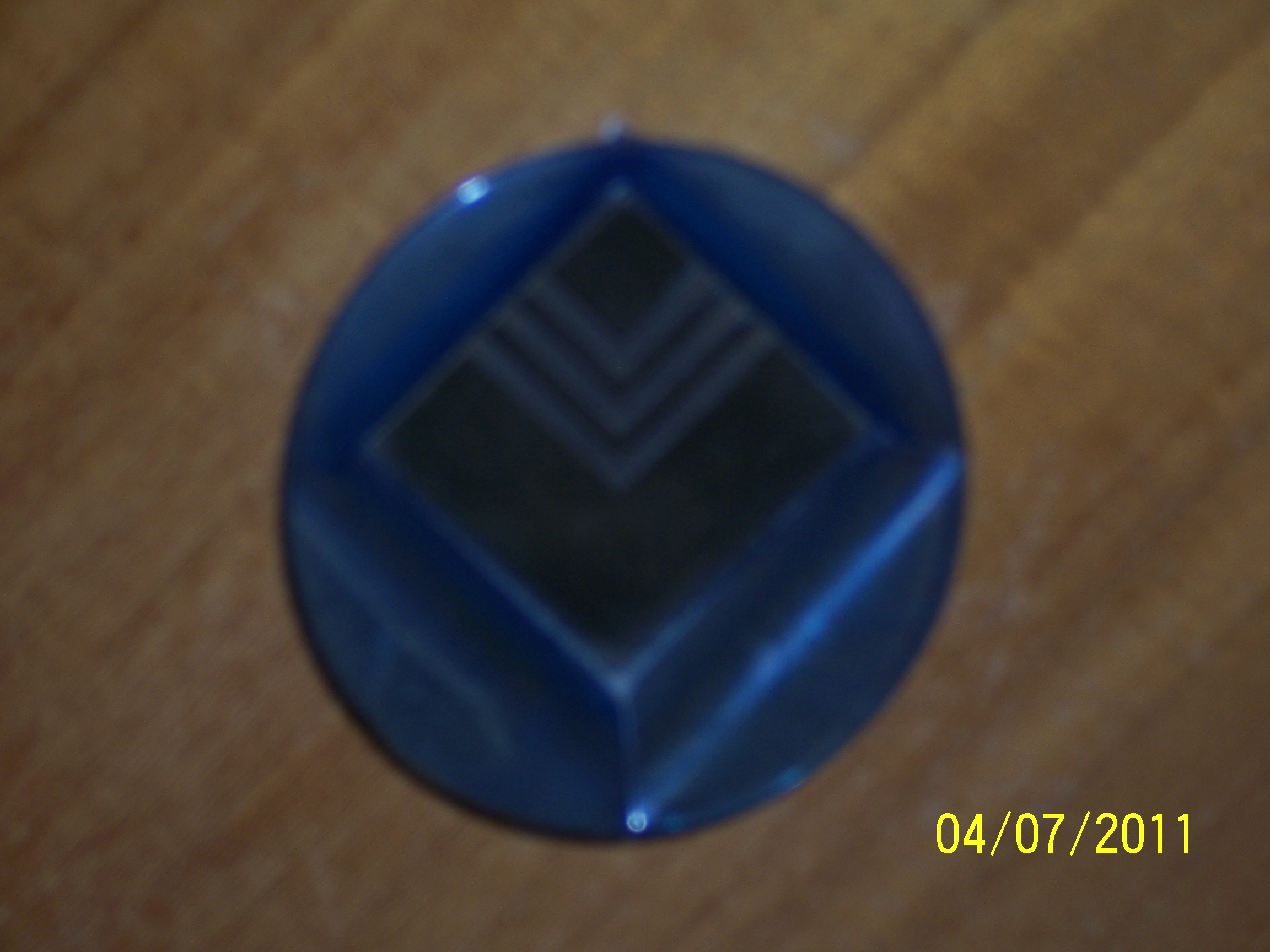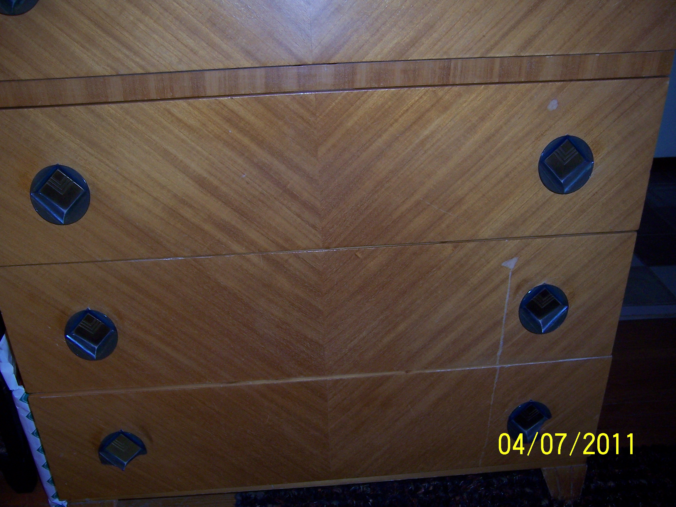 It is a blond wood with the slats in a 'V' shape. The knobs are very unusual and are plastic and metal. The Vanity is 2 sided with the center part at a lower height than the 2 sides, with a large round mirror.