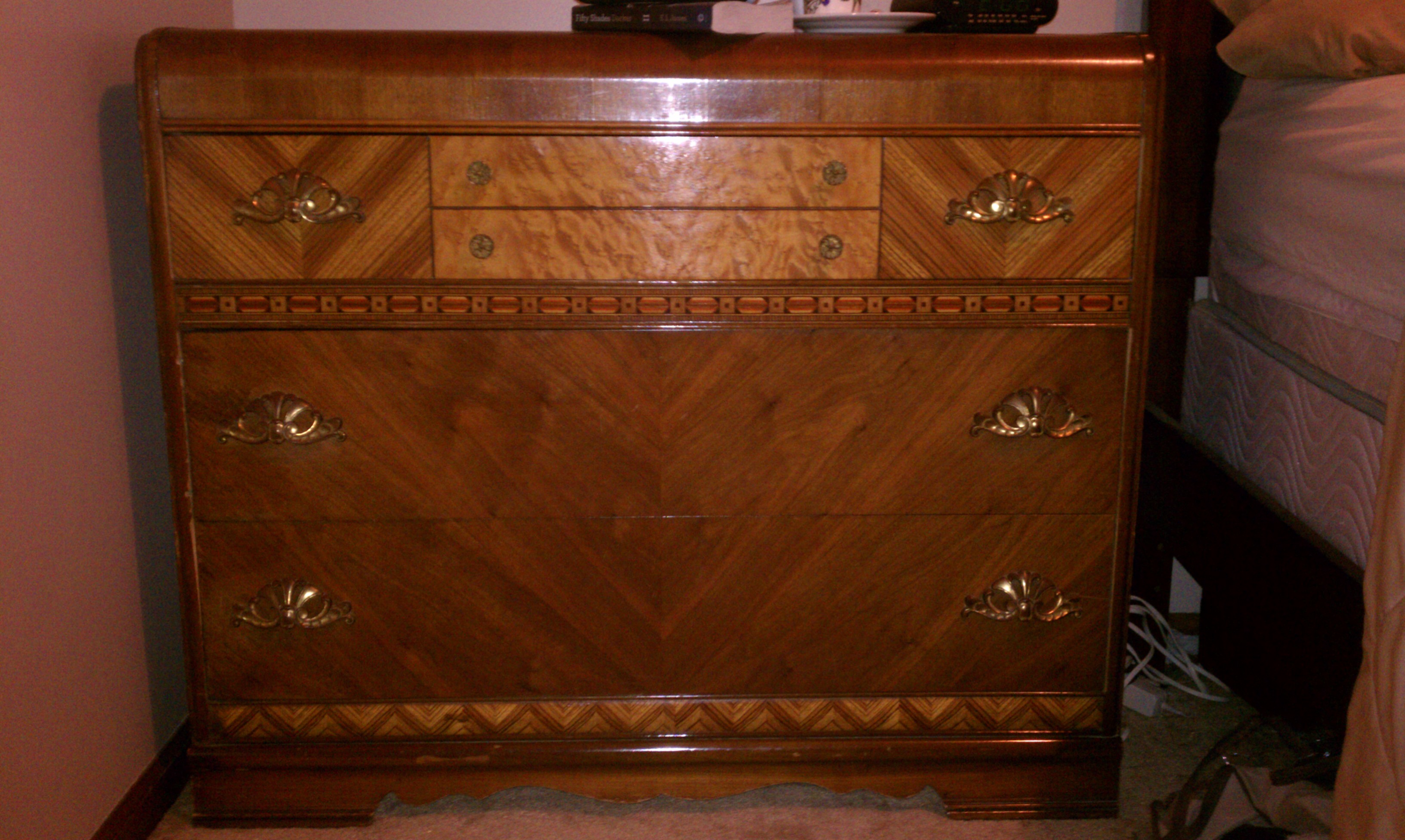 I was given some old vaneer furniture from my grandma. It consists of an armoir, dressor, vanity and night stand the pictures don't include the mirrors on vanity, dressor or armoir, maybe 1930ish