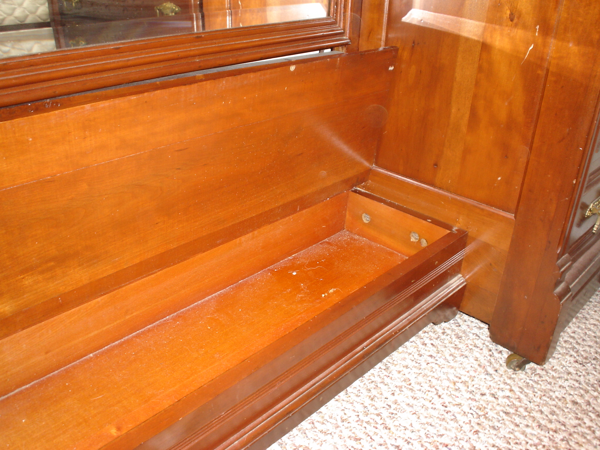 bottom center of piece has an enclosed compartment. Top draweres on each pedestal have a locking device. I have key.