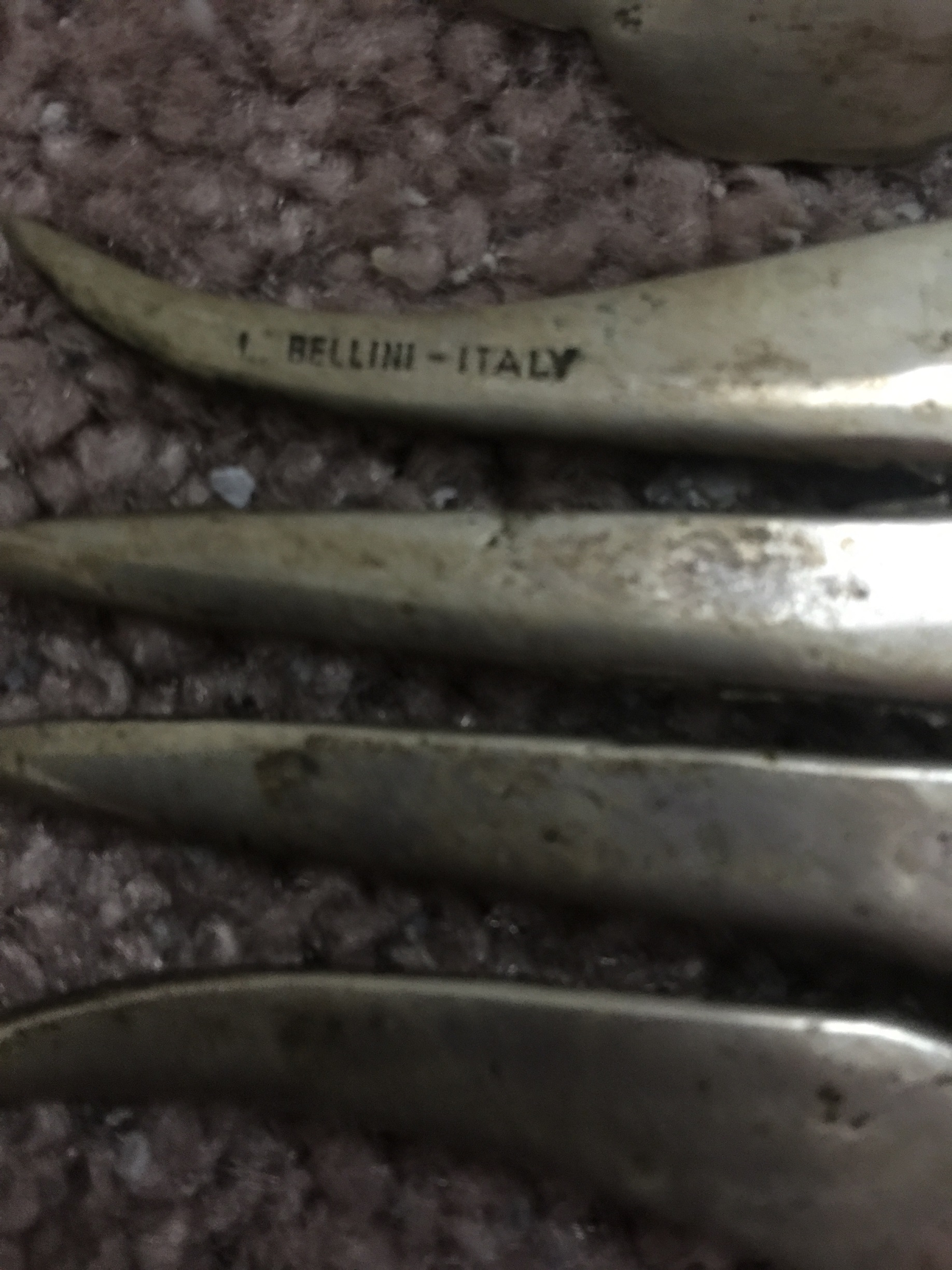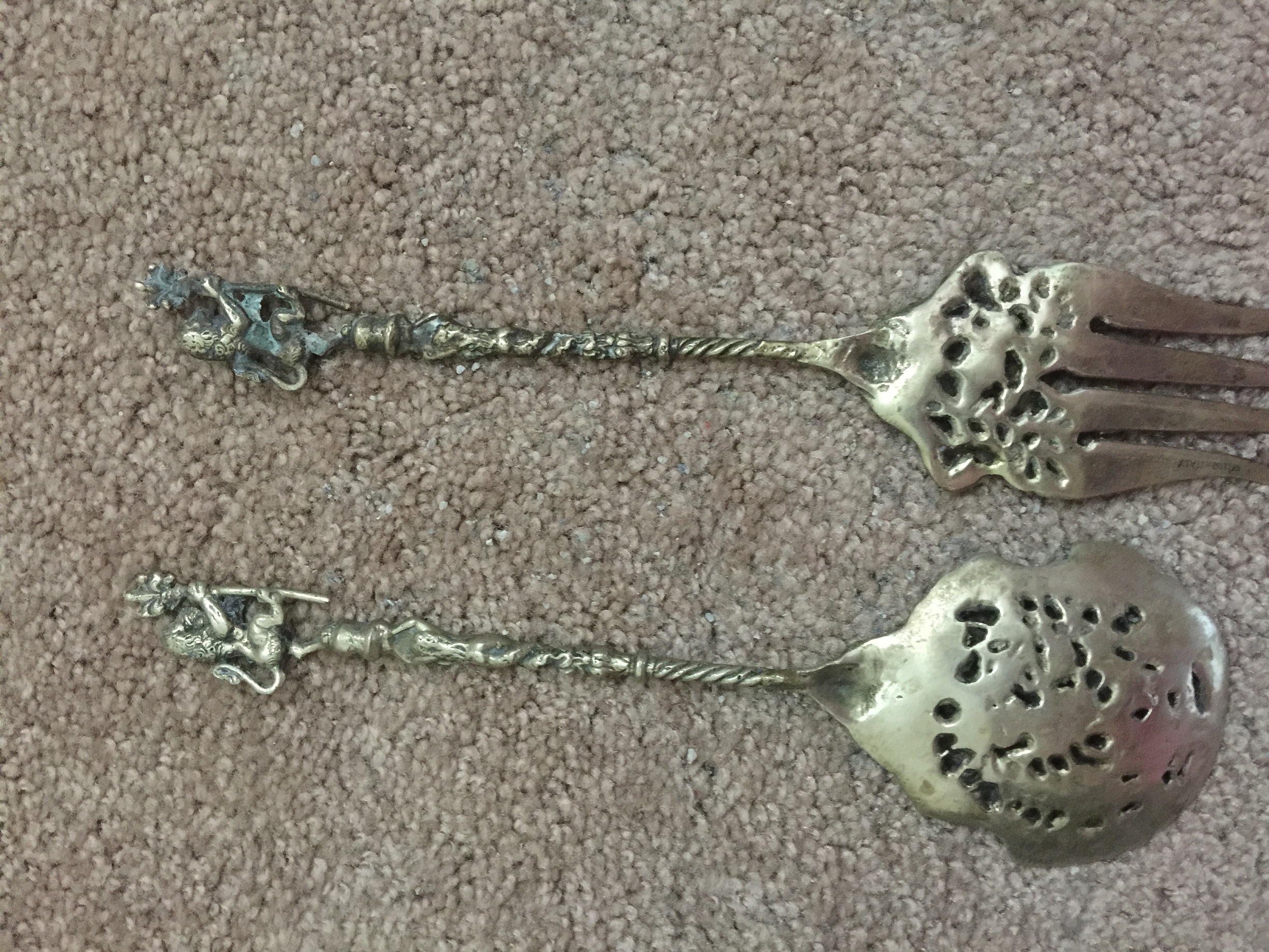 We are wondering what material the fork and spoon are made of and what year they were made. We could not find an exact match online and would love some help. Also, obviosly we would love to know the value. Thank you in advance!