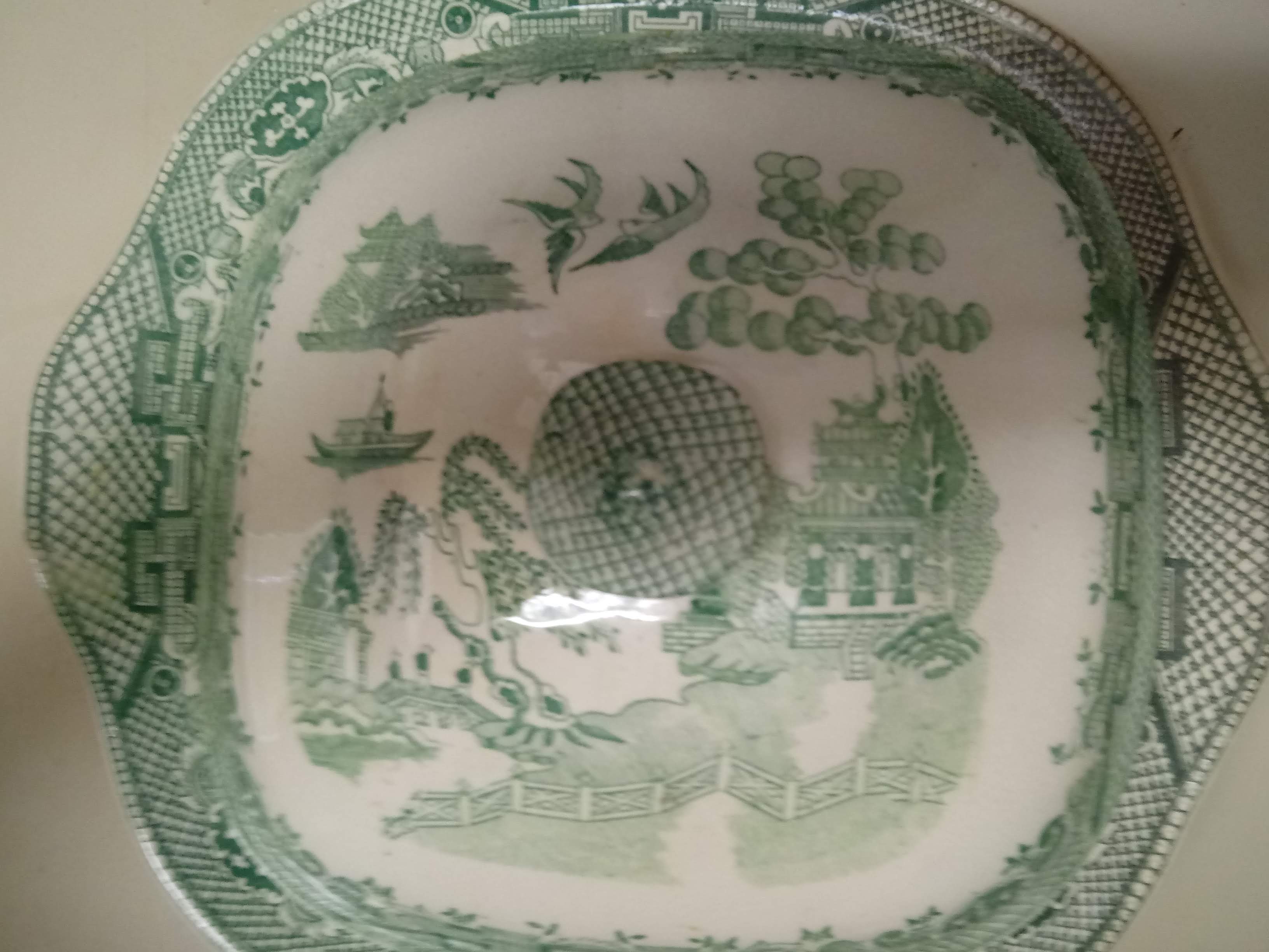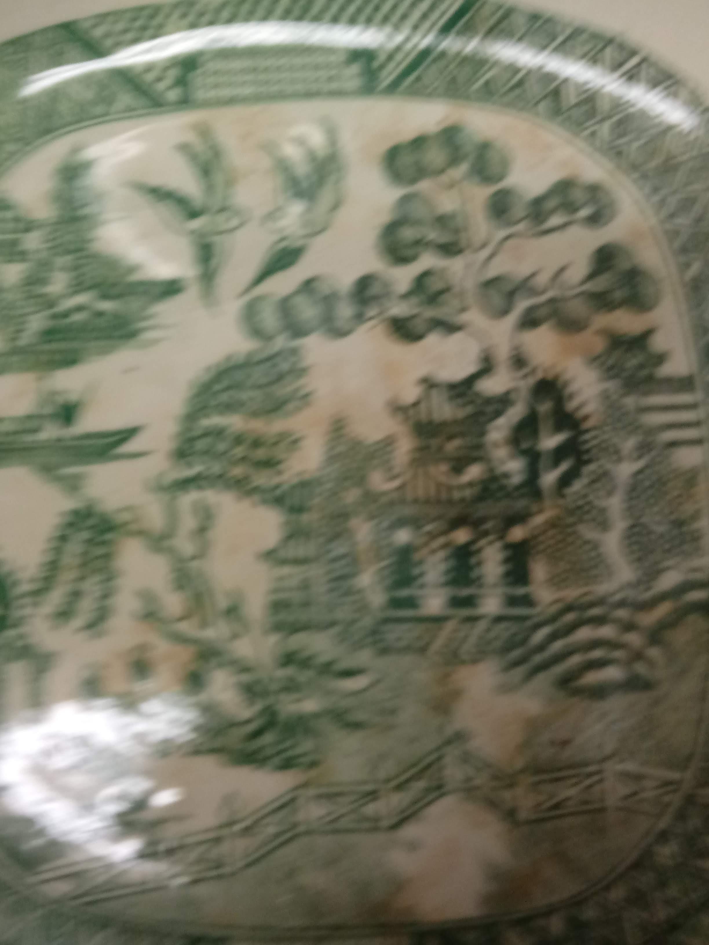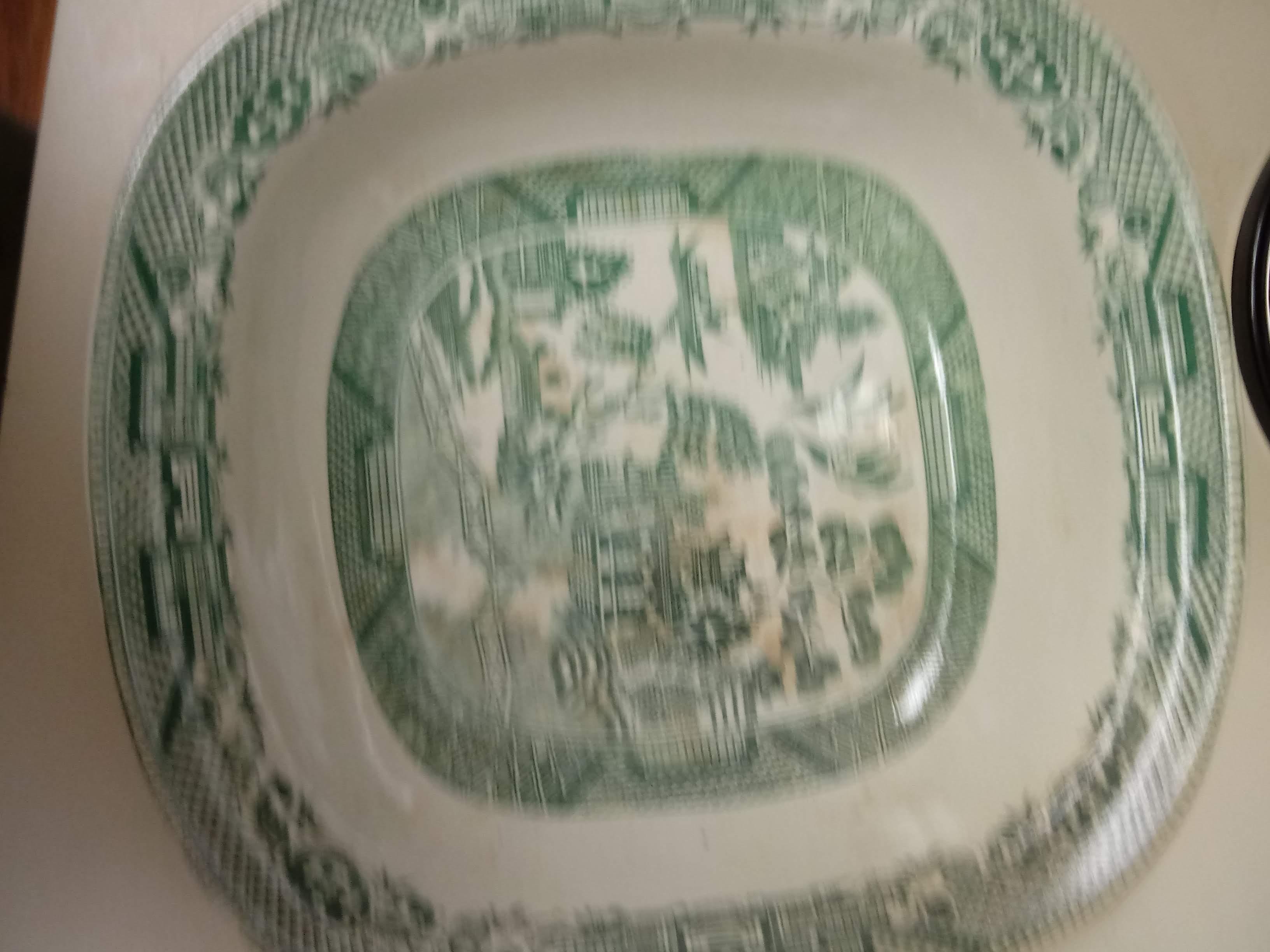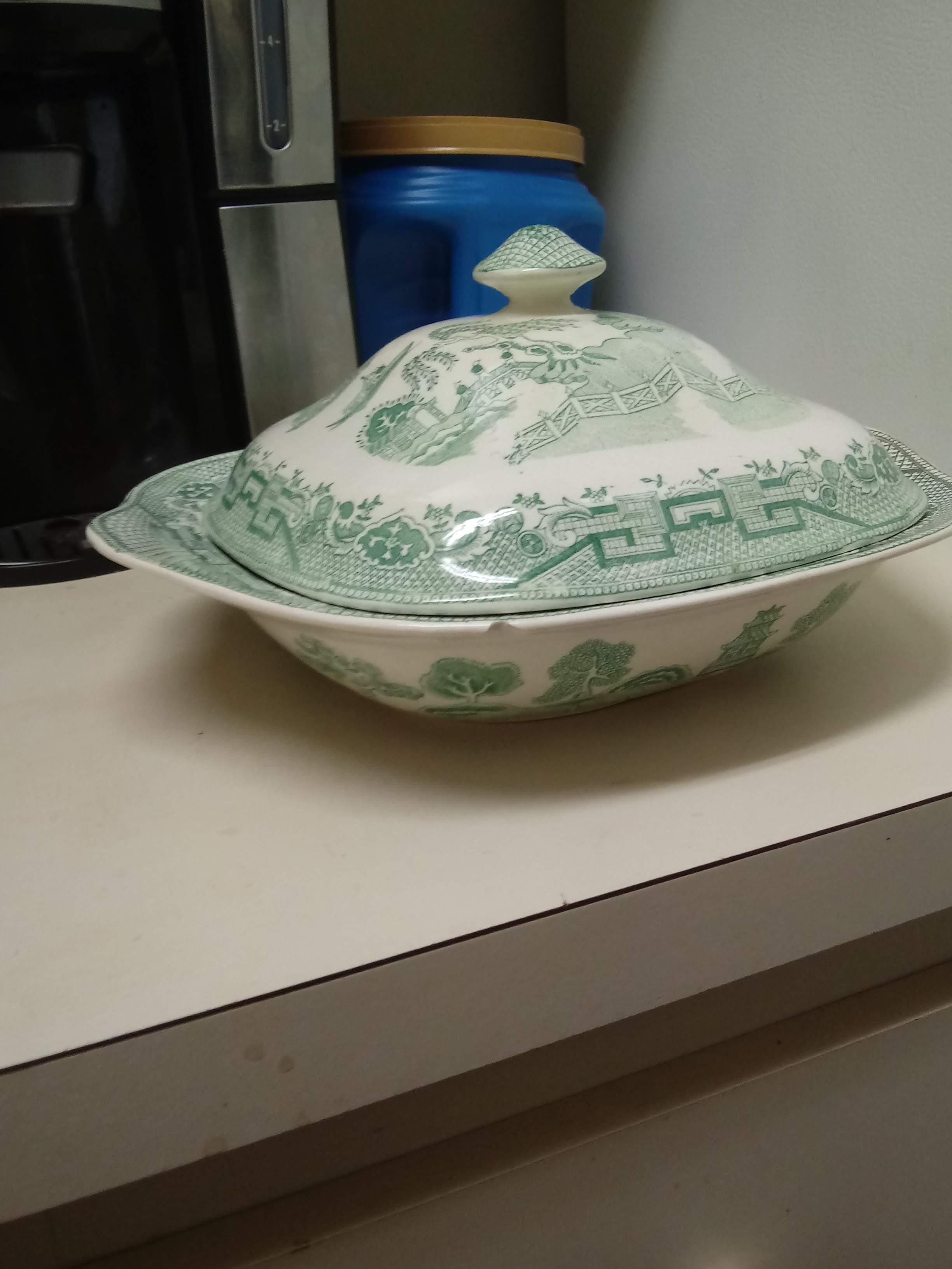This is a Vegetable Serving Dish that belonged to a very dear friend of mine who passed away in 2015 and I believe her Father brought it home after being stationed over seas. It is Green and White as opposed to the Blue and White that Blue Willow is usually seen. Bennett Blue Willow Ware is stamped on the bottom of the dish. I'm interested in finding out it's age and the value if possible. Here are the pictures and I can send more if necessary.