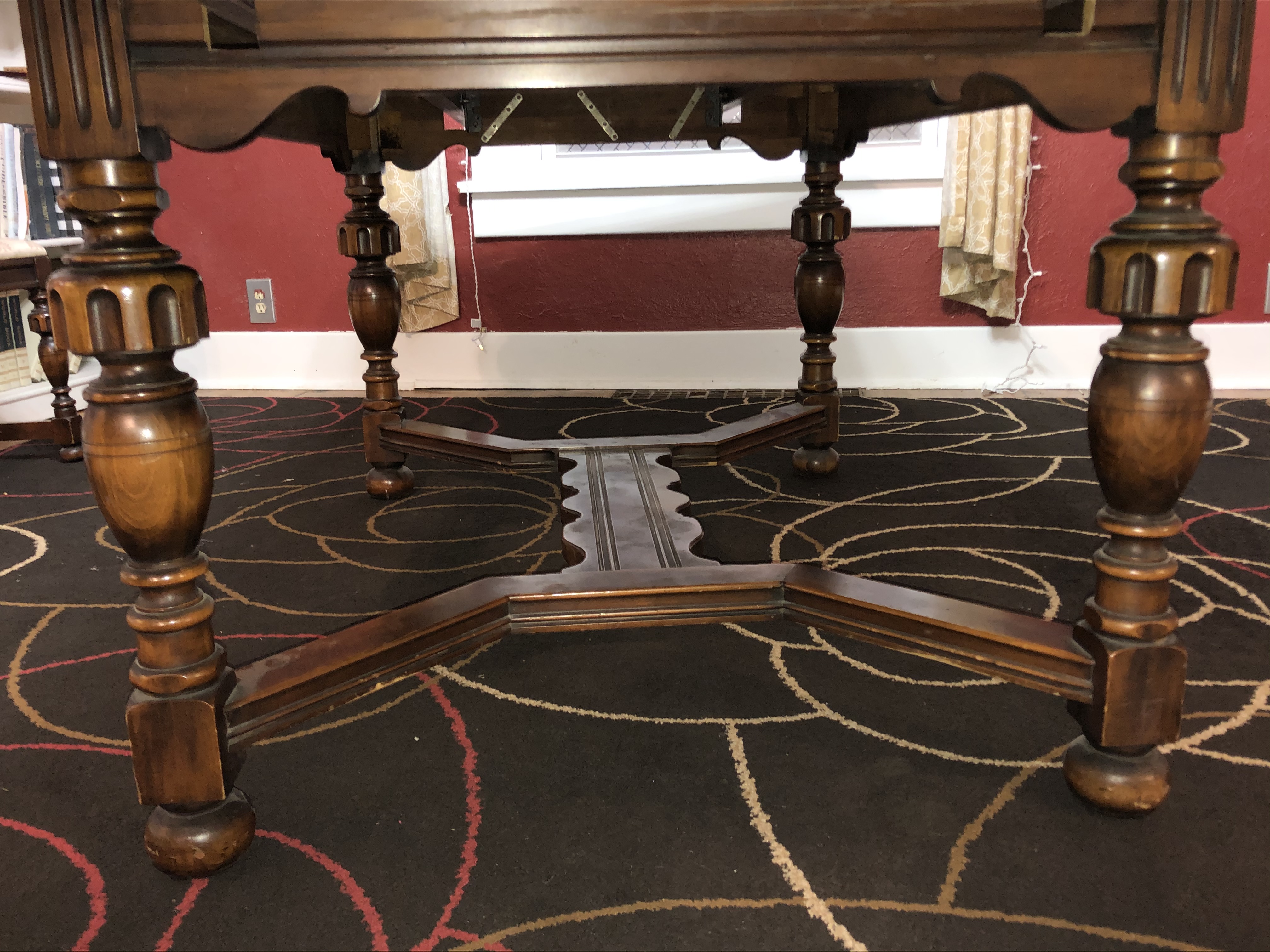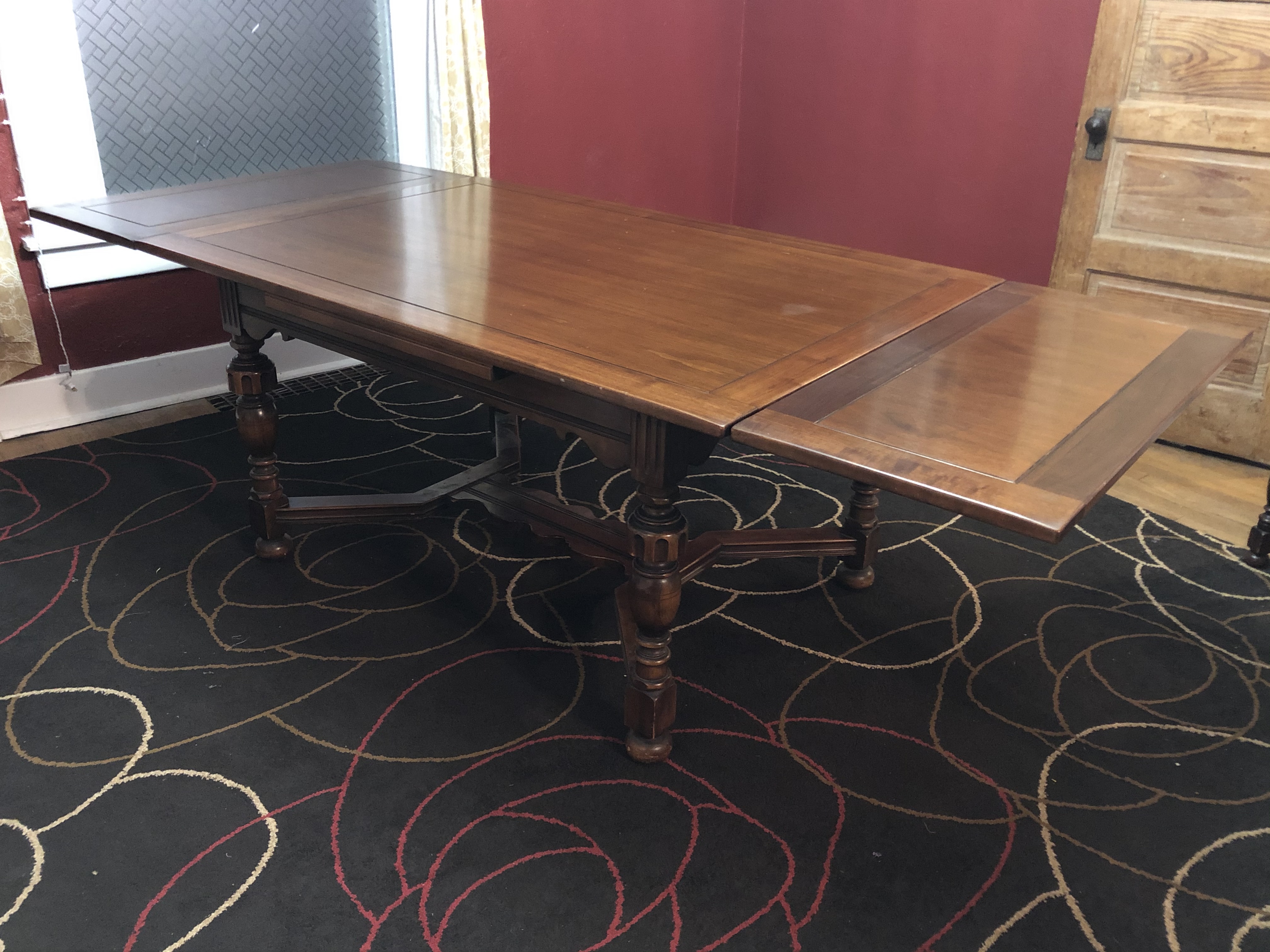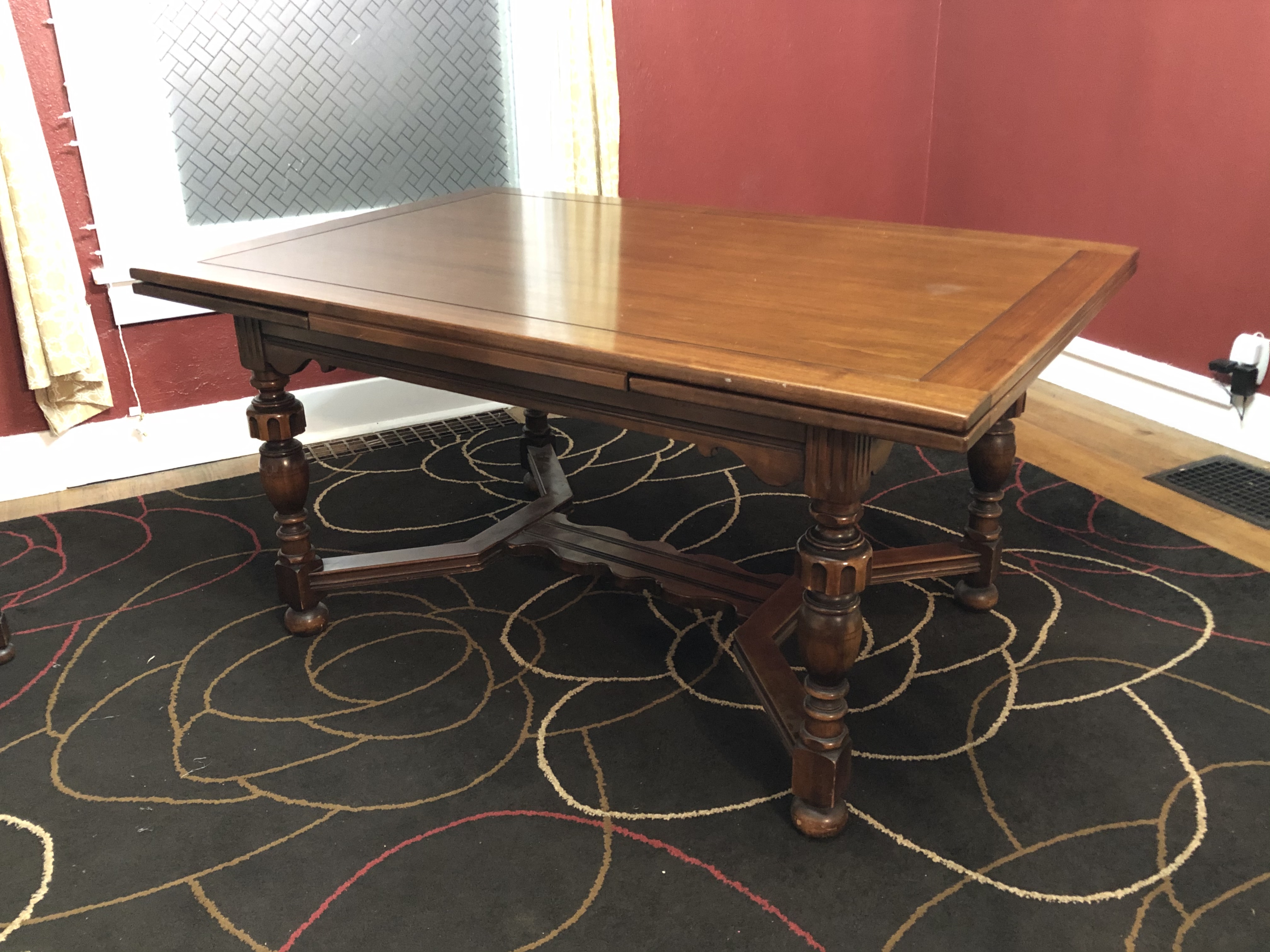 Berkey & Gay dining table and chairs. Solid walnut table, 5'x3'4", expandable to 8' in length with pull-out end leaves. 4 standard chairs and 2 captain's chairs. Serial number 2030 stamped into table.