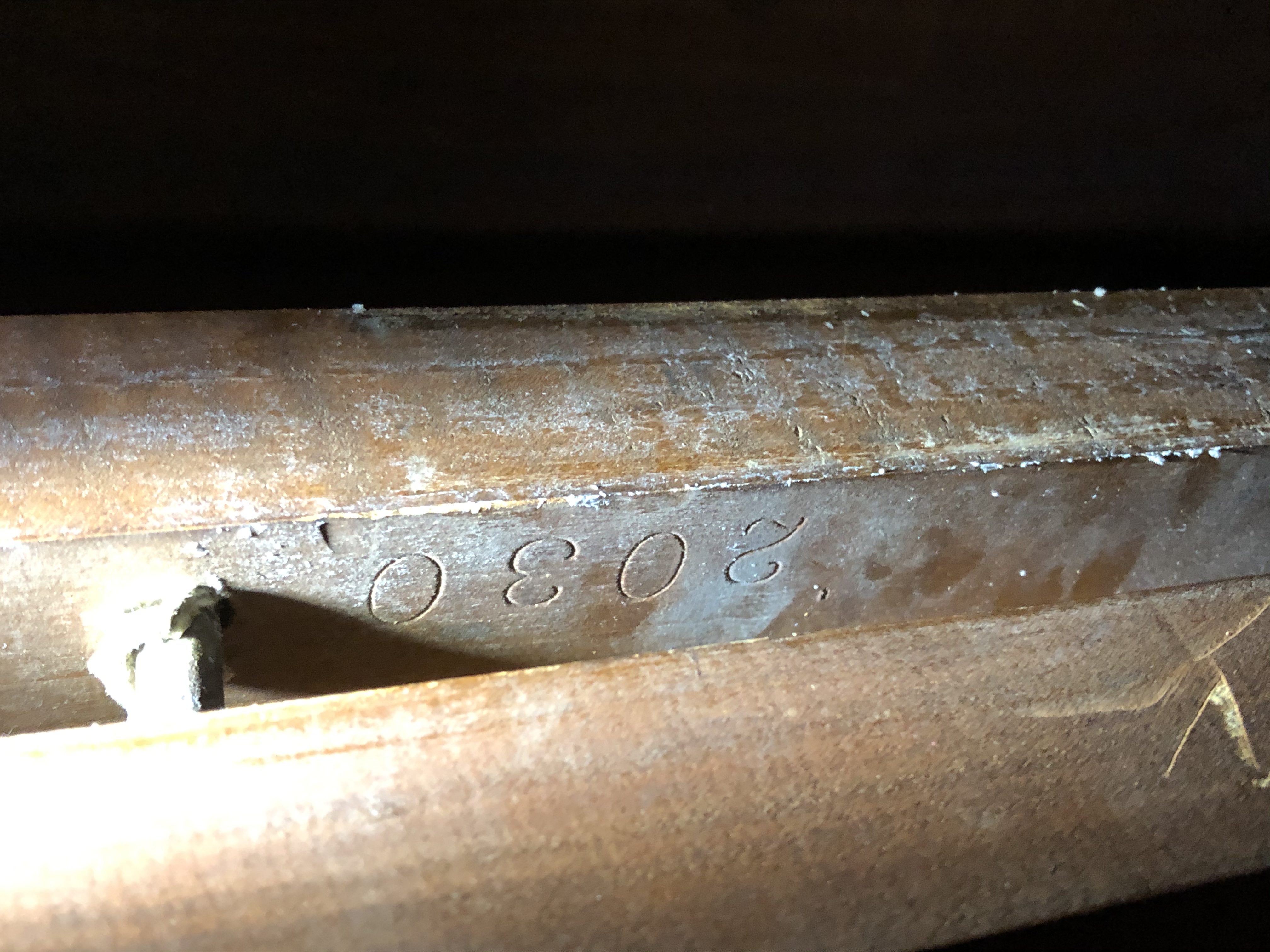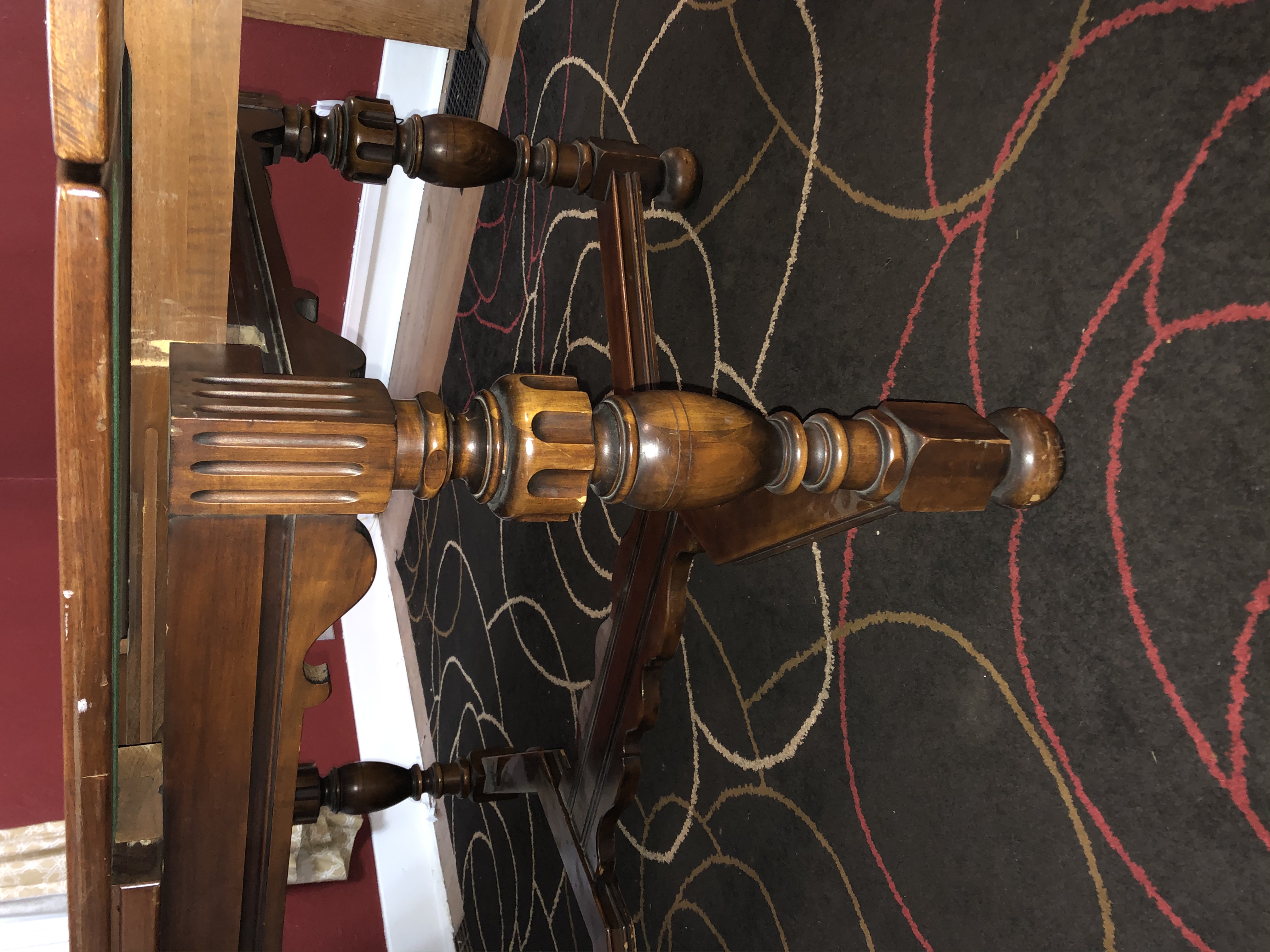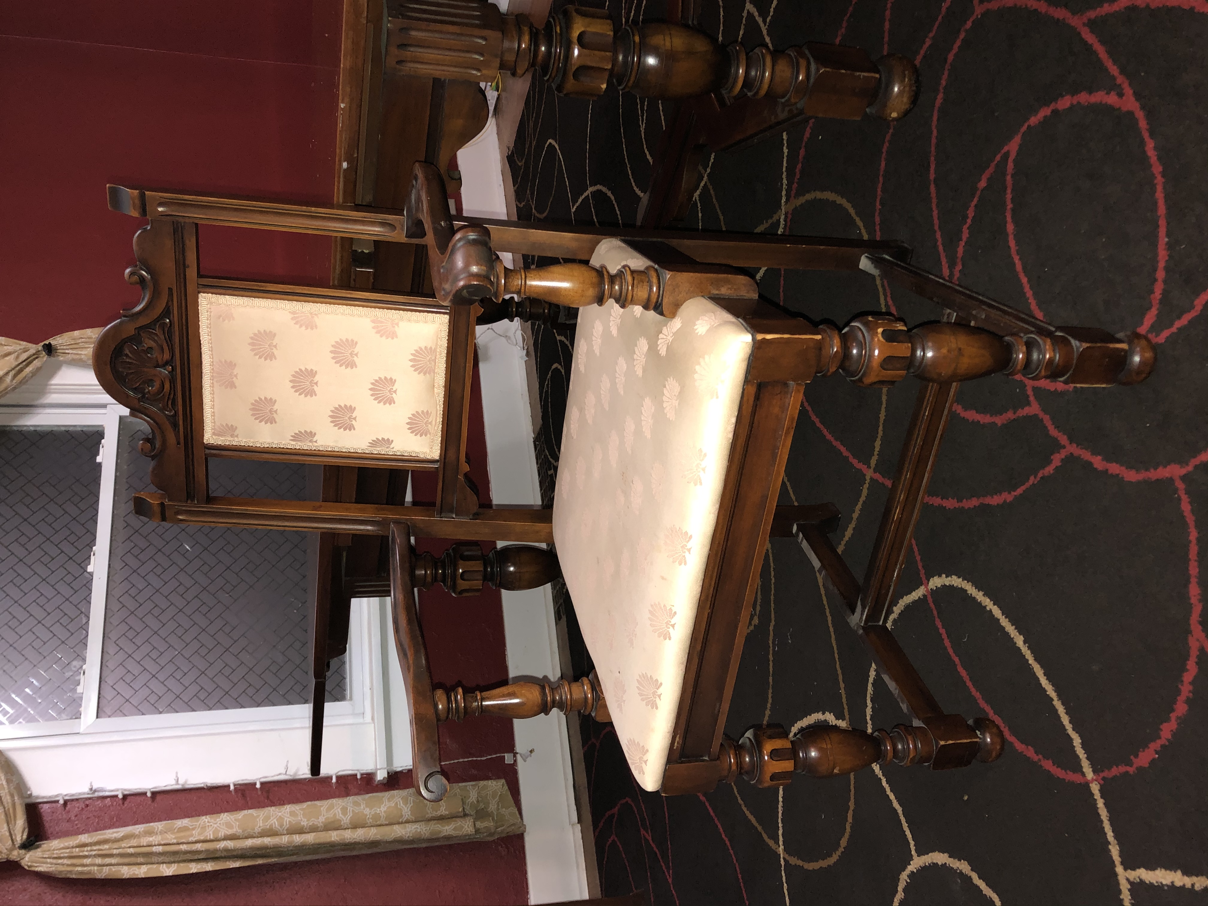 Berkey & Gay dining table and chairs. Solid walnut table, 5'x3'4", expandable to 8' in length with pull-out end leaves. 4 standard chairs and 2 captain's chairs. Serial number 2030 stamped into table.