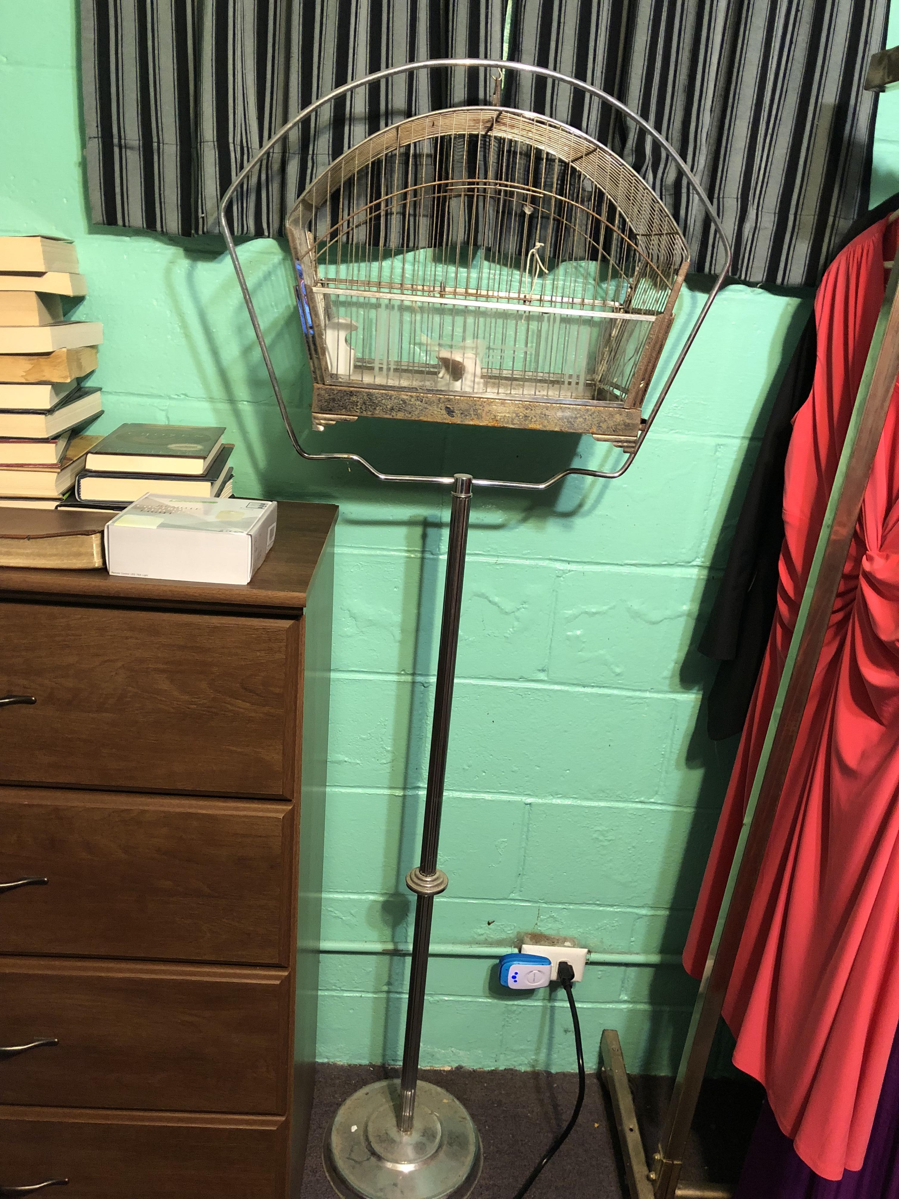 Silver wire bird cage on pedestal stand. Includes ceramic water and feeding containers. It is made by Crown Products Indianapolis IN