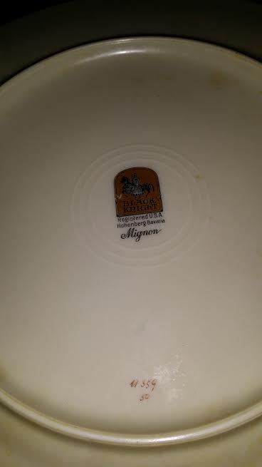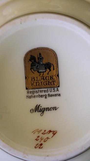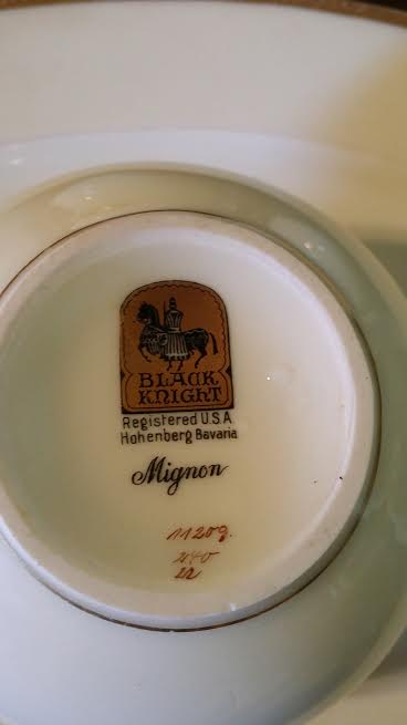 Attached are photos of Chinaware and their corresponding numbers submitted for your pricing appraisal and possible sales if you are interested in buying. They are all manufactured by Black Night/Mignon. There are a total of 34 various sized plates and saucers, 6 bowls, 2 cups, 1 spouted server, and 2 sugar type bowls with lids.  Please let me know their sales value.