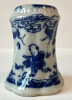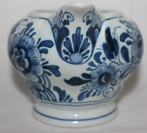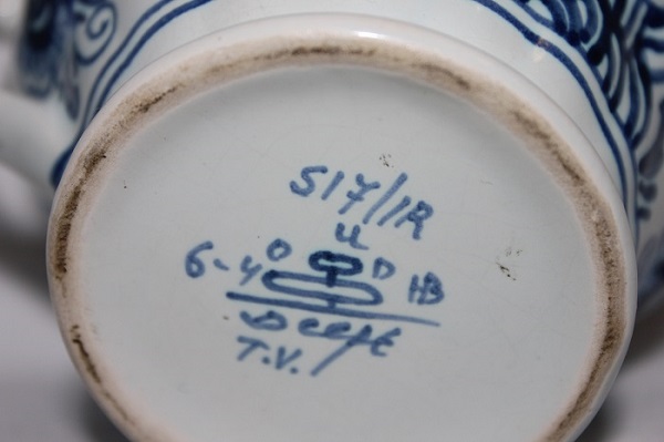 I found this creamer at my local goodwill store. The creamer appears to be porcelain and it has blue flowers and leaves handpainted on it. On the underside of the creamer there is some information written down: "S17/1R" at the top followed by a picture with numbers and letters surrounding it (factory mark?) underneath. To the right of the picture there are initials, an H that connects with a B. Under the picture it looks like the word "delft" is written and then under tha, the initials "T.V." are present. All of this writing is in blue .Any information about this creamer would be extremely helpful and appreciated!