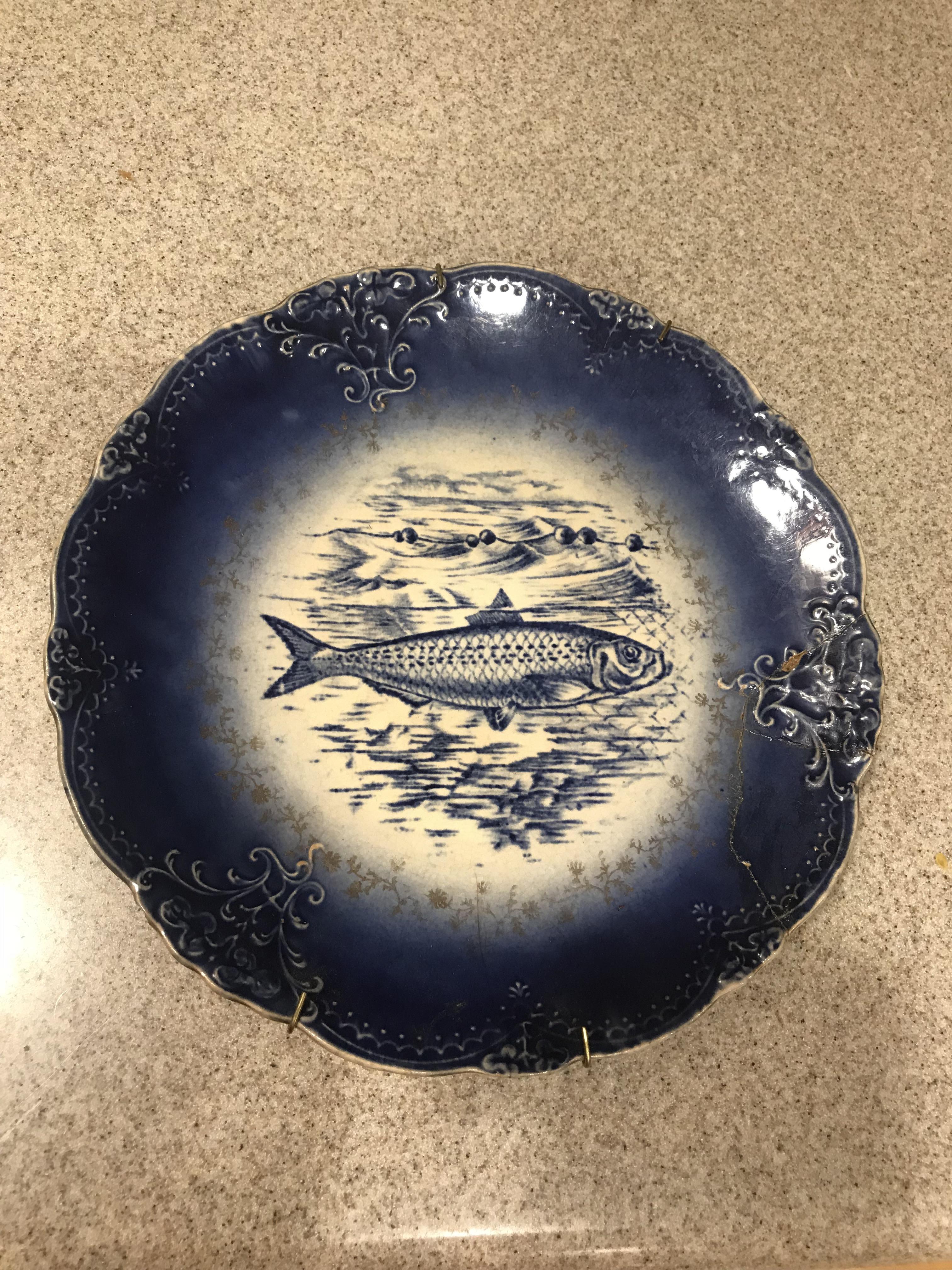 I have a blue plate that belonged to my mother's grandmother. She was born in the 1870's or 1880's. My mother was told the plate was from colonial times and my mother's family can trace their relatives back to the Mayflower. This plate measures 8.5" in diameter.There is a stamp in the middle of the back but I can't make out what it is. It has one crack that has been repaired. It is somewhat noticeable on the front and very noticeable on the back. It has a spring plate holder on it and I am wondering if I should try to remove it or just leave it in place. I would appreciate any thoughts on it's history and value. Thank you.