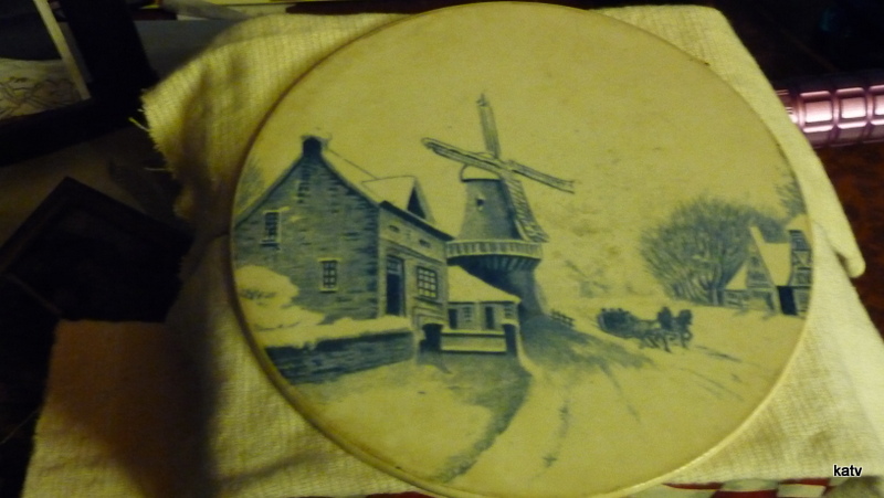 Aged plate with Blue & white Dutch Windmill scene on it.