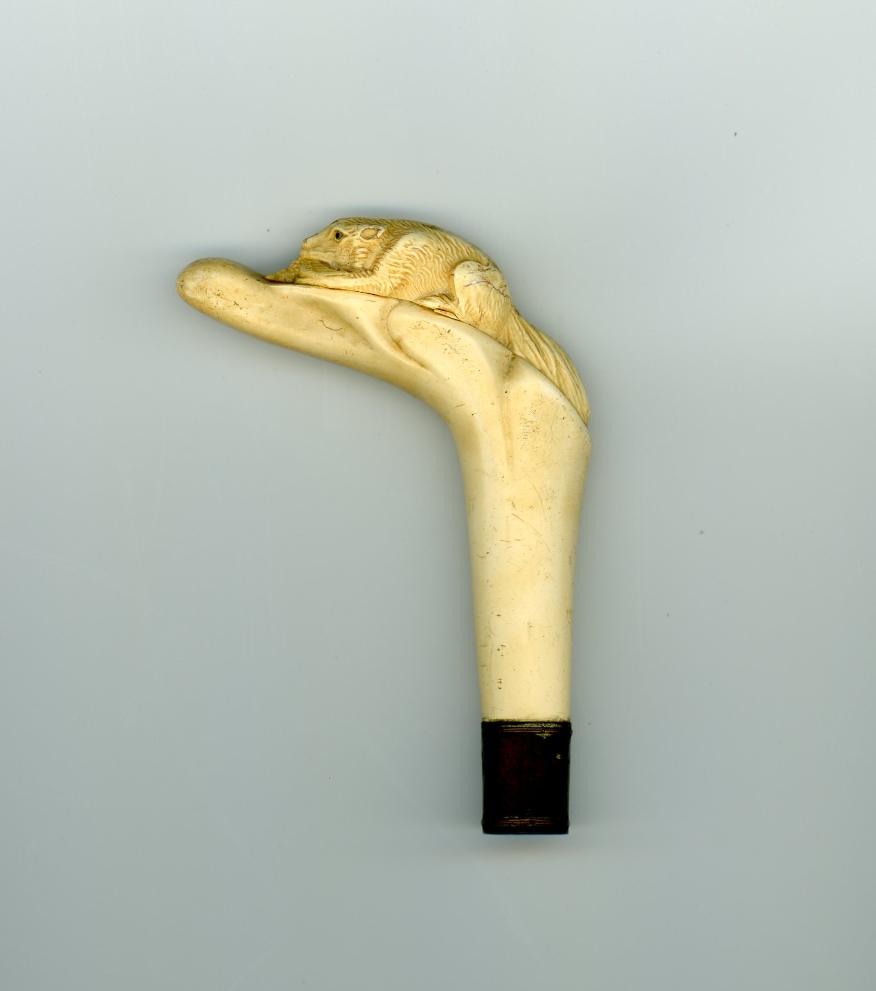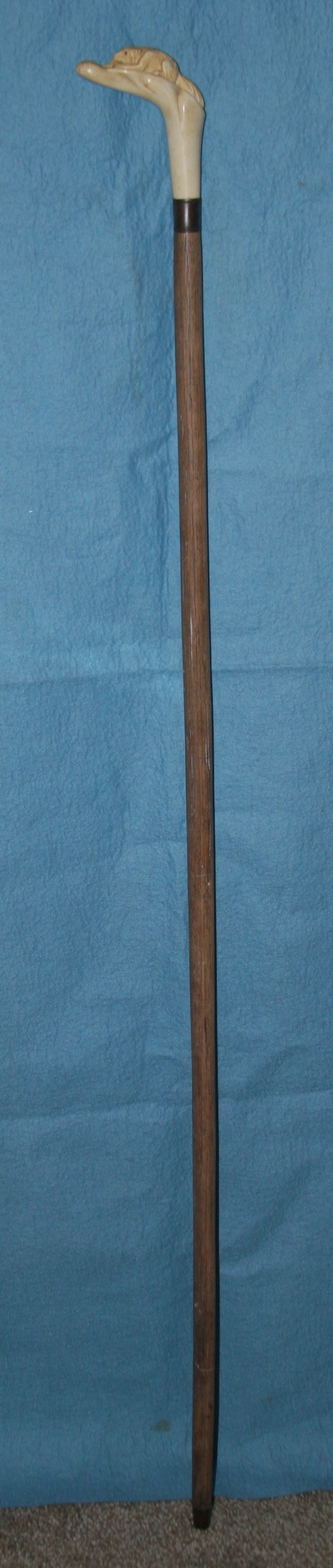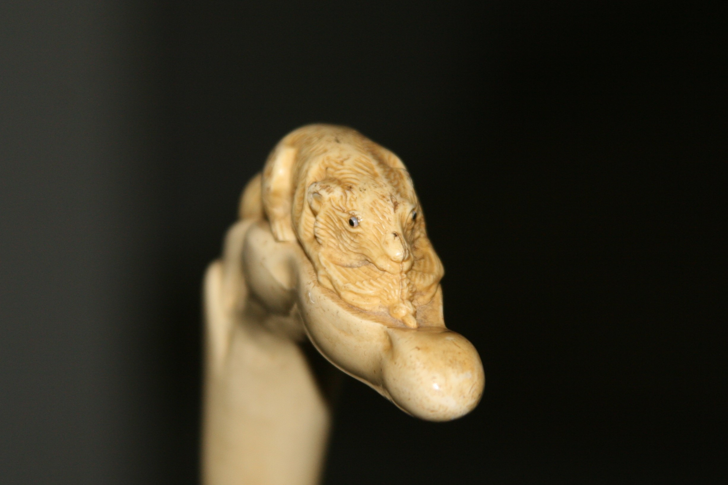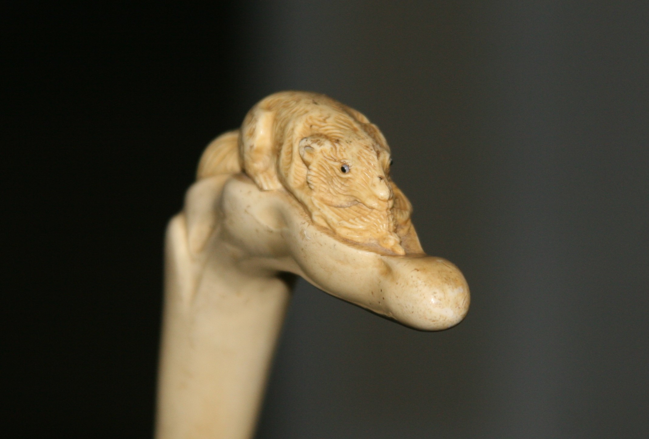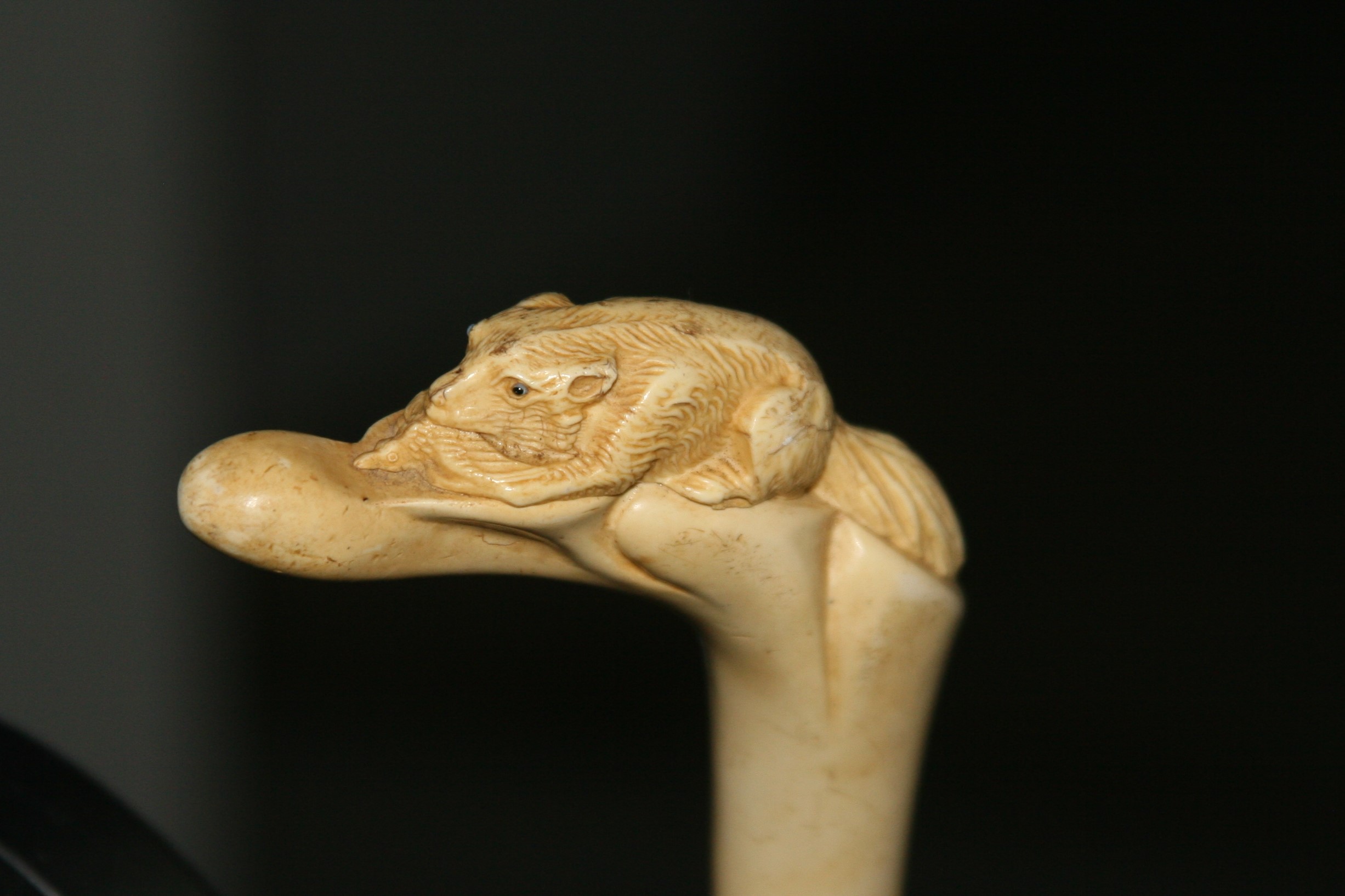 This is a walking stick that I have had for many years. It has been sitting in the back of the closet. I asked my jeweler about it but all he could tell me that it was bone and very interesting. I would like to know something about the history and worth. The handle appears to be either a fox or wolf with a bird in its mouth.