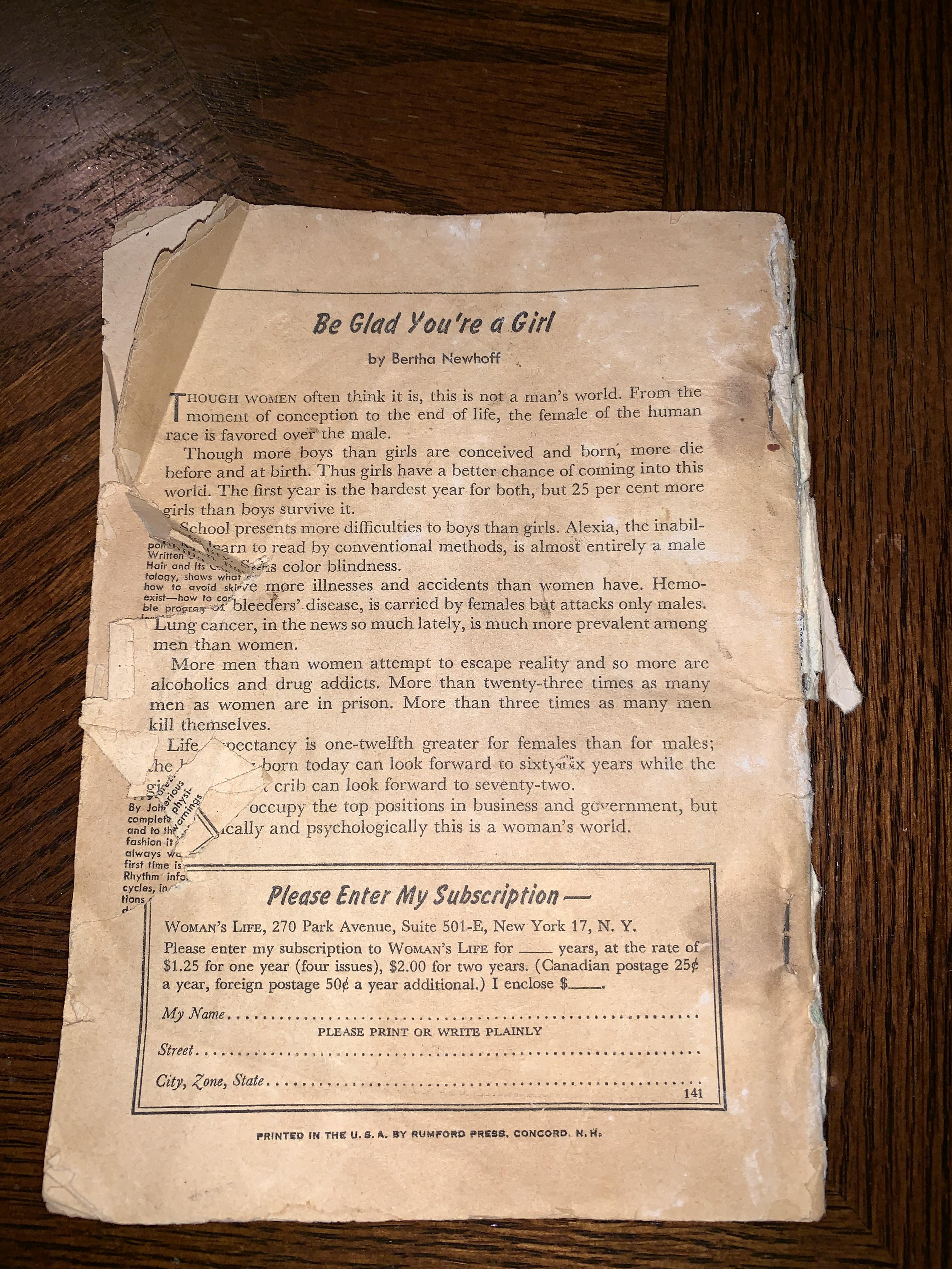 This book, Woman's Life, written in 1956, contains various stories of a womans everyday life. Additionally, this book is a guide for women and teaches them how to cope with every day life. Essentially, the stories told in this book varies differently from todays norms and values.