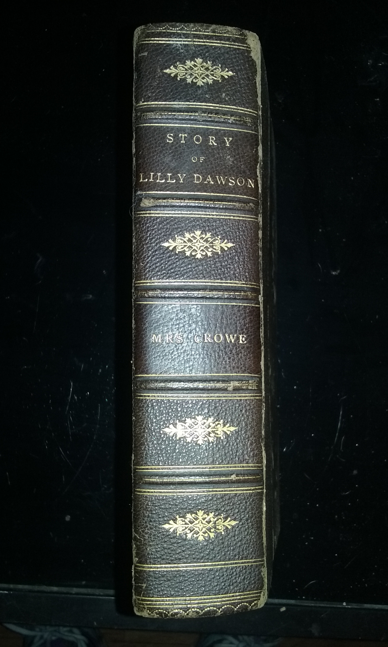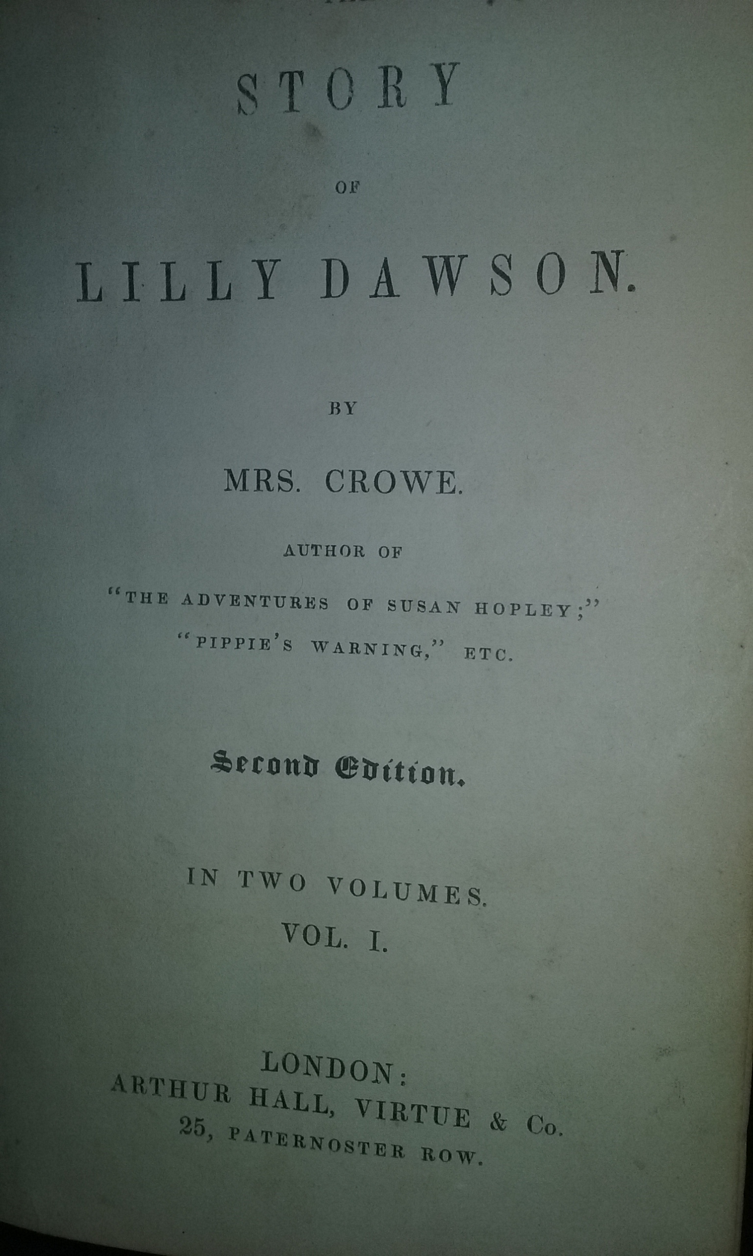 Leather bond book, 2 volume book.  Written by Catherine Crowe.  The book is a second edition published Arthur Hall, Virtue & Co. of London 25 Paternoster Row. The title is The story of Lilly Dawson.