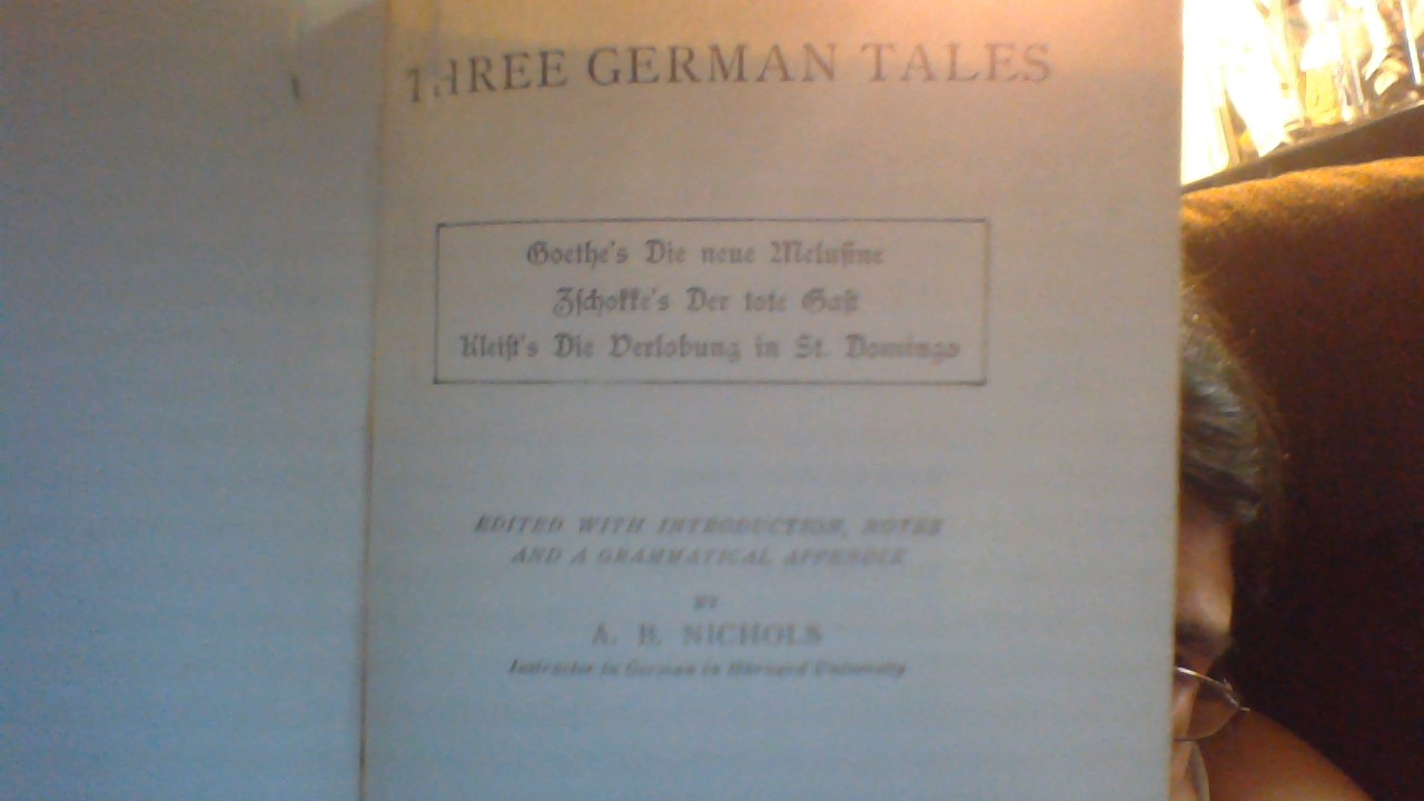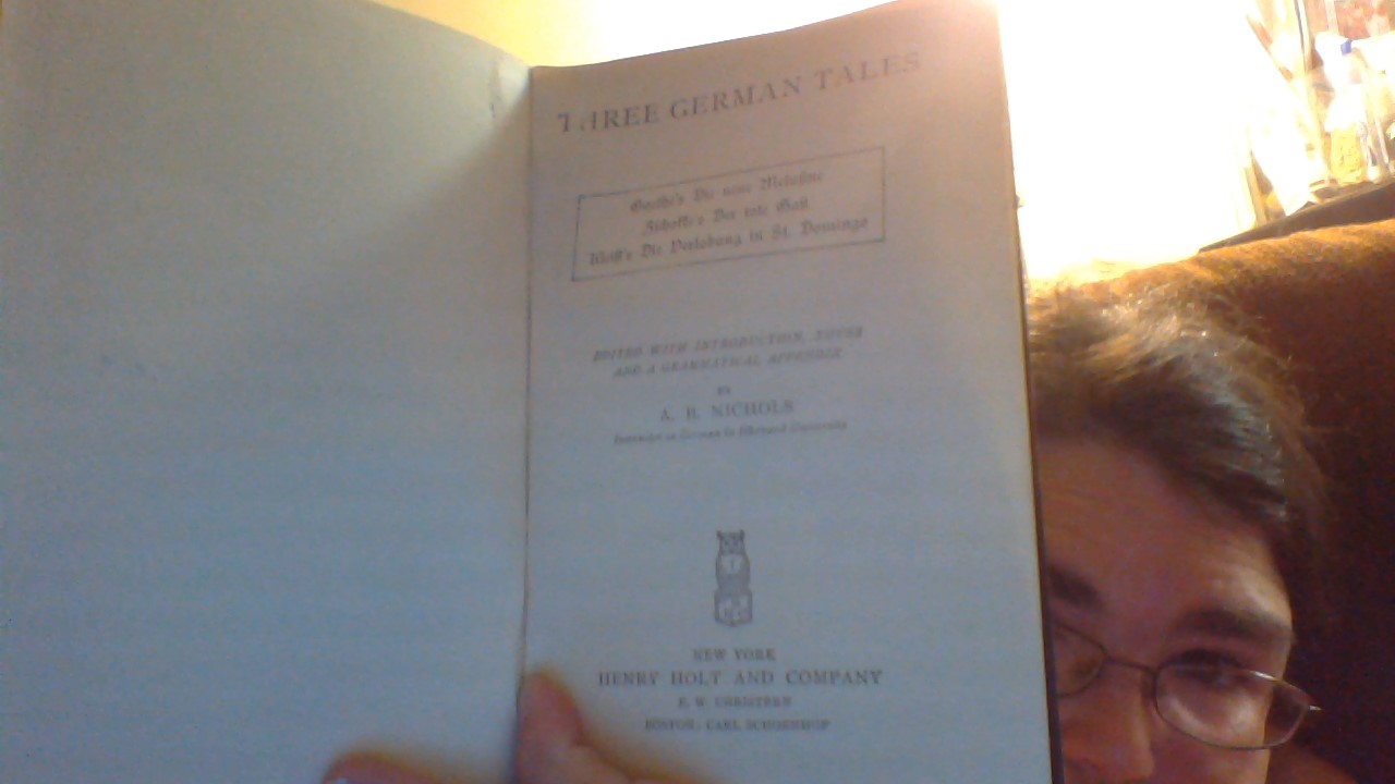 I came by this book quite by accident. Someone had dropped a box of books off at the library in the building where I live for free and I happened on this book when going through the box to put the books away. It is Titled three German Tales by A.B. Nichols and is a first print published in 1895. it is in great condition. I wanted know alittle more about my book so that when people ask me about it I tell them.