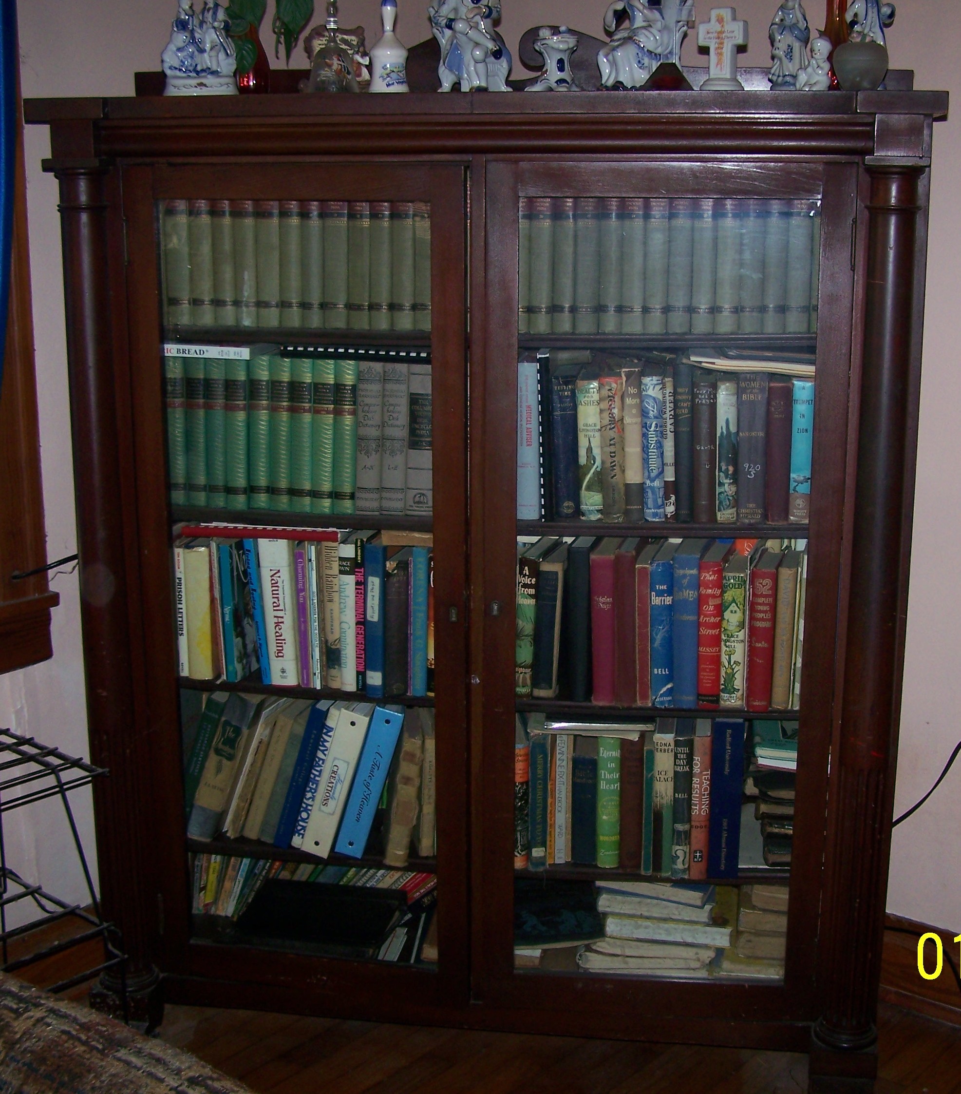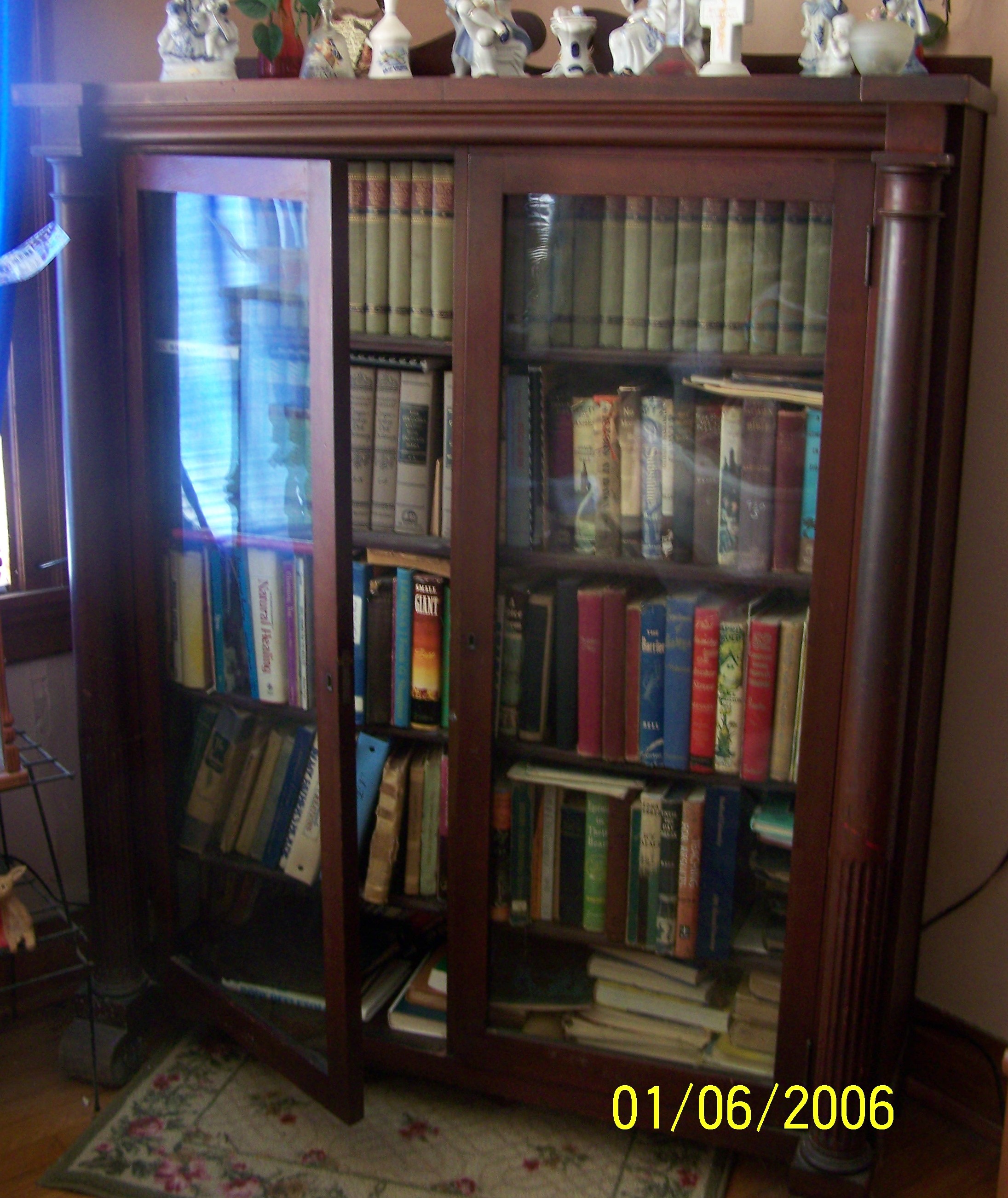 This bookcase belonged to my deceased mother. She was a school teacher and had this from her parents. She was 88 yrs. old when she recently passed. This is a solid wood furniture and is either cherry or mahogany. In very good condition.