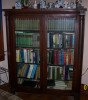 Antique bookcase/hutch. Probably mahogany. Bookcase has adjustable shelves and sliding glass doors (currently removed). 88 inches high, bookcase 48 inches wide, 11 inches deep. Bottom hutch is 50 1/2 inches wide, 17 inches deep, 18-20" high.