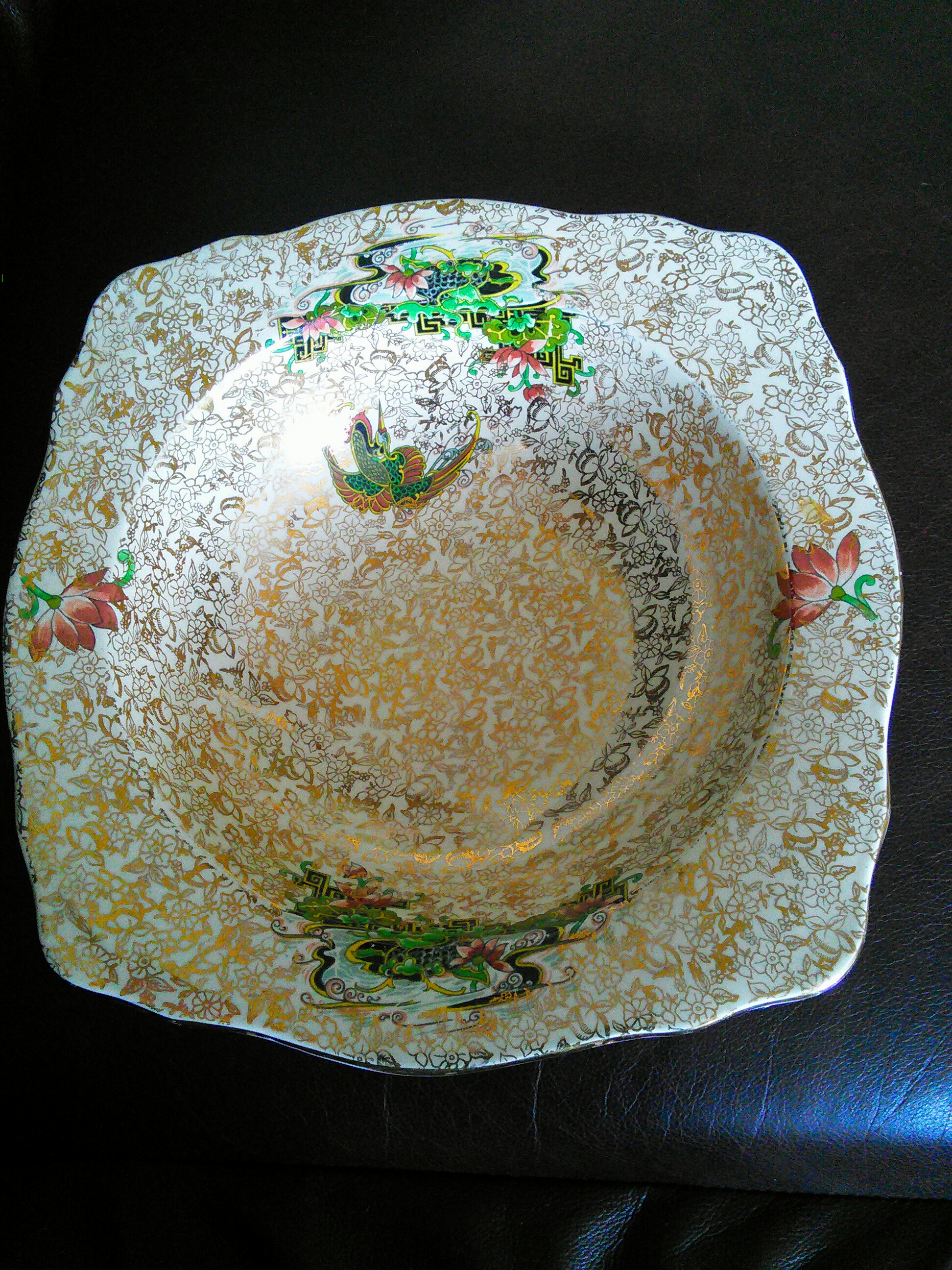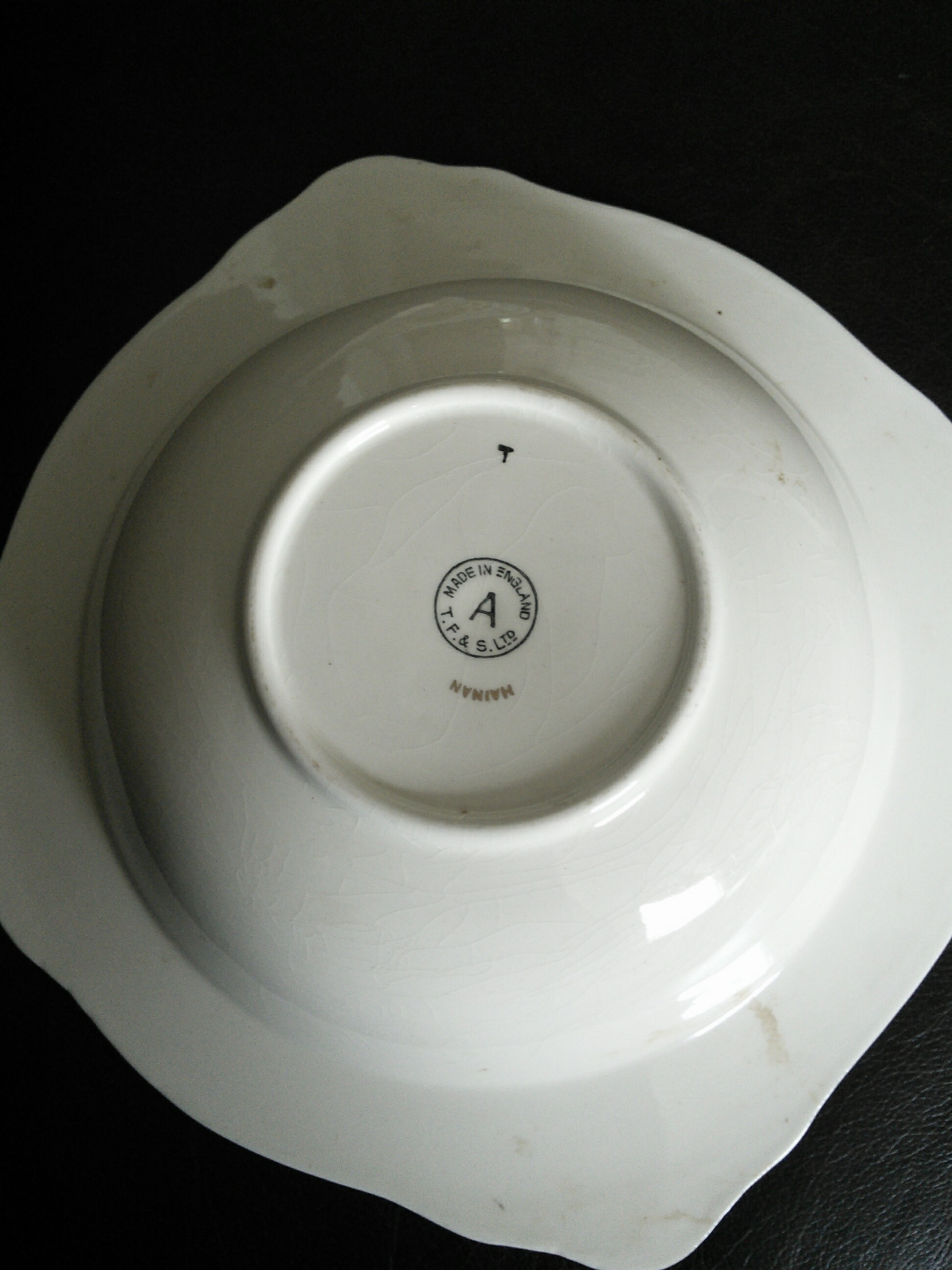 Fruit bowl, circa 1946, gold inlay pattern. T.F. & S. Ltd. and the word 'HAINAN' in gold stamped on the base. Small chip under lip.?