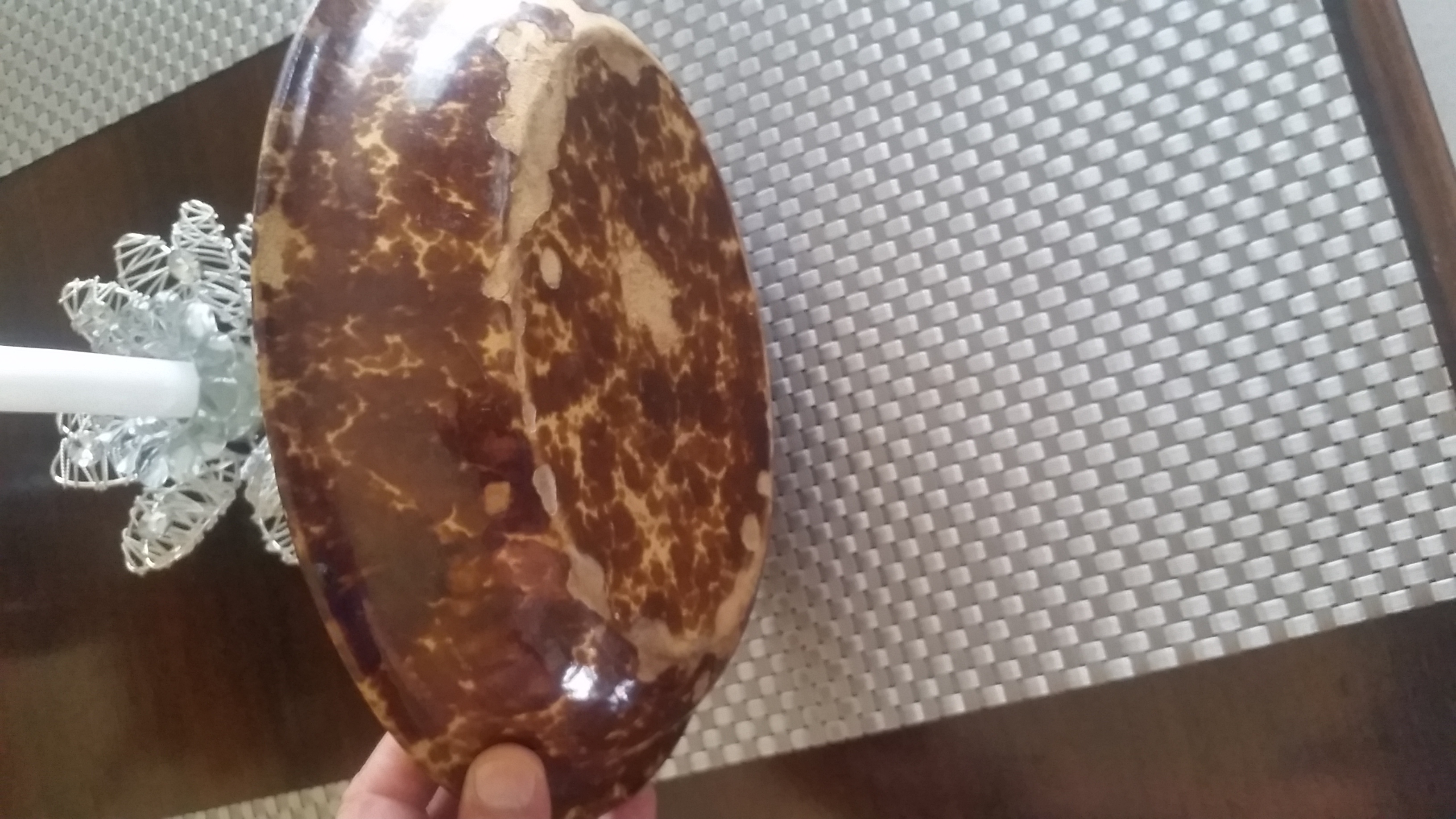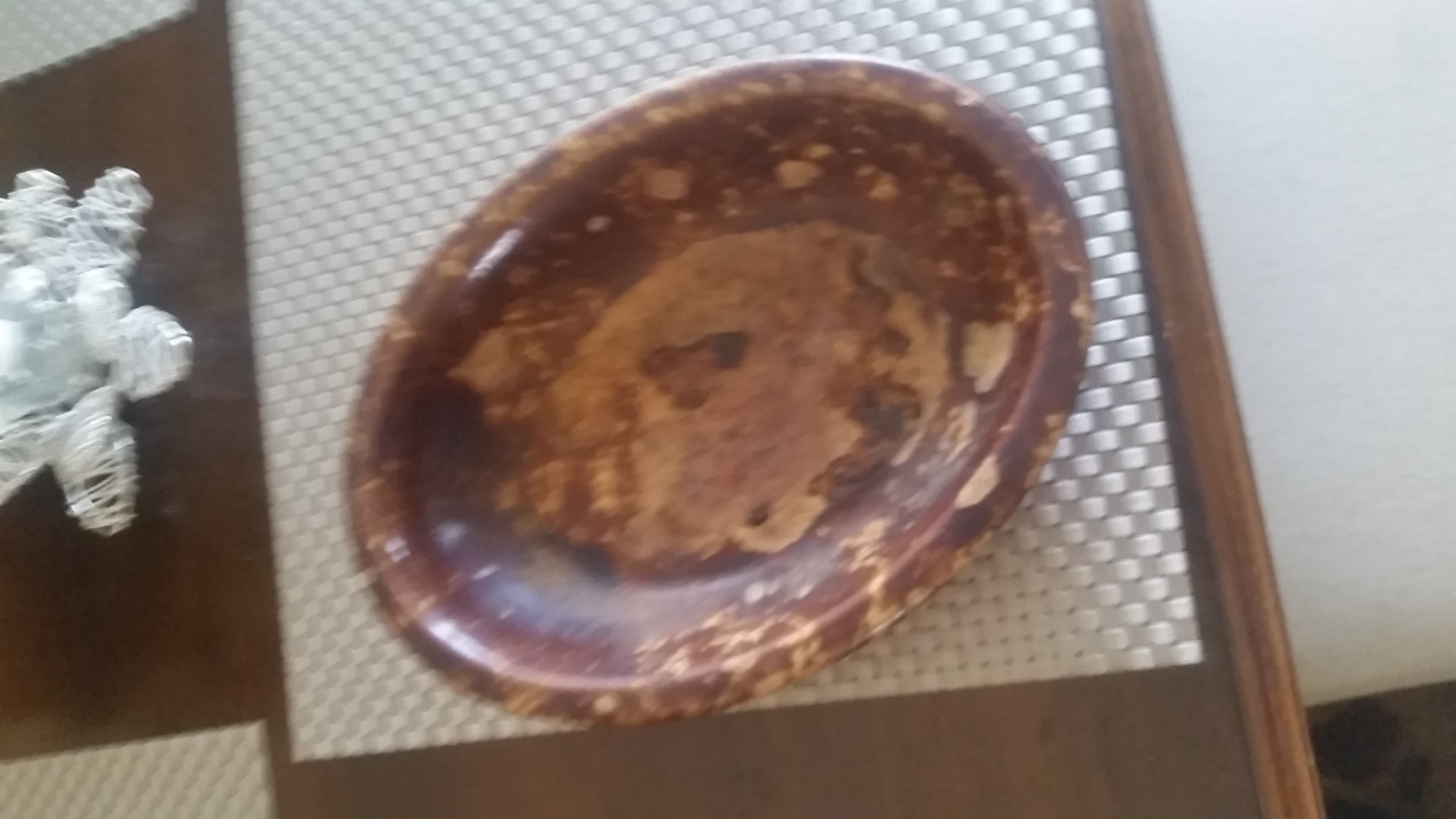 This is a very old dish that is in very good condition not for sure what it is made from appears it could be pottery or some type of glass.