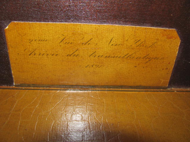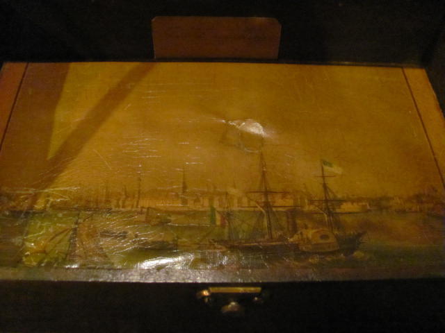 on inside cover there is a view of san francisco written in french, bottom of case has sailboats one has american and italian flags. there is a date of 1820 inside the box